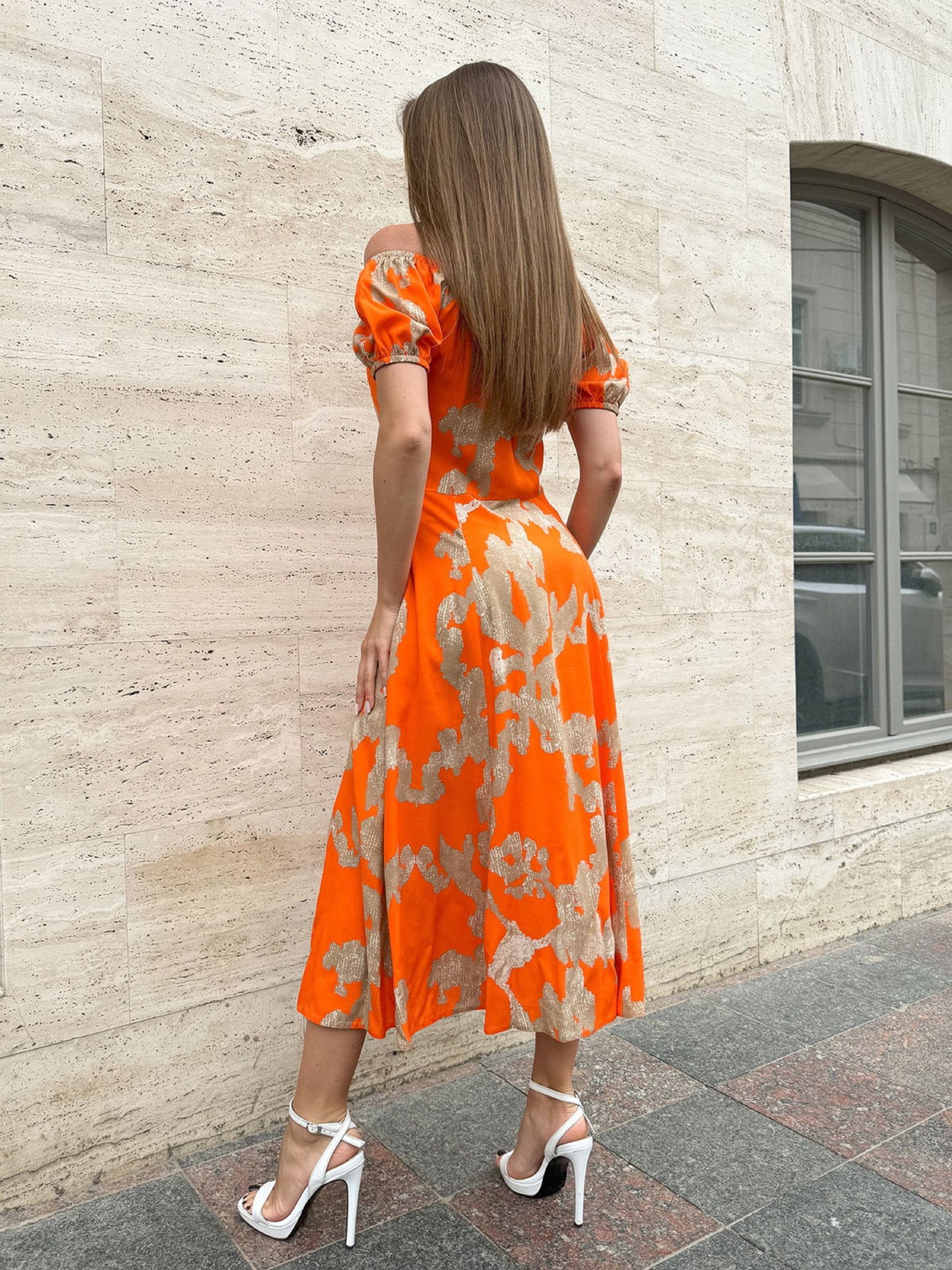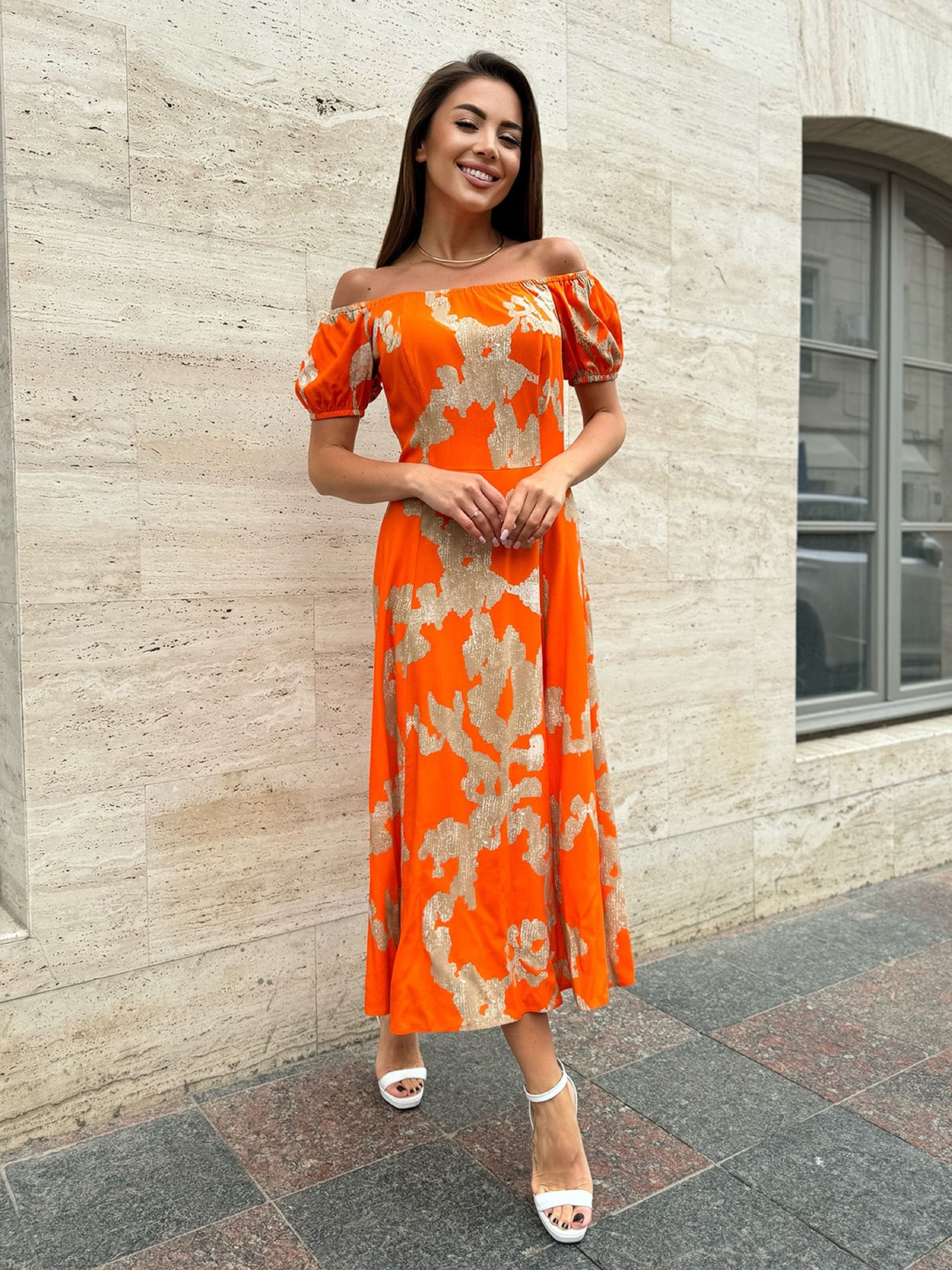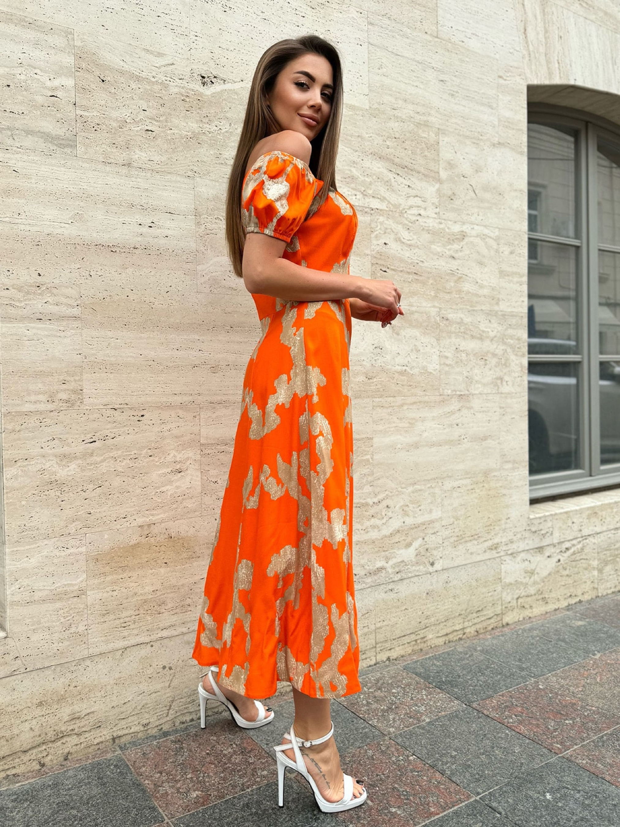 Хлопковое оранжевое платье с резинкой вдоль горловины и рукавами-фонариками короткой длины. Платье с приталенным кроем и боковой потайной молнией. Модель миди длины с расклешенным низом и боковым разрезом.Полуобхват: Грудь: S (42), M (44), L (46), XL (48), Талия: S (34), M (36), L (38), XL (40), Бедра: S (60), M (62), L (64), XL (66), Длина изделия - 116, Рукав - 17, Ткань: Низкой эластичности.