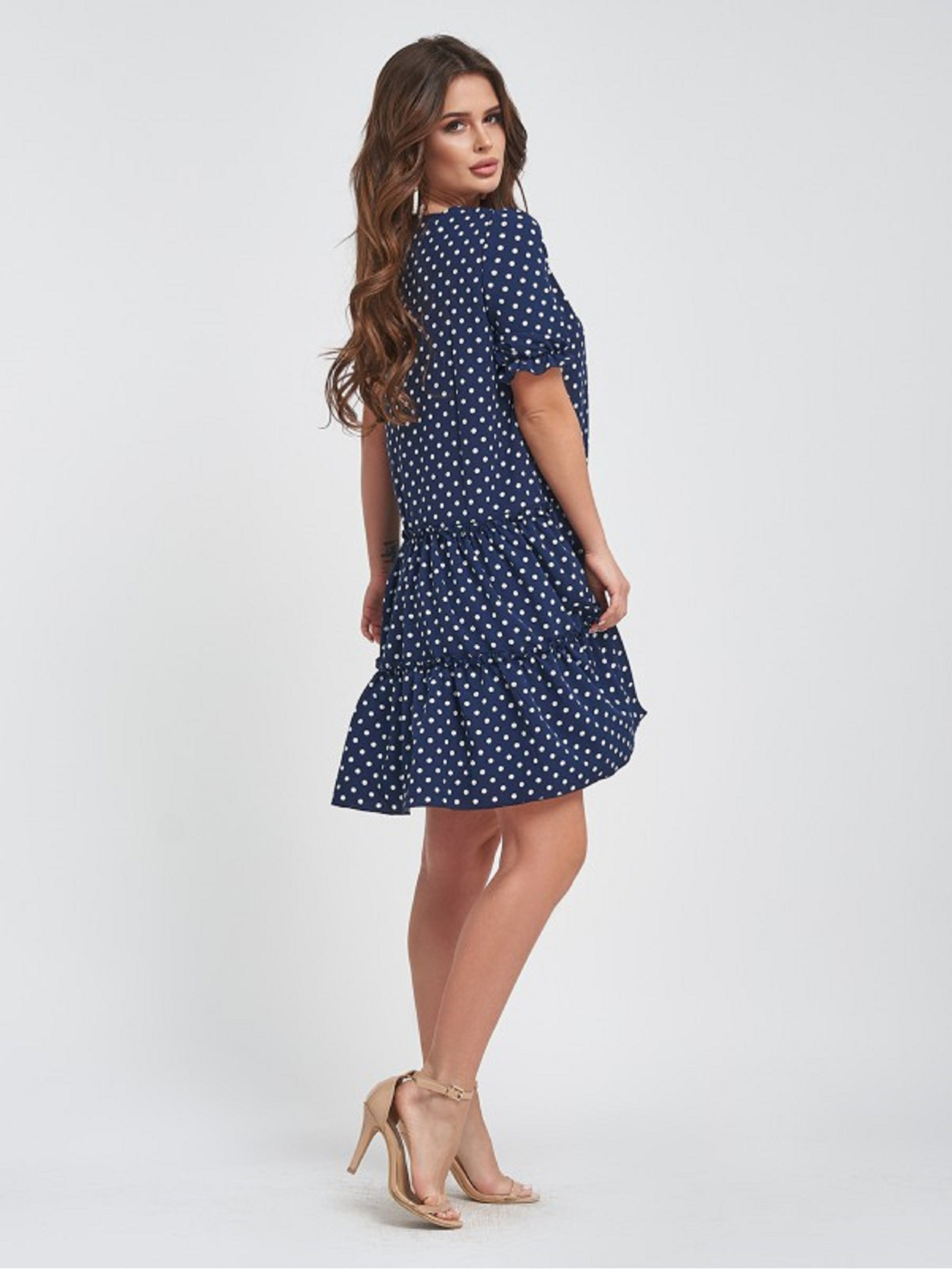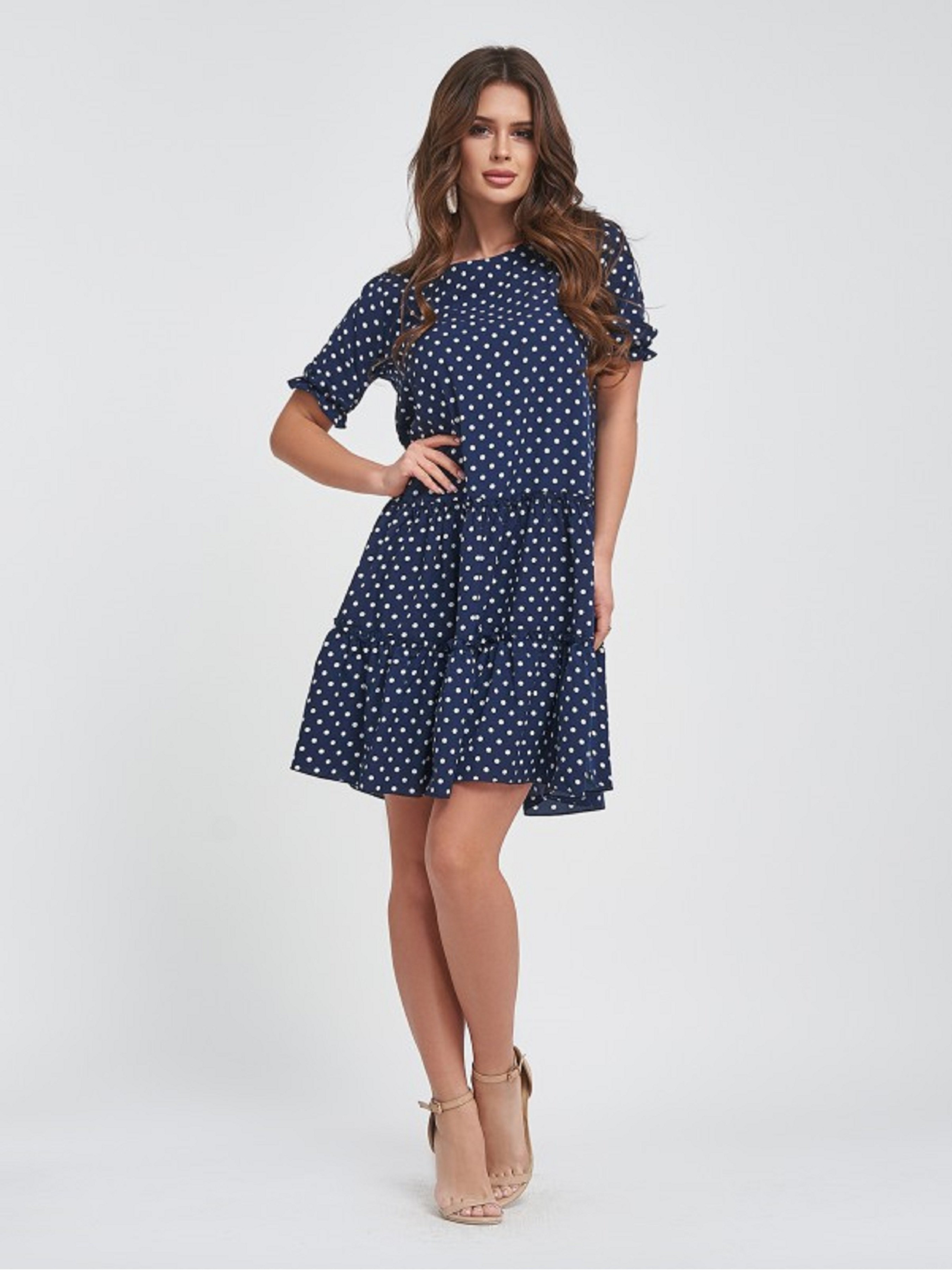 Свободное короткое платье из темно-синего софта в горошек декорированное рюшами. Платье с короткими присборенными рукавами, полукруглой горловиной и ниспадающими воланами по нижнему краю. Модель кроя трапеции с длиной до колен. Растяжимость: грудь: S (94), M (98), L (102), XL (106), талия: S (96), M (100), L (104), XL (108), бедра: S (120), M (124), L (128), XL (132), длина - 93, Ткань: Низкой эластичности.