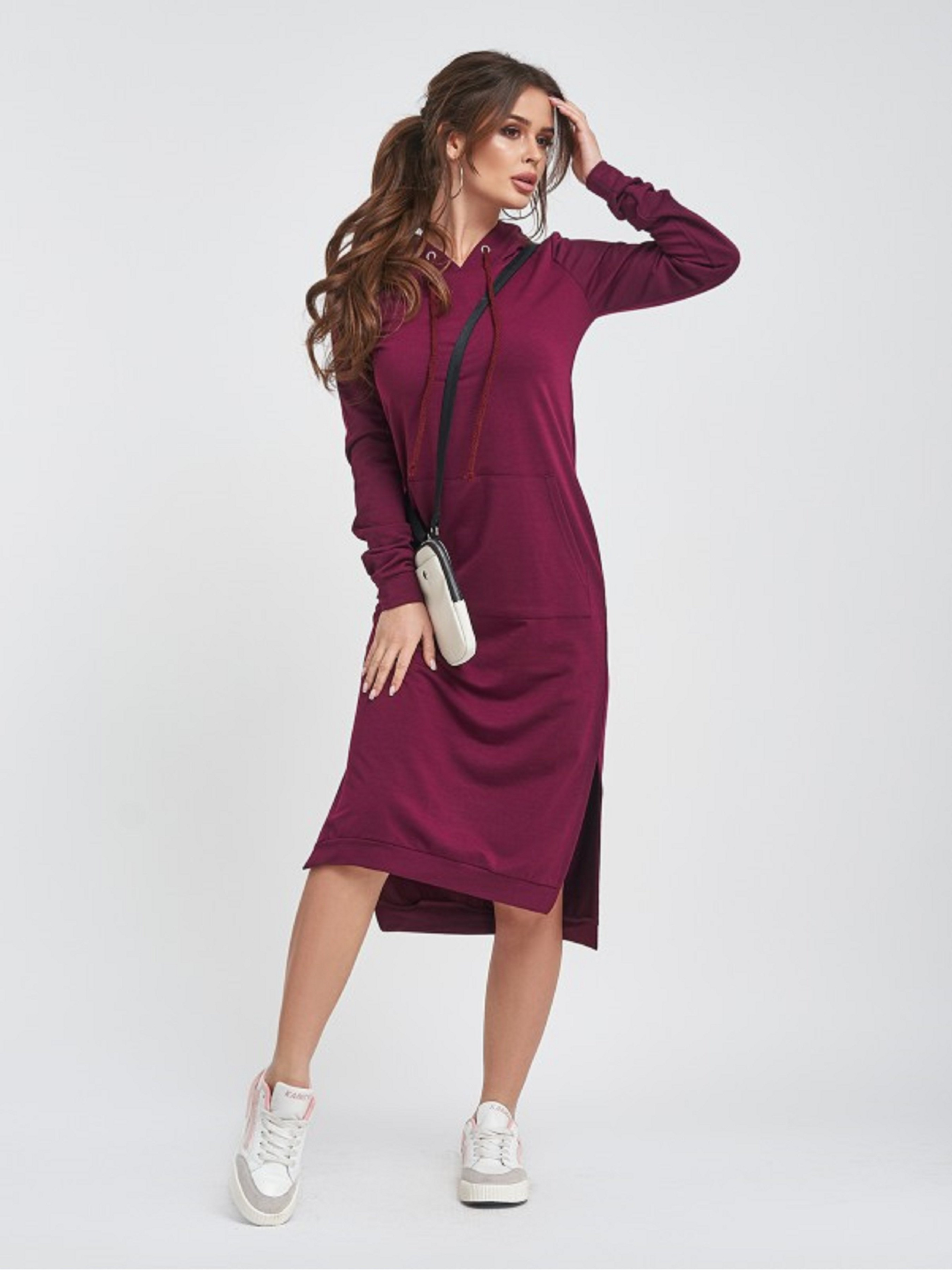 Бордовое спортивное платье с капюшоном выполненное из двухнитного трикотажа. Изделие прямого кроя с нижним манжетом и боковыми удобными разрезами. Платье миди длины оснащено длинными рукавами и карманом-кенгуру. Растяжимость: Грудь: S (90), M (94), L (98), XL (102),Талия:S (80), M (84), L (88), XL (92), Бедра: S (90), M (94), L (98), XL (102), Длина изделия- 104, длина по спинке - 110, Рукав-65, Ткань: Средней эластичности.