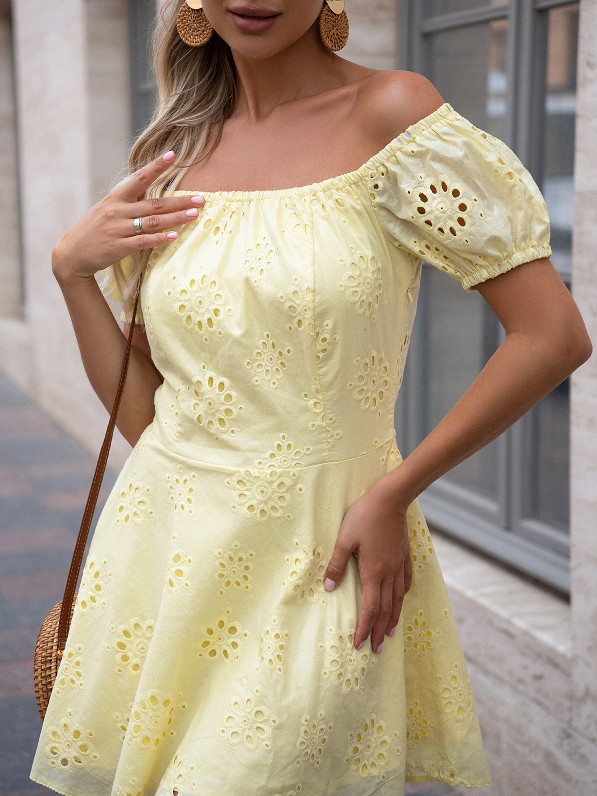 Легкое ретро платье из желтой полированной прошвы с перфорацией и нижним подкладом. Модель с короткими рукавами и открытыми плечами на резинке. Платье короткой длины с боковой застежкой-молнией. Полуобхват: Грудь: S (42), M (44), L (46), XL (48), Талия: S (34), M (36), L (38), XL (40), Бедра: S (60), M (62), L (64), XL (66), Длина изделия - 79, Рукав - 17, Ткань: Низкой эластичности.
