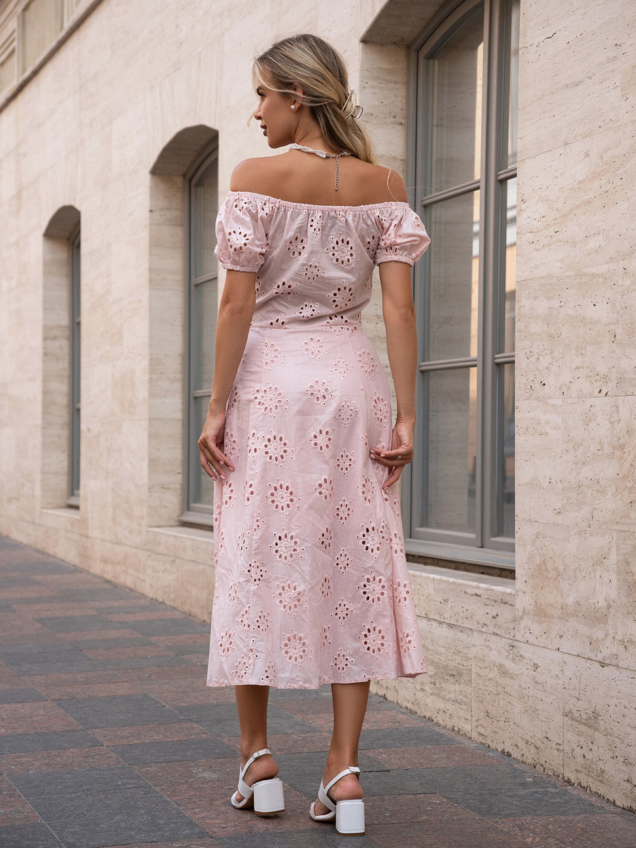 Розовое ретро платье с резинкой вдоль горловины и рукавами-фонариками короткой длины. Модель выполнена из блестящей полированной прошвы с перфорацией и нижним подкладом. Изделие миди длины с расклешенным низом и боковым разрезом. Платье с приталенным кроем и боковой молнией. Полуобхват: Грудь: S (42), M (44), L (46), XL (48), Талия: S (34), M (36), L (38), XL (40), Бедра: S (60), M (62), L (64), XL (66), Длина изделия - 116, Рукав - 17, Ткань: Низкой эластичности.