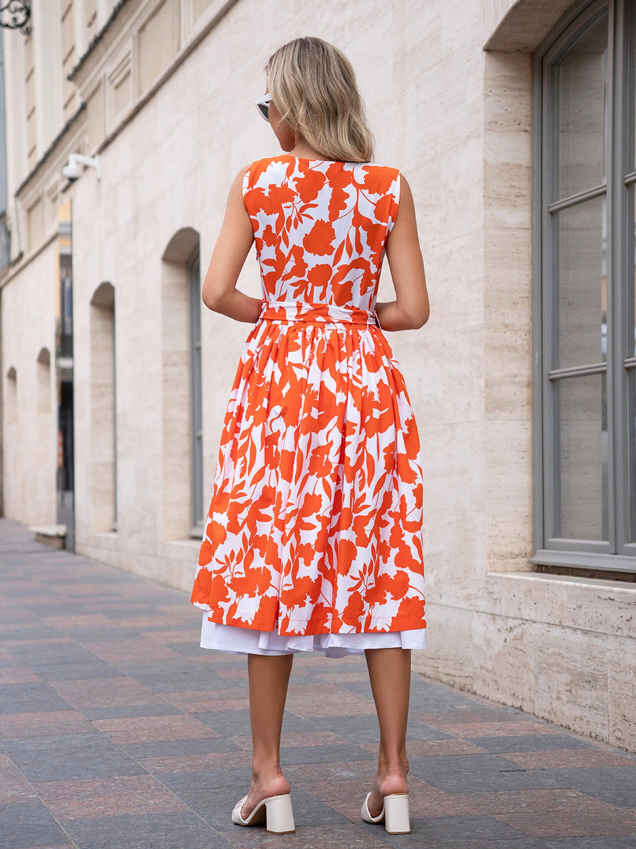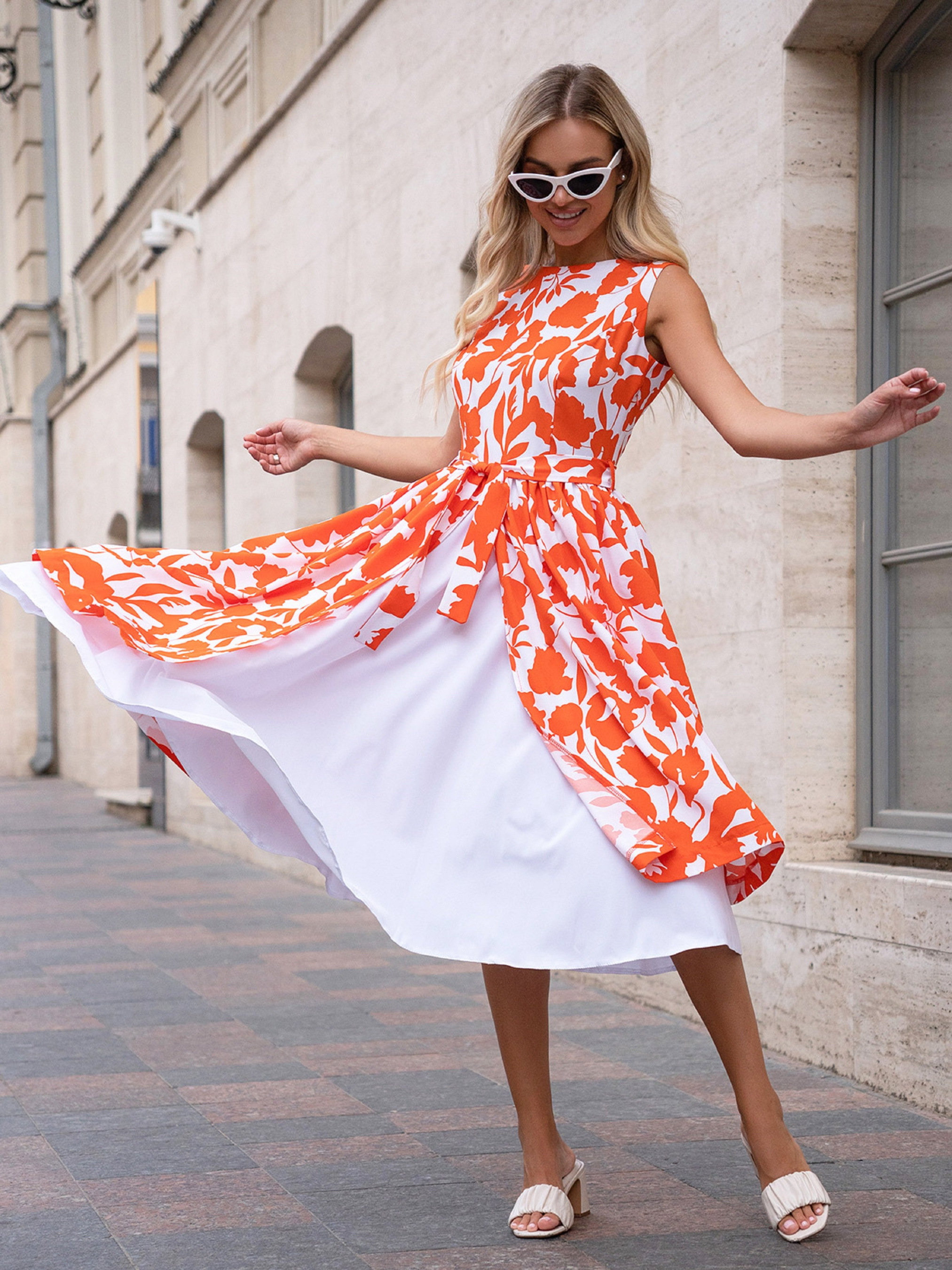 Яркое платье из принтованного оранжево-молочного софта с передним разрезом. Модель с приталенным кроем и боковой молнией. Платье миди длины со съемным поясом и нижней съемной белой юбкой. Полуобхват: Грудь: S (45), M (47), L (49), XL (51), Талия: S (36), M (38), L (40), XL (42), Бедра: S (70), M (72), L (74), XL (76), Длина изделия - 110, Ткань: Низкой эластичности.