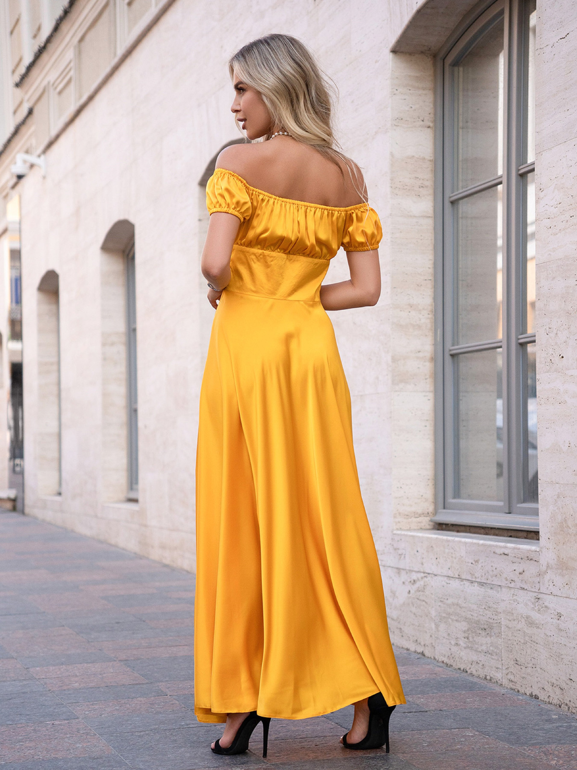 Нарядное платье из горчичного шелка с имитацией корсетной вставки и короткими рукавами-фонариками. Модель с проймой горловины на резинке декорирована передней завязкой. Модель приталенного кроя с расклешенным длинным низом и боковым разрезом. Модель с боковой молнией. Полуобхват: Грудь: S (42), M (44), L (46), XL (48), Талия: S (33), M (35), L (37), XL (39), Бедра: S (76), M (78), L (80), XL (82), Длина изделия - 133, Рукав - 12, Ткань: Низкой эластичности.