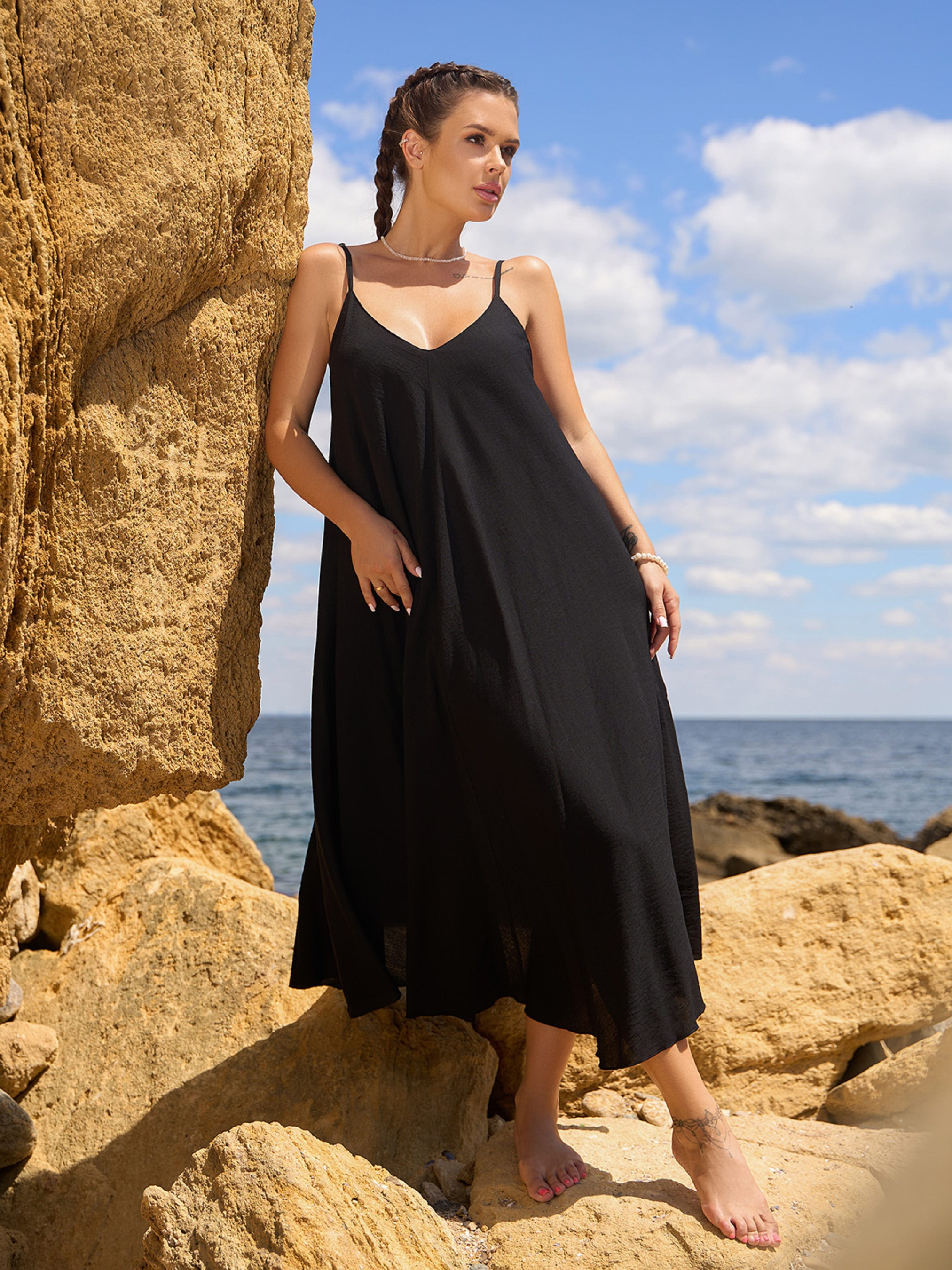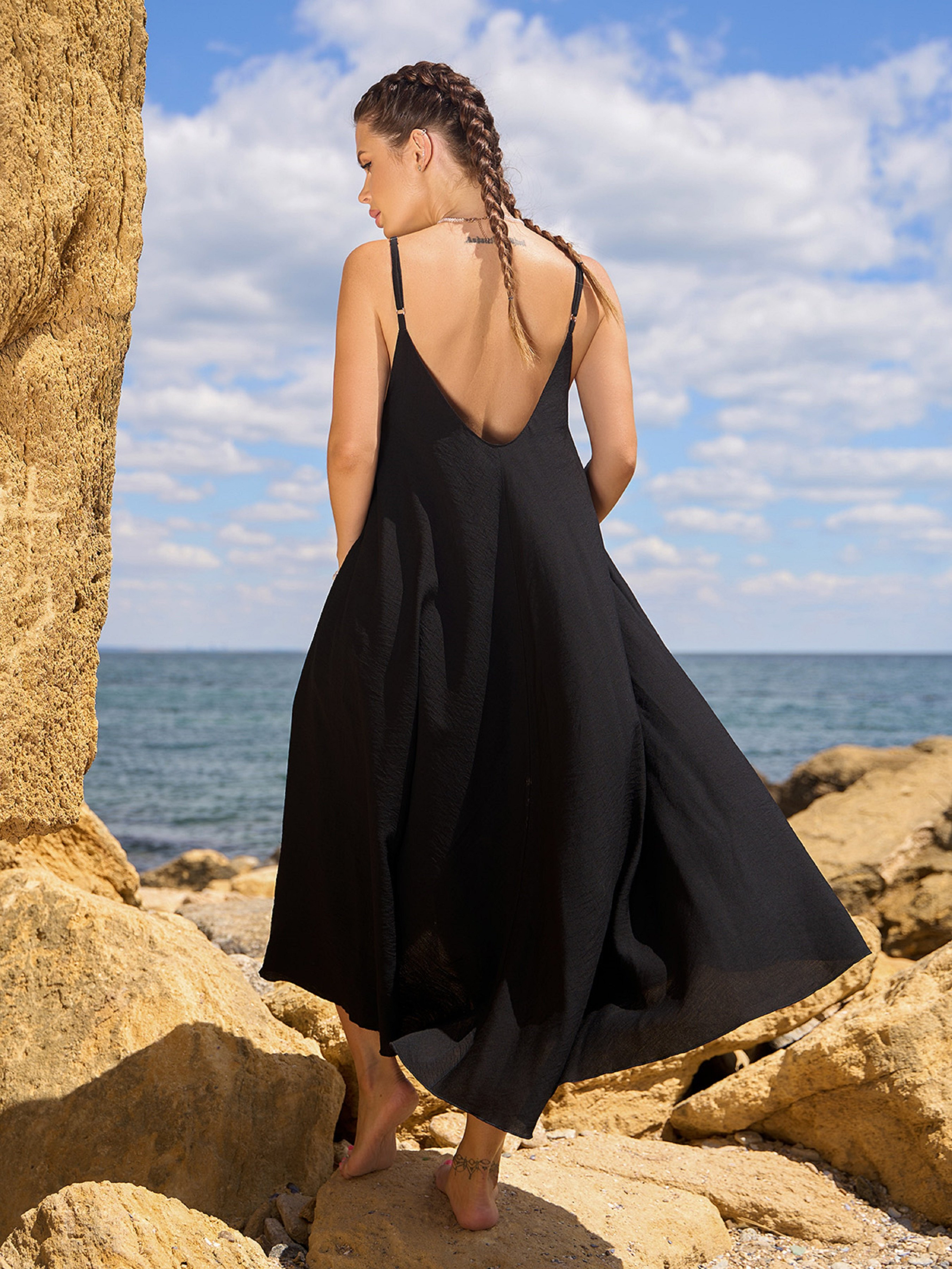 Черный летний сарафан расклешенного свободного кроя трапеции, выполненный из льна. Сарафан на тонких регулируемых бретельках с открытыми спиной и горловиной. Модель удлиненной миди длины с боковыми карманами. Полуобхват: Грудь: S (50), M (53), L (55), XL (57), Талия: S (80), M (82), L (84), XL (86), Бедра: S (100), M (102), L (104), XL (106), Длина изделия - 116, Ткань: Низкой эластичности.