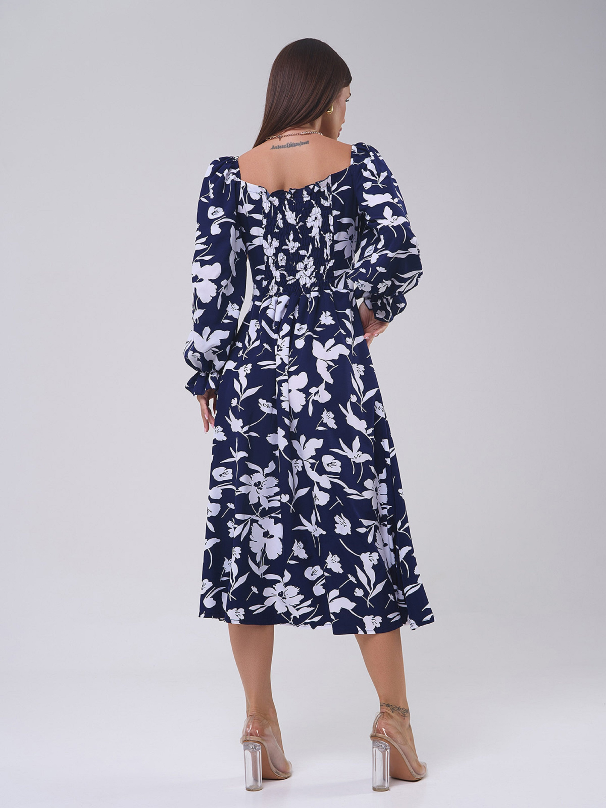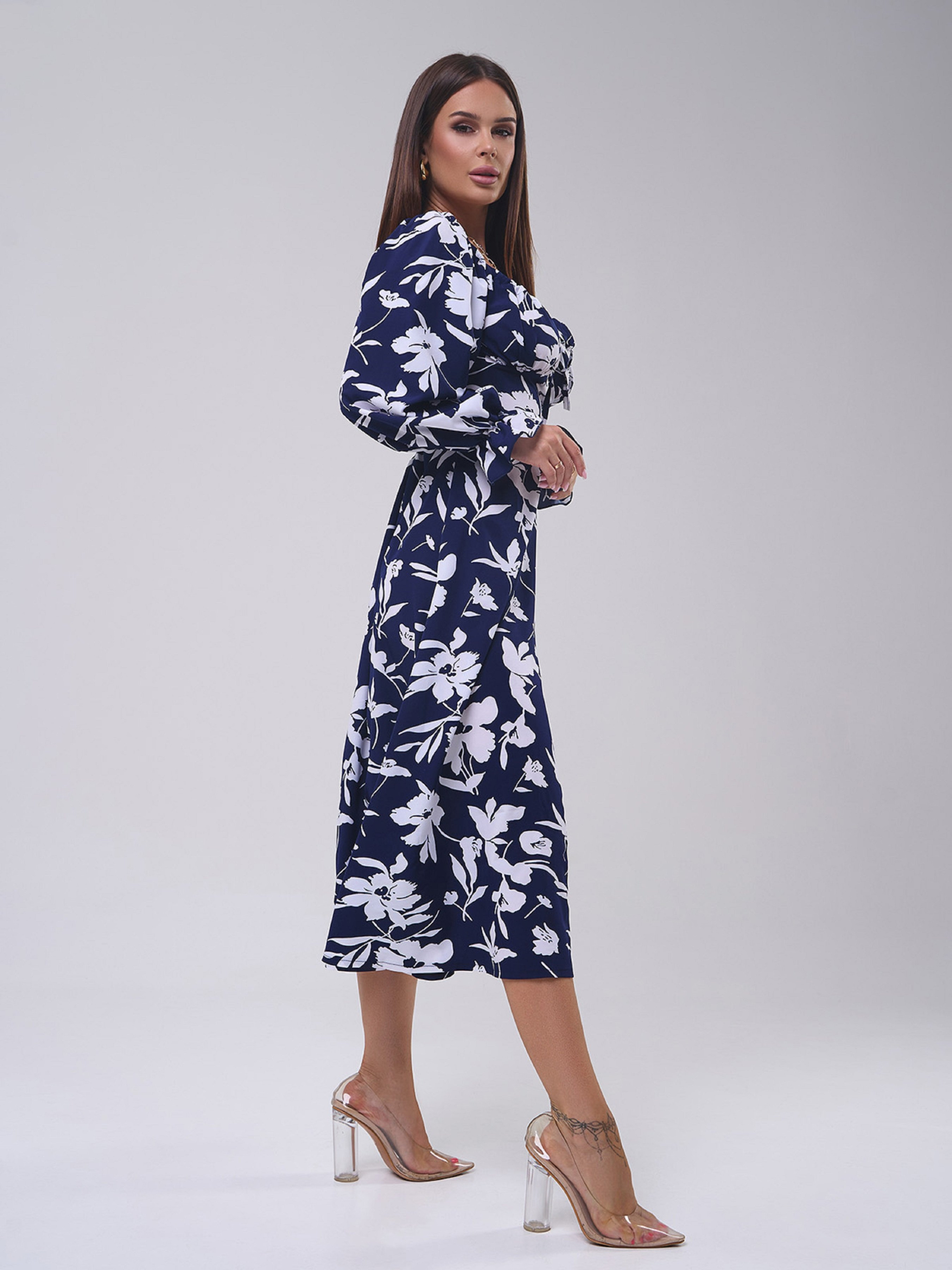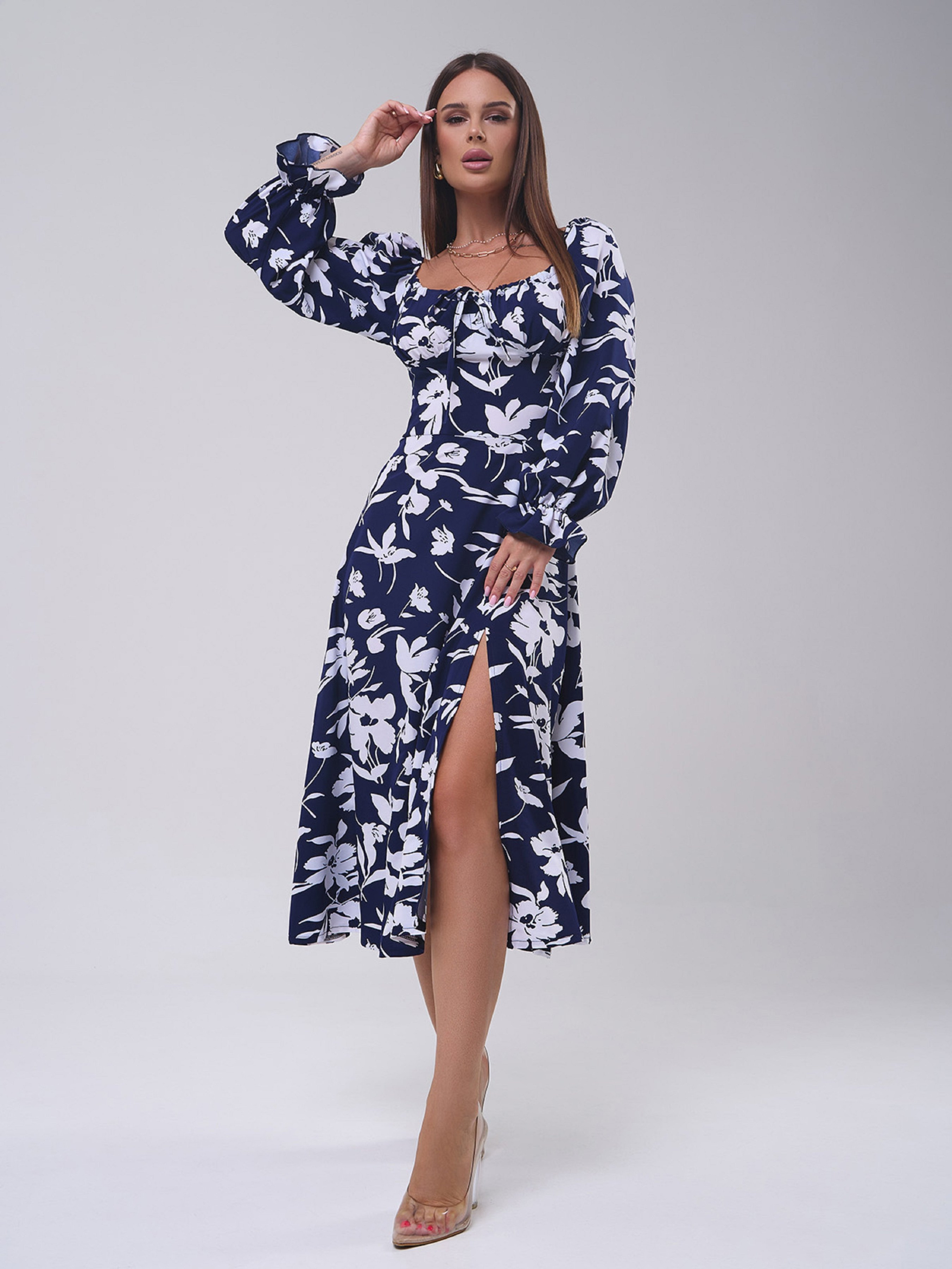 Темно-синее ретро платье из принтованного софта с горловиной каре на завязке. Платье миди длины с расклешенным низом и боковым разрезом. Модель с длинными рукавами, рюшами и открытыми плечами. Полуобхват: Грудь: S (40), M (42), L (44), XL (46), Талия: S (32), M (34), L (36), XL (38), Бедра: S (60), M (62), L (64), XL (66), Длина изделия - 119, Рукав - 58, Ткань: Низкой эластичности.