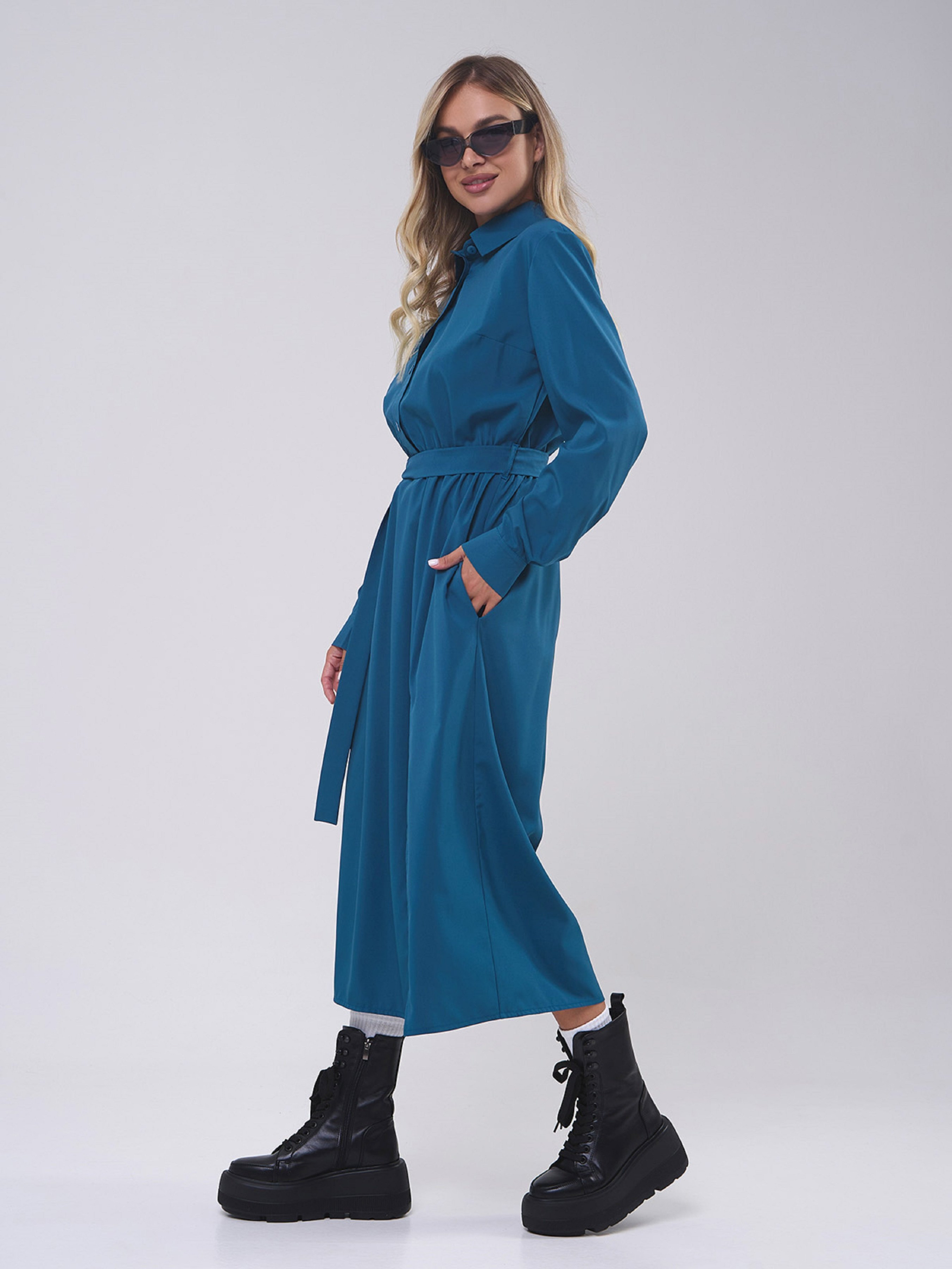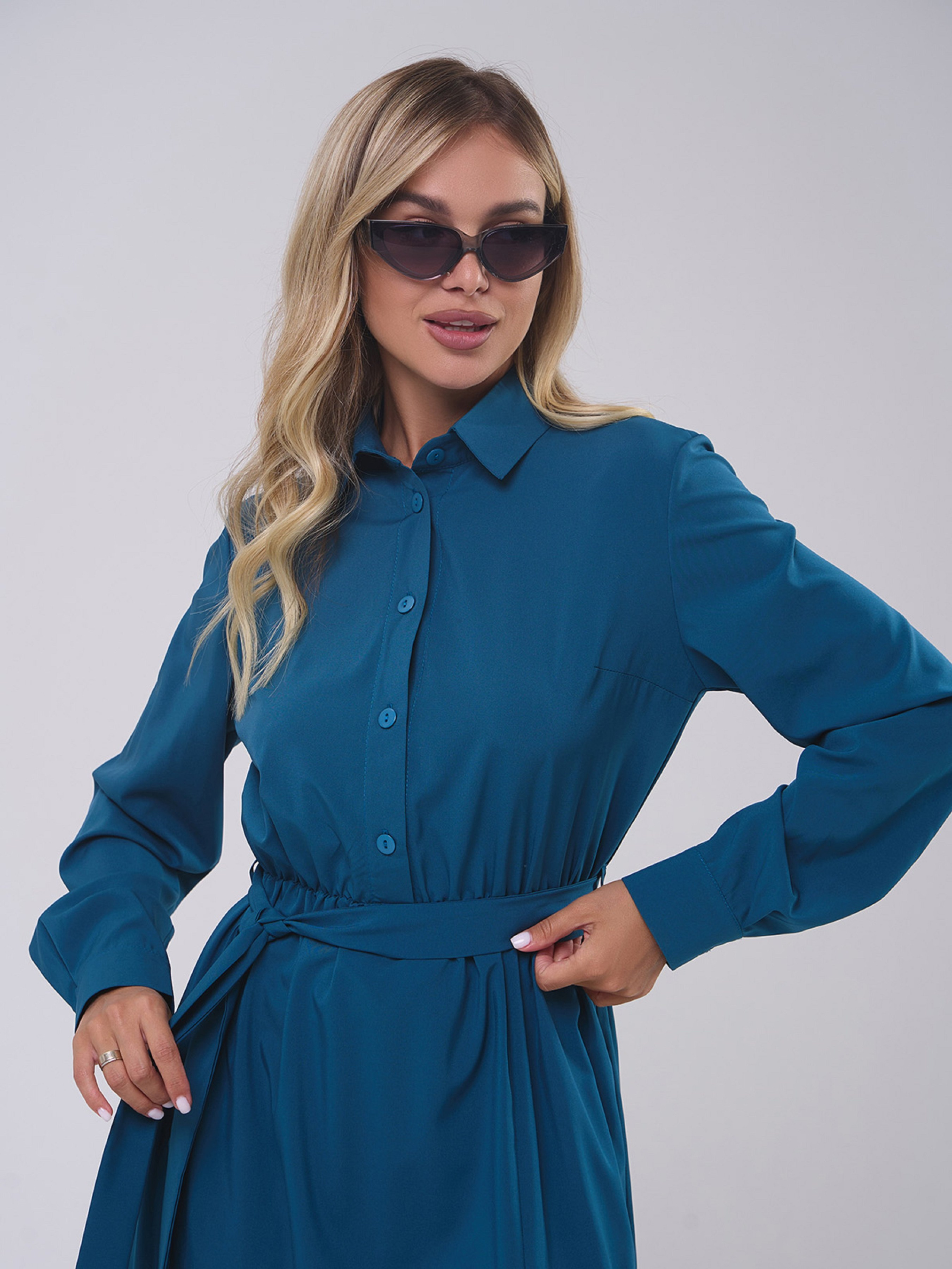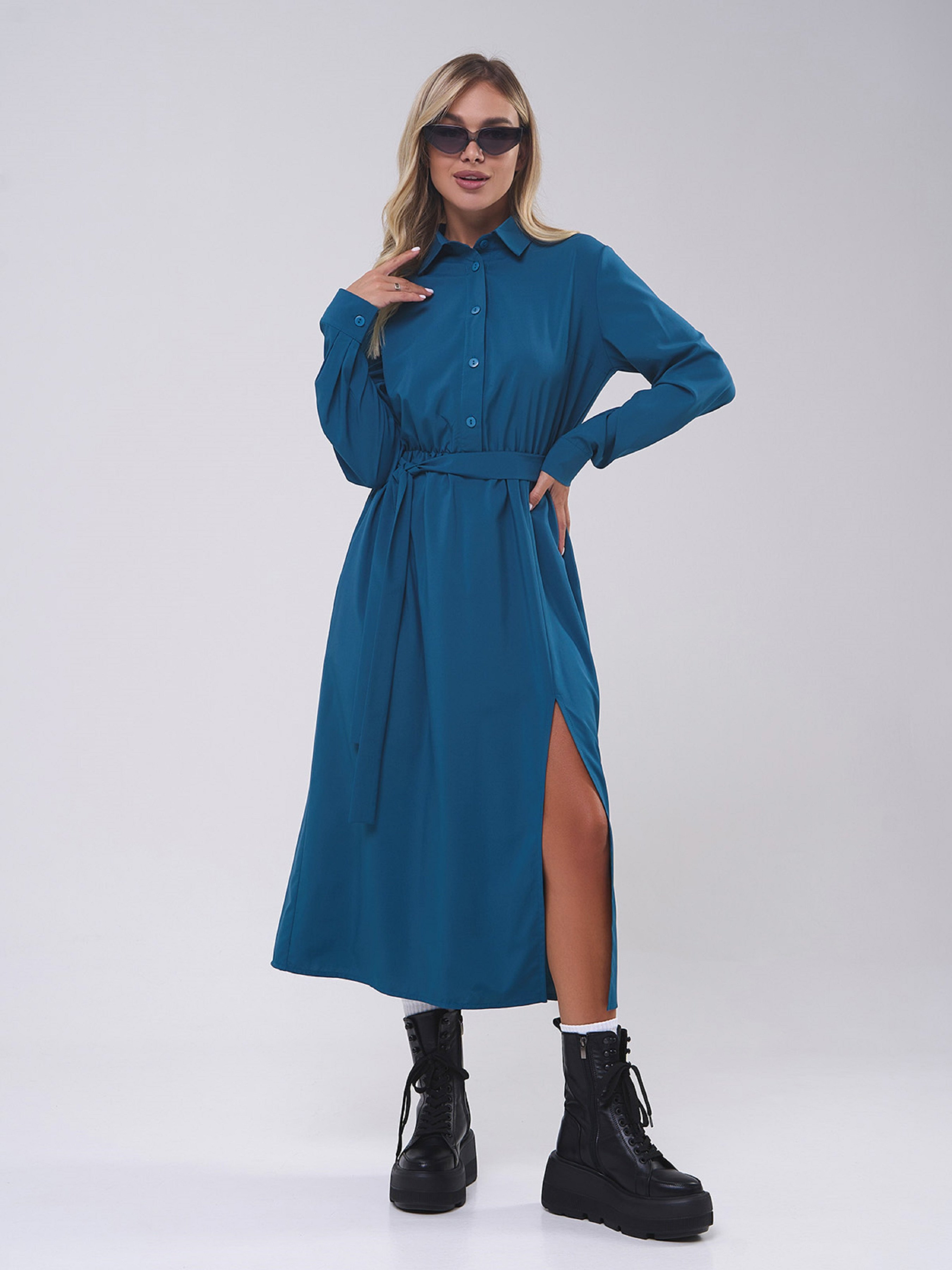 Демисезонное платье-рубашка на пуговицах, выполненное из бирюзового софта. Низ миди длины с карманами и боковым разрезом. Модель приталенного кроя с длинными рукавами на манжетах и воротником. Платье со съемным поясом. Полуобхват: Грудь: S (48), M (50), L (52), XL (54), Талия: S (32-42), M (34-44), L (36-46), XL (38-48), Бедра: S (57), M (59), L (61), XL (63), Длина изделия - 122, Рукав - 62, Ткань: Низкой эластичности.