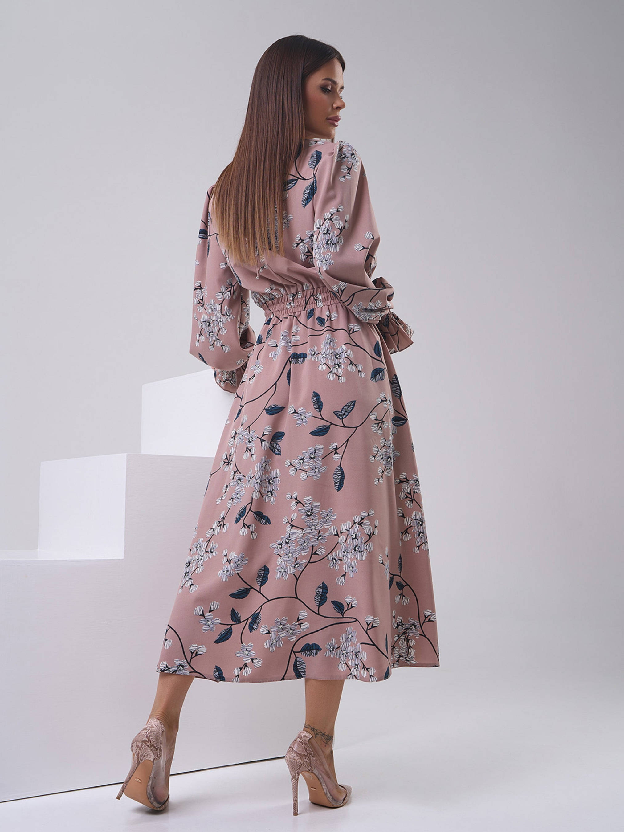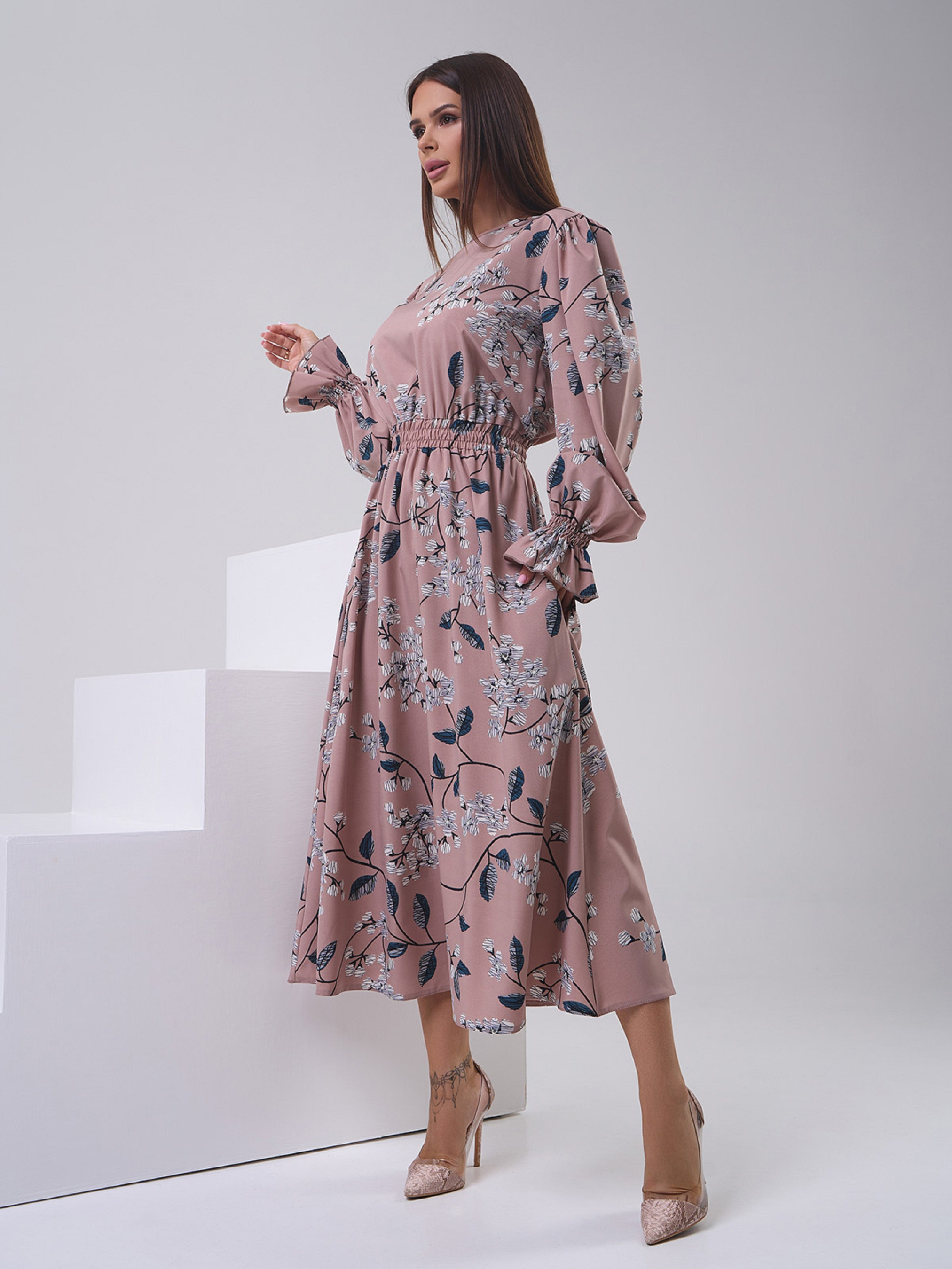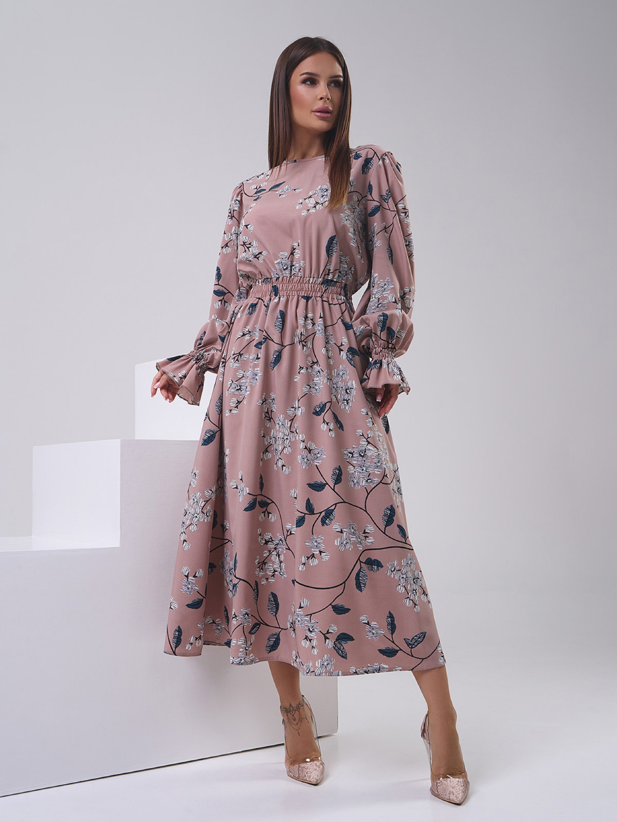 Демисезонное платье из бежевого софта с цветочным принтом. Модель с закрытой горловиной на завязке и длинными рукавами с воланами. Платье миди длины с боковыми карманами и эластичной резинкой на талии. Полуобхват: Грудь: S (46), M (48), L (50), XL (52), Талия: S (30-40), M (32-42), L (34-44), XL (36-46), Бедра: S (64), M (66), L (68), XL (70), Длина изделия - 127, Рукав - 65, Ткань: Низкой эластичности.