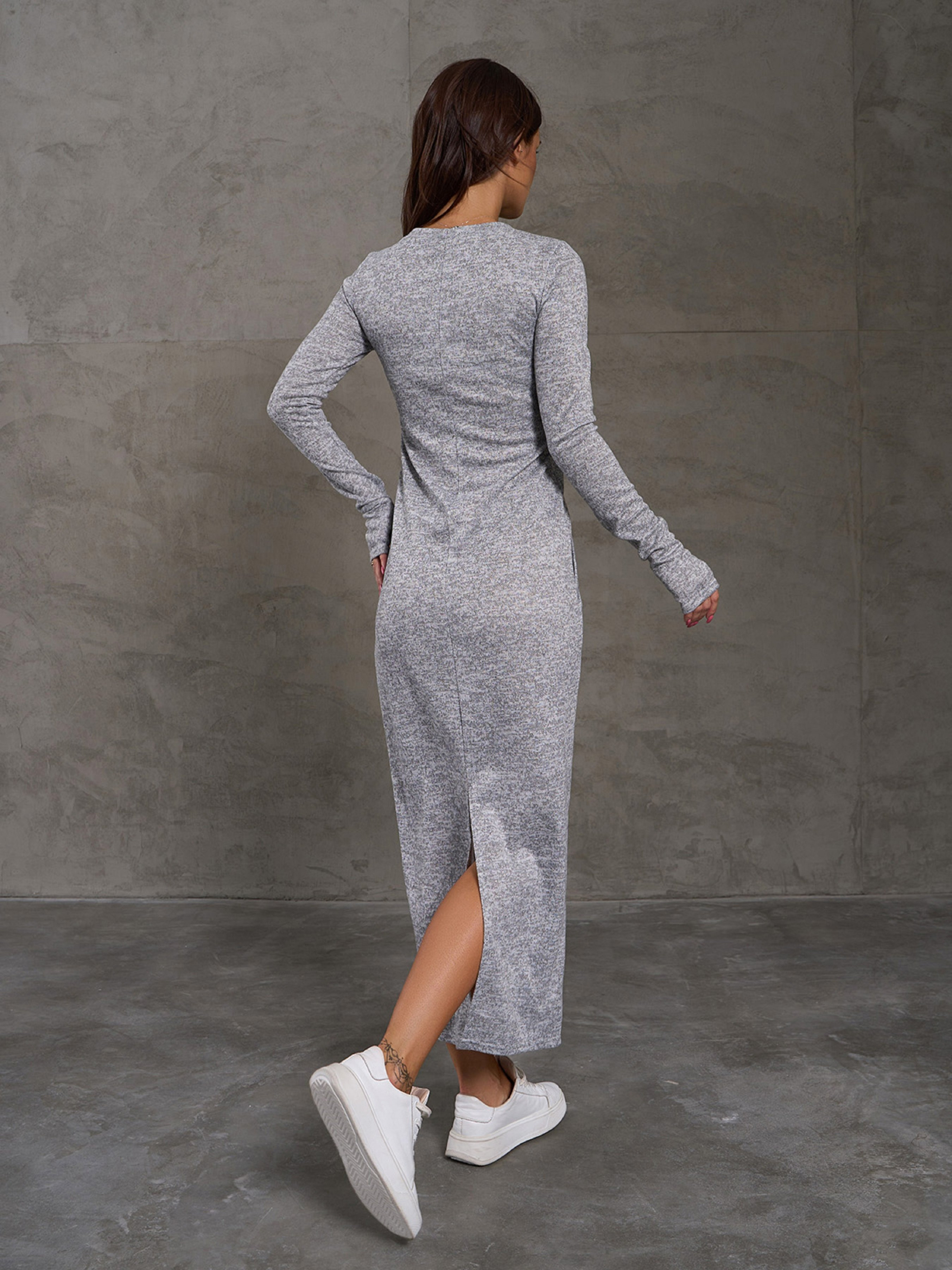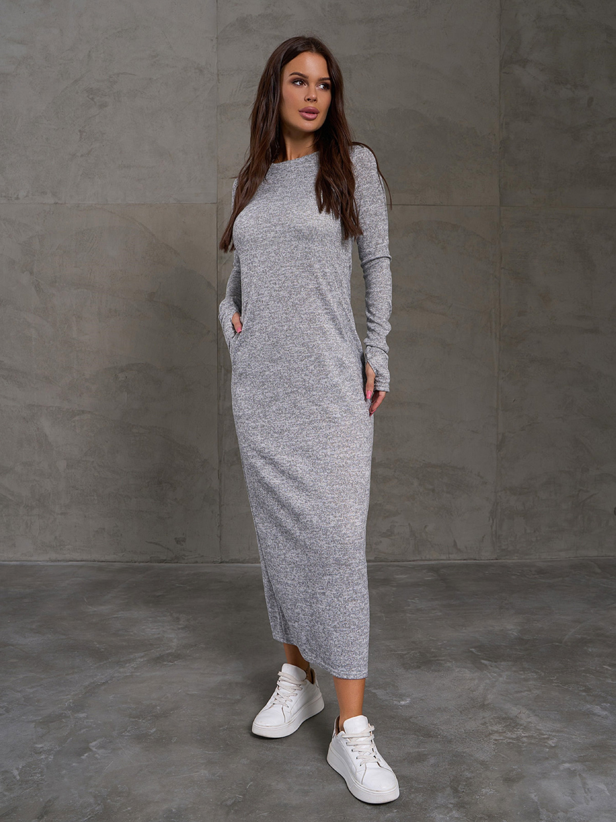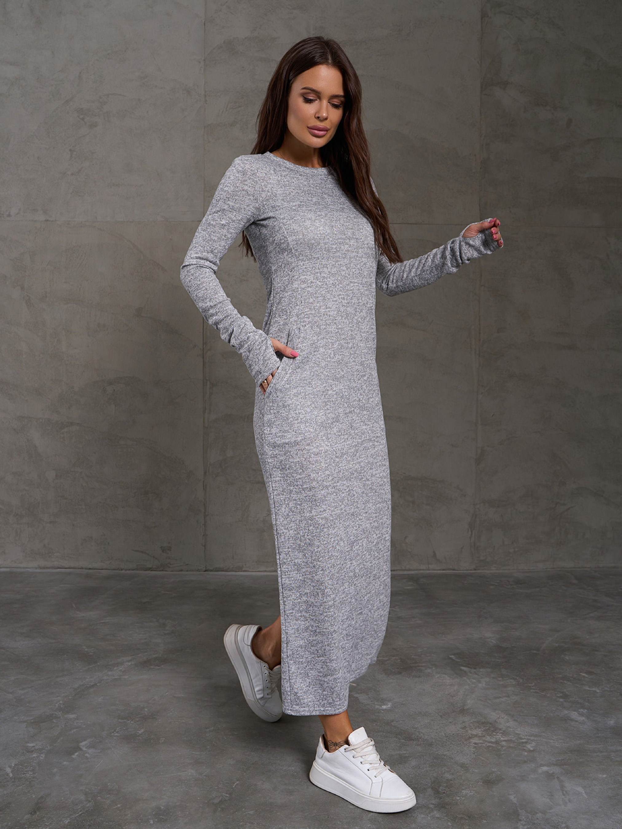 Светло-серое длинное ангоровое платье с облегающим прямым кроем. Модель с длиной макси и разрезом сзади. Платье оснащено карманами и длинными рукавами с отверстиями для пальцев. Полуобхват: Грудь: ХS (38), S (40), M (42), L (46), XL (50), XXL (52), Талия: ХS (38), S (40), M (42), L (46), XL (50), XXL (52), Бедра: ХS (44), S (46), M (48), L (52), XL (56), XXL (58), Длина изделия - 126-132*, Рукав - 67-72*, Ткань: Высокой эластичности.