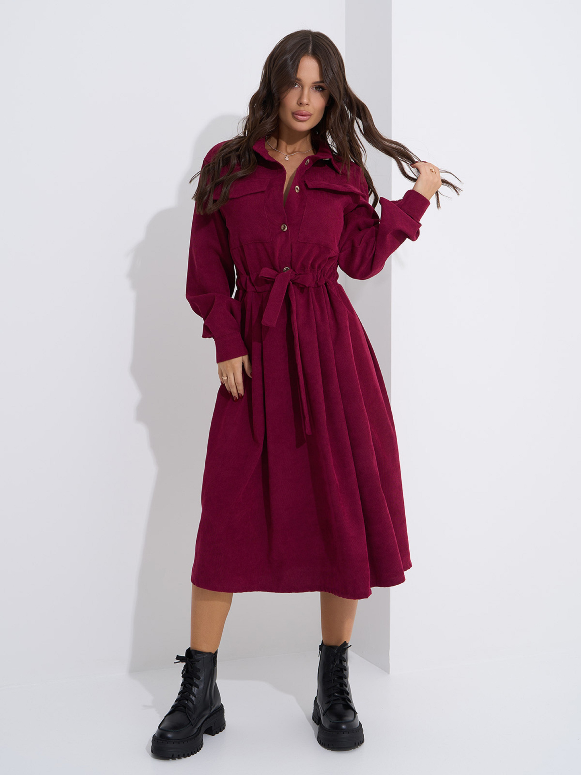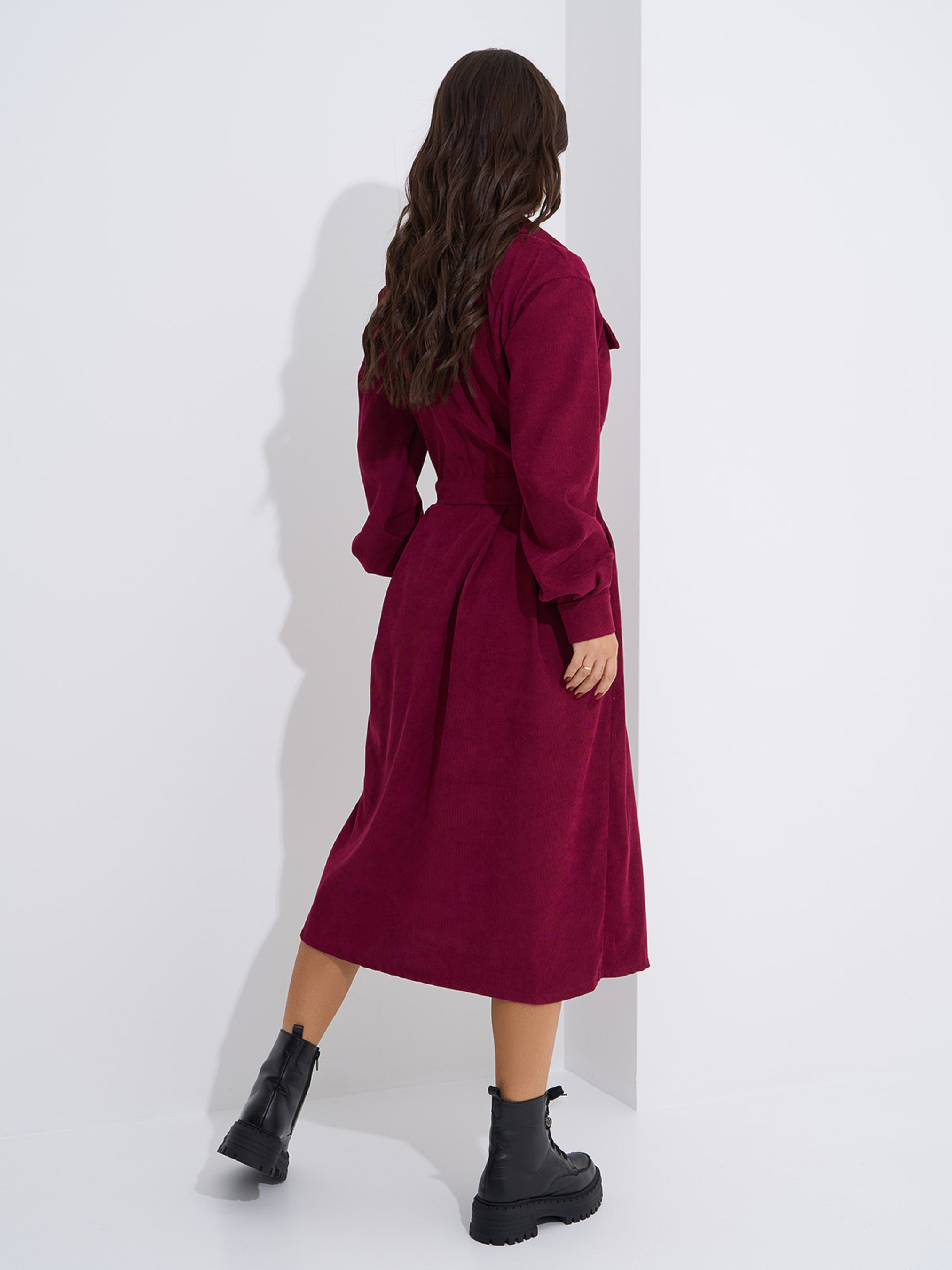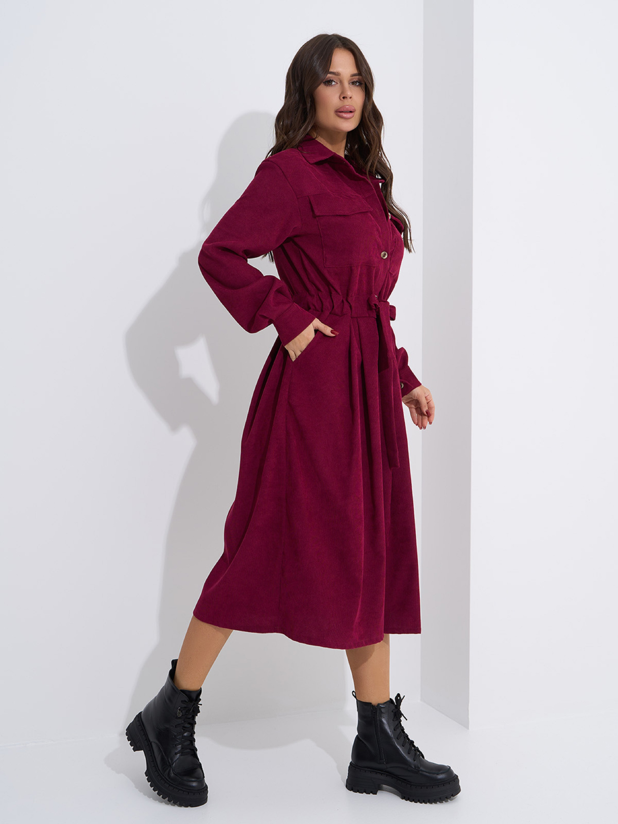 Вельветовое однотонное платье-рубашка с укороченной планкой на пуговицах и кулиской на талии. Платье со сборками на поясе, боковыми и нагрудными карманами. Модель оснащена длинными рукавами на манжетах и воротником. Платье миди длины выполнено в бордовом цвете. Полуобхват: Грудь: S (46), M (48), L (50), XL (52), Талия: S (44), M (46), L (48), XL (50), Бедра: S (58), M (60), L (62), XL (64), Длина изделия - 110, Рукав - 58, Ткань:Низкой эластичности.