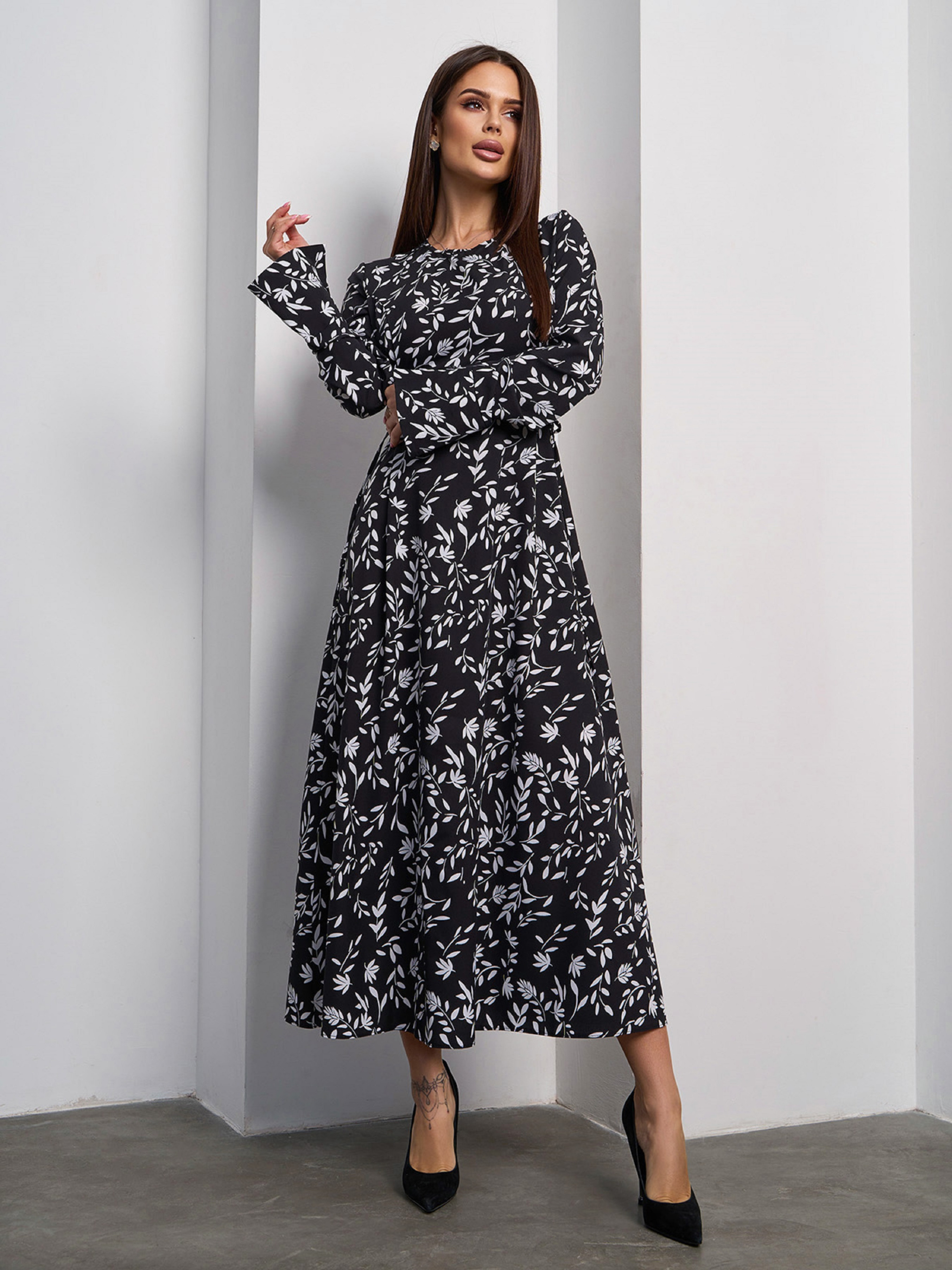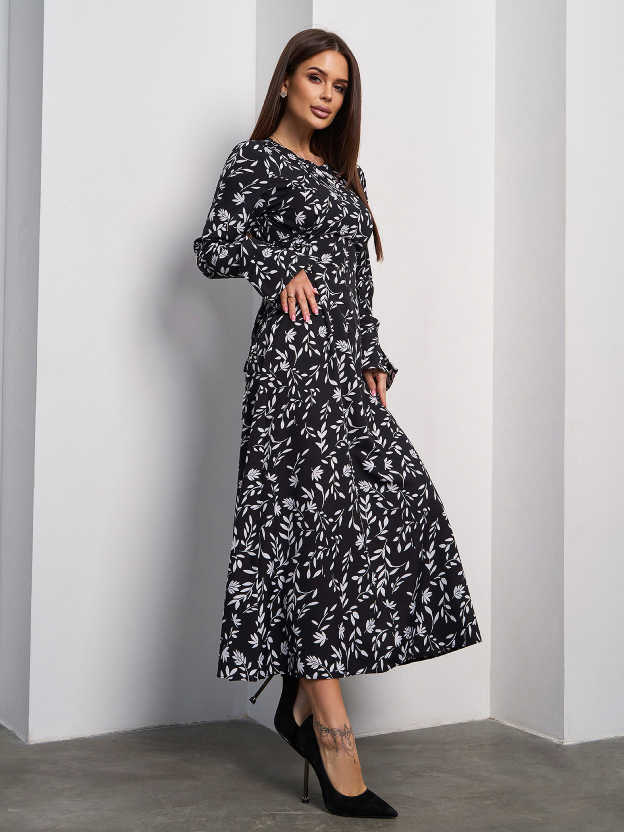 Черно-белое демисезонное платье из принтованного софта с боковыми шнуровками. Модель с длинными рукавами на манжетах и молнией на спинке. Платье макси длины с расклешенным кроем низа. Полуобхват: Грудь: S (46), M (48), L (50), XL (52), Талия: S (43), M (45), L (47), XL (49), Бедра: S (52), M (54), L (56), XL (58), Длина изделия - 124, Рукав - 70, Ткань: Низкой эластичности. Состав: 50% хлопок, 50% полиэстер