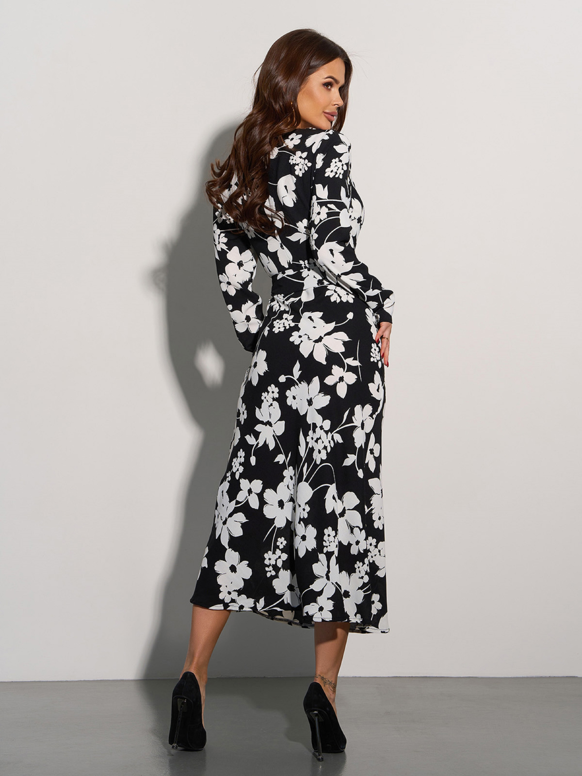 Черно-белое цветочное платье кроя годе из крепа. Платье миди длины с длинными рукавами и съемным поясом на пряжке. Модель с закрытой горловиной на пуговице и потайной застежкой-молнией. Состав: 59% полиэстер, 21% эластан, 20% хлопок. Полуобхват: Грудь: S (40), M (43), L (45), XL (47), XXL (49), 3XL (52), Талия: S (33), M (35), L (39), XL (41), XXL (44), 3XL (46), Бедра: S (42), M (46), L (47), XL (52), XXL (55), 3XL (58), Длина изделия - 122, Рукав - 59, Ткань: Низкой эластичности.