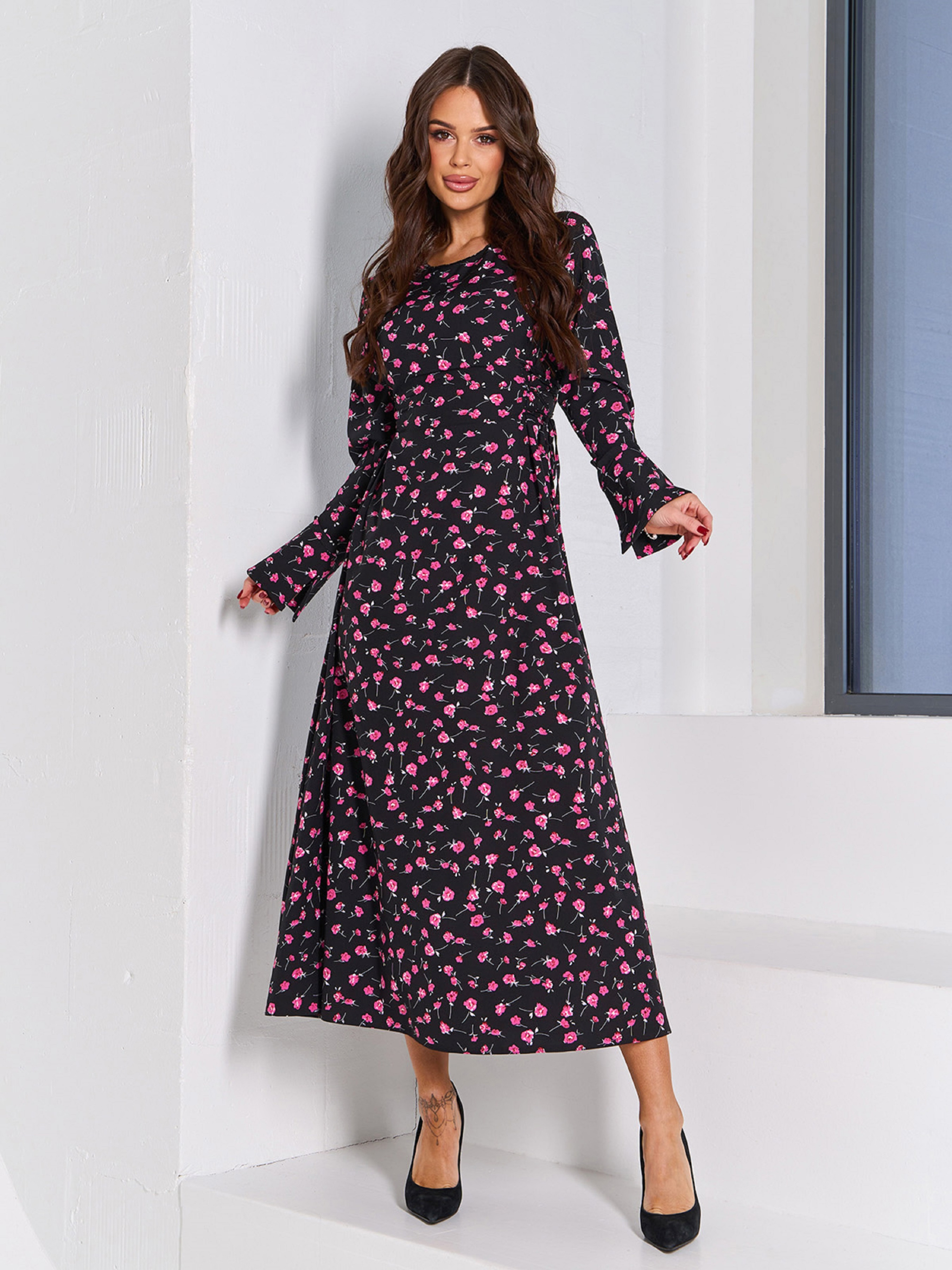 Длинное ретро платье, выполненное из черного софта с принтом и боковыми шнуровками. Модель с длинными рукавами на манжетах и молнией на спинке. Платье приталенного кроя с расклешенным низом. Состав: 50% хлопок, 50% полиэстер. Полуобхват: Грудь: S (41), M (42), L (45), XL (48), Талия: S (42), M (45), L (47), XL (50), Бедра: S (57), M (58), L (61), XL (63), Длина изделия - 123, Рукав - 70, Ткань: Низкой эластичности.