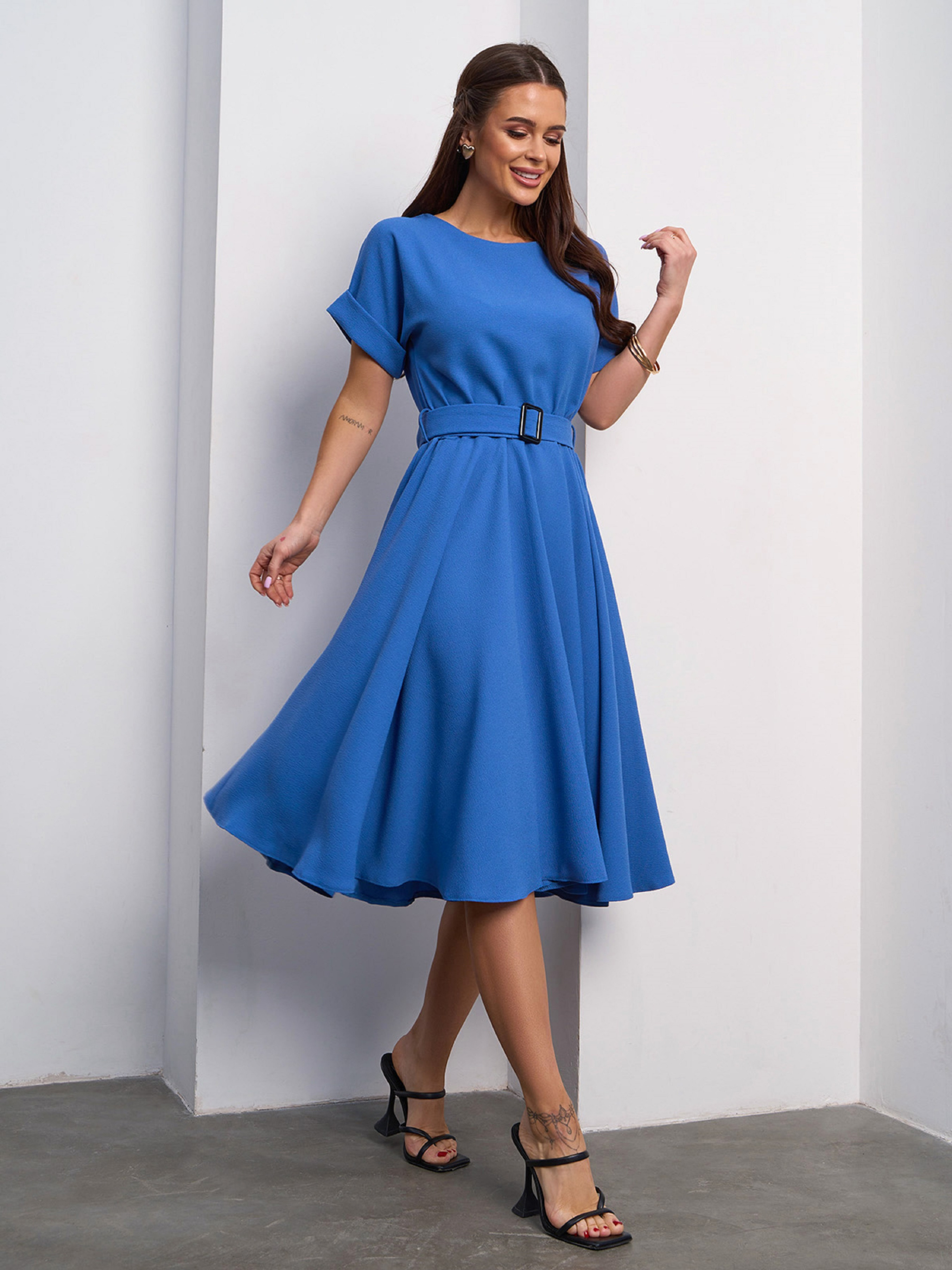 Классическое голубое платье из крепа с расклешенным низом миди длины. Модель с цельнокроенными короткими рукавами с подворотами и резинкой на талии. Платье с боковыми карманами и съемным поясом с пряжкой. Полуобхват: Грудь: S (43), M (45), L (47), XL (49), Талия: S (30-36), M (32-38), L (34-40), XL (36-42), Бедра: S (88), M (90), L (92), XL (94), Длина изделия - 110, Рукав - 8, Ткань: Низкой эластичности. Состав: 59% полиэстер, 21% эластан, 20% хлопок