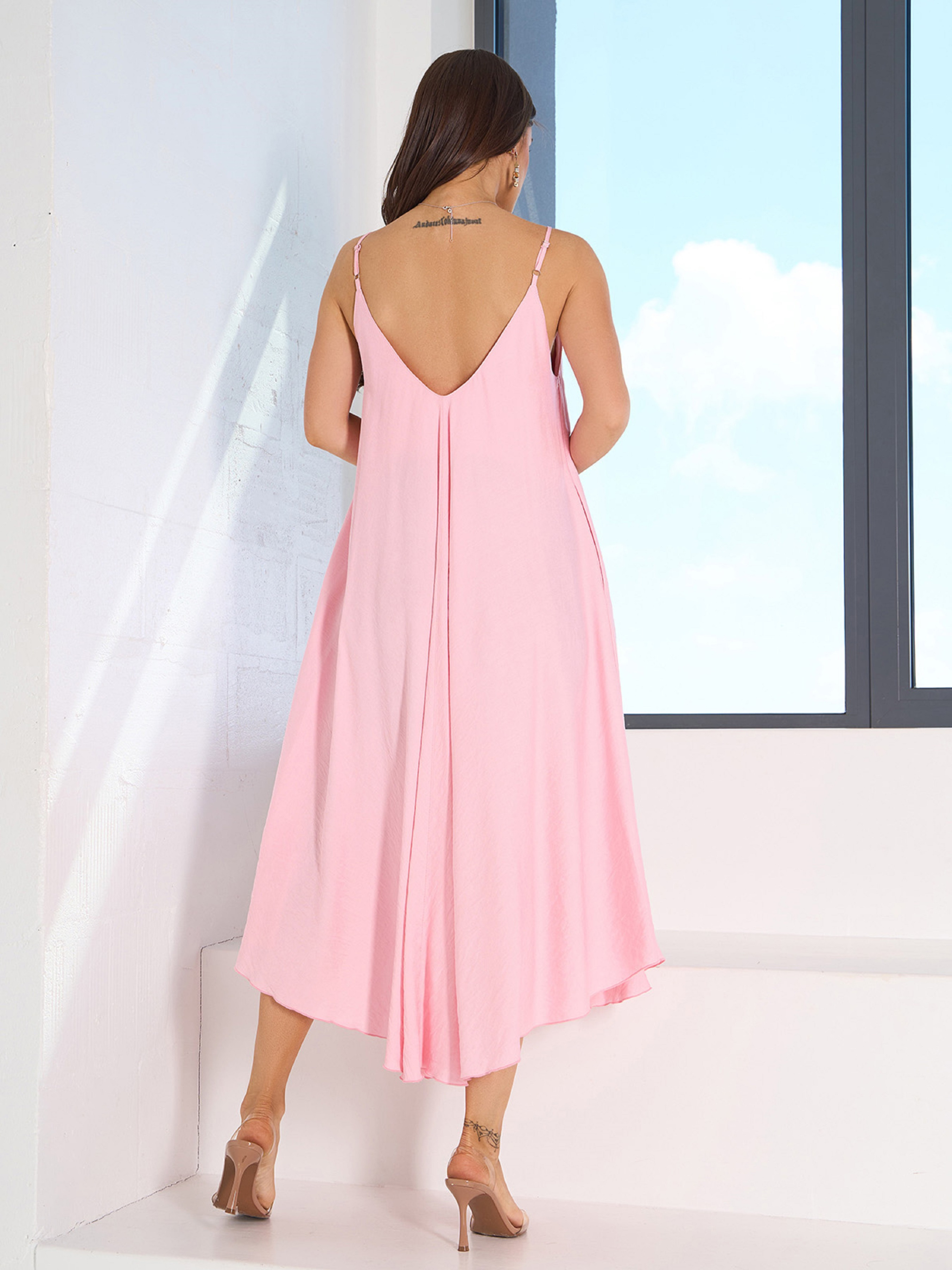 Льняной розовый сарафан расклешенного свободного кроя трапеции. Платье на тонких регулируемых бретельках с открытыми спиной и глубокой горловиной. Модель миди-макси длины с боковыми карманами. Полуобхват: Грудь: S (50), M (53), L (55), XL (57), Талия: S (80), M (82), L (84), XL (86), Бедра: S (100), M (102), L (104), XL (106), Длина изделия - 112, Ткань: Низкой эластичности. Состав: 65% лен, 20% хлопок, 15% полиэстер