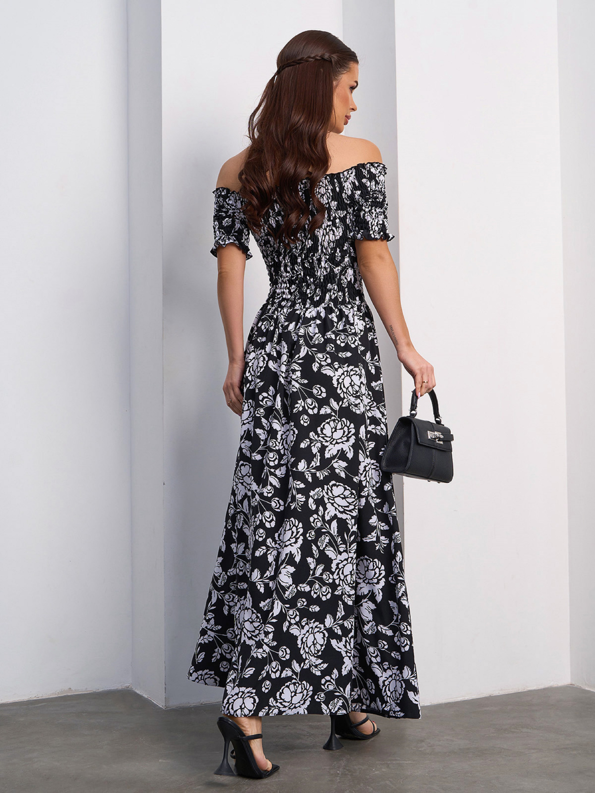 Черно-белое принтованное платье с эластичным верхом из жатки, выполненное из софта. Модель с короткими рукавами и открытыми плечами оснащена расклешенным низом с боковым разрезом. Платье макси длины с рюшами. Полуобхват: Грудь: S (25-45), M (27-47), L (29-49), XL (31-51), Талия: S (25-45), M (27-47), L (29-49), XL (31-51), Бедра: S (64), M (66), L (68), XL (70), Длина изделия - 123, Рукав - 23, Ткань: Низкой эластичности. Состав: 50% хлопок, 50% полиэстер