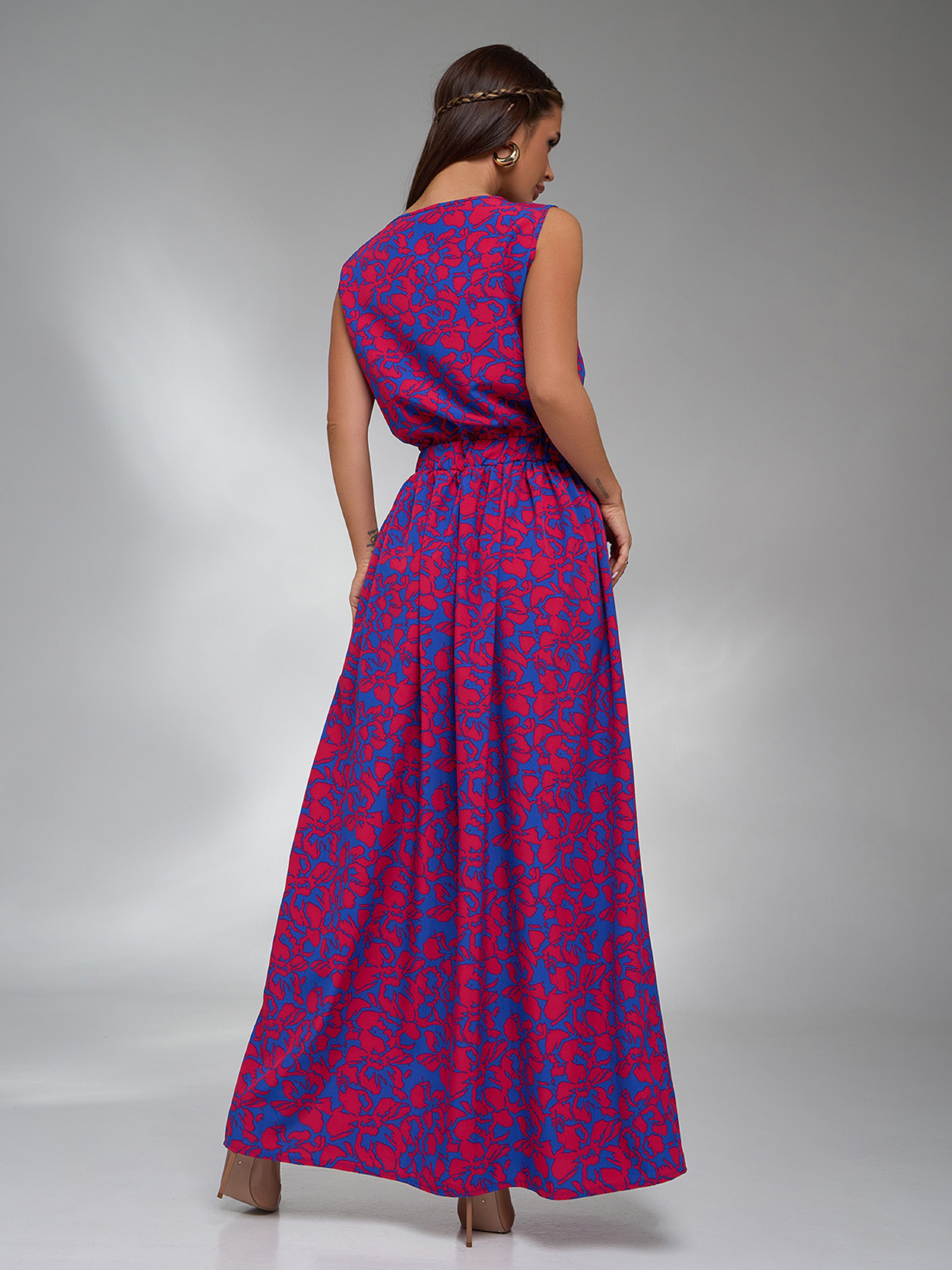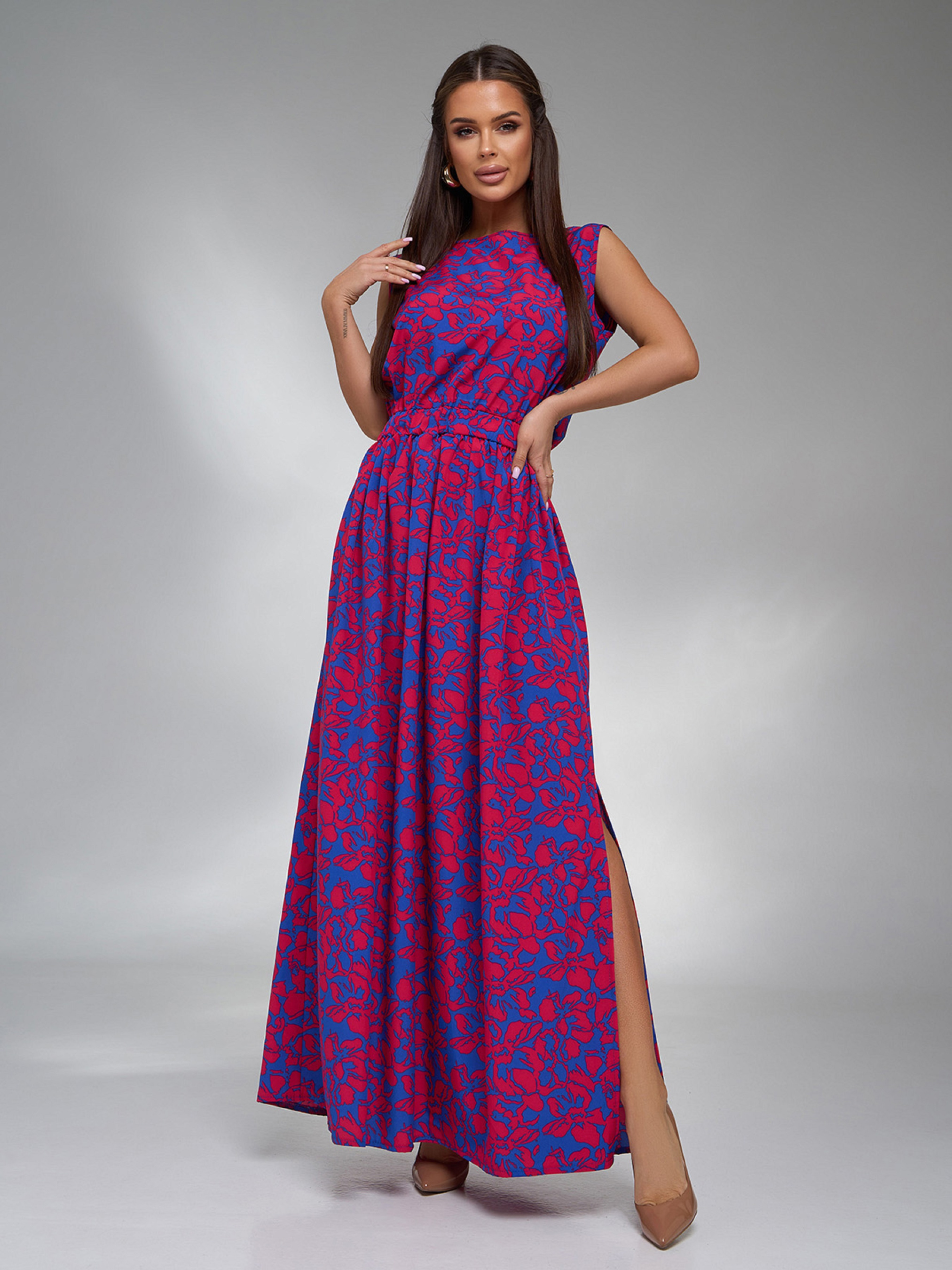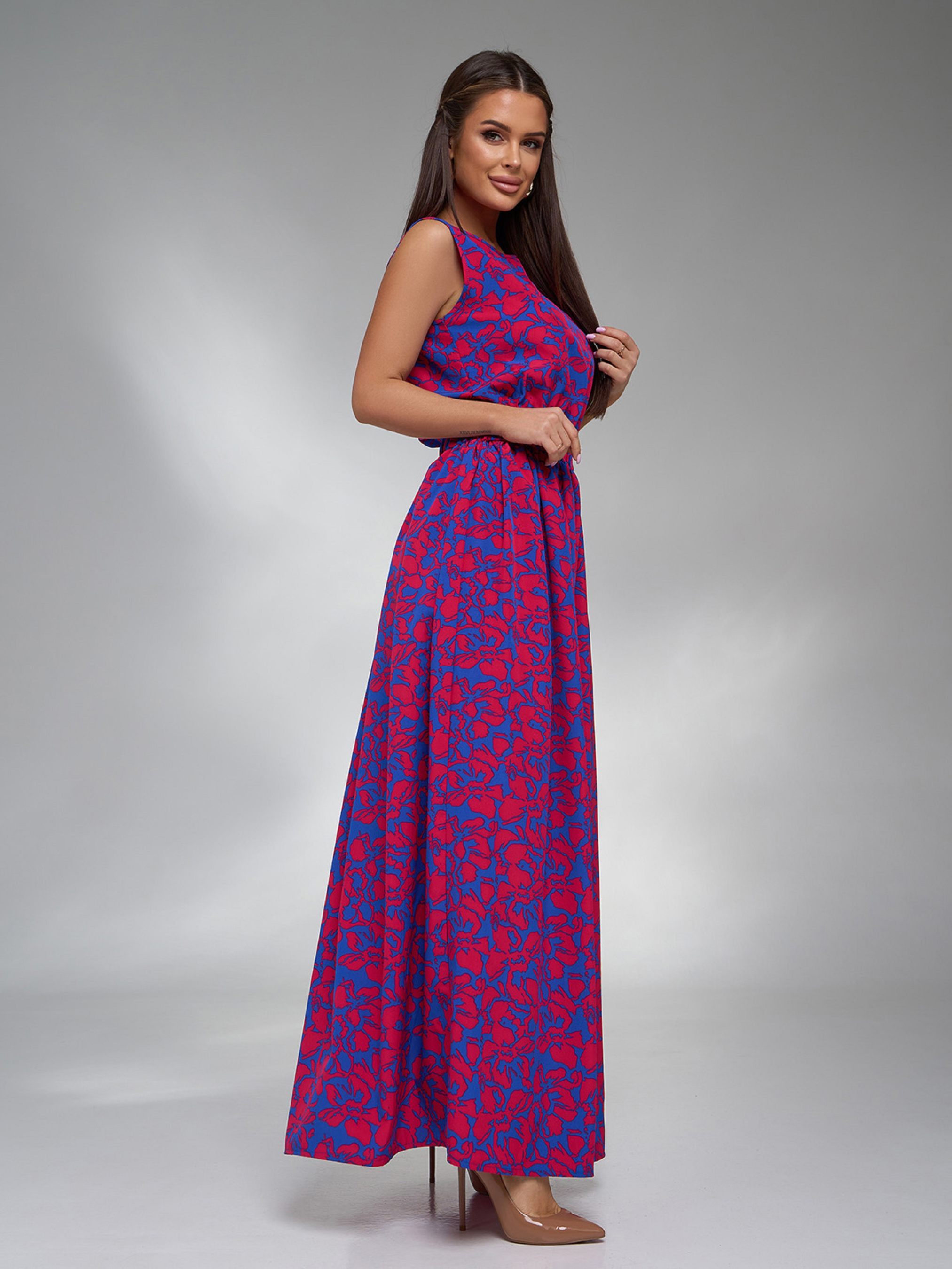 Цветочное длинное платье без рукавов, выполненное из софта. Модель с резинкой на талии и расклешенным длинным низом с боковым разрезом. Платье с полукруглой горловиной. Полуобхват: Грудь: S (48), M (50), L (52), XL (54), Талия: S (32-40), M (34-42), L (36-44), XL (38-48), Бедра: S (66), M (68), L (70), XL (72), Длина изделия – 146, Ткань: Низкой эластичности. Состав: 59% полиэстер, 21% эластан, 20% хлопок