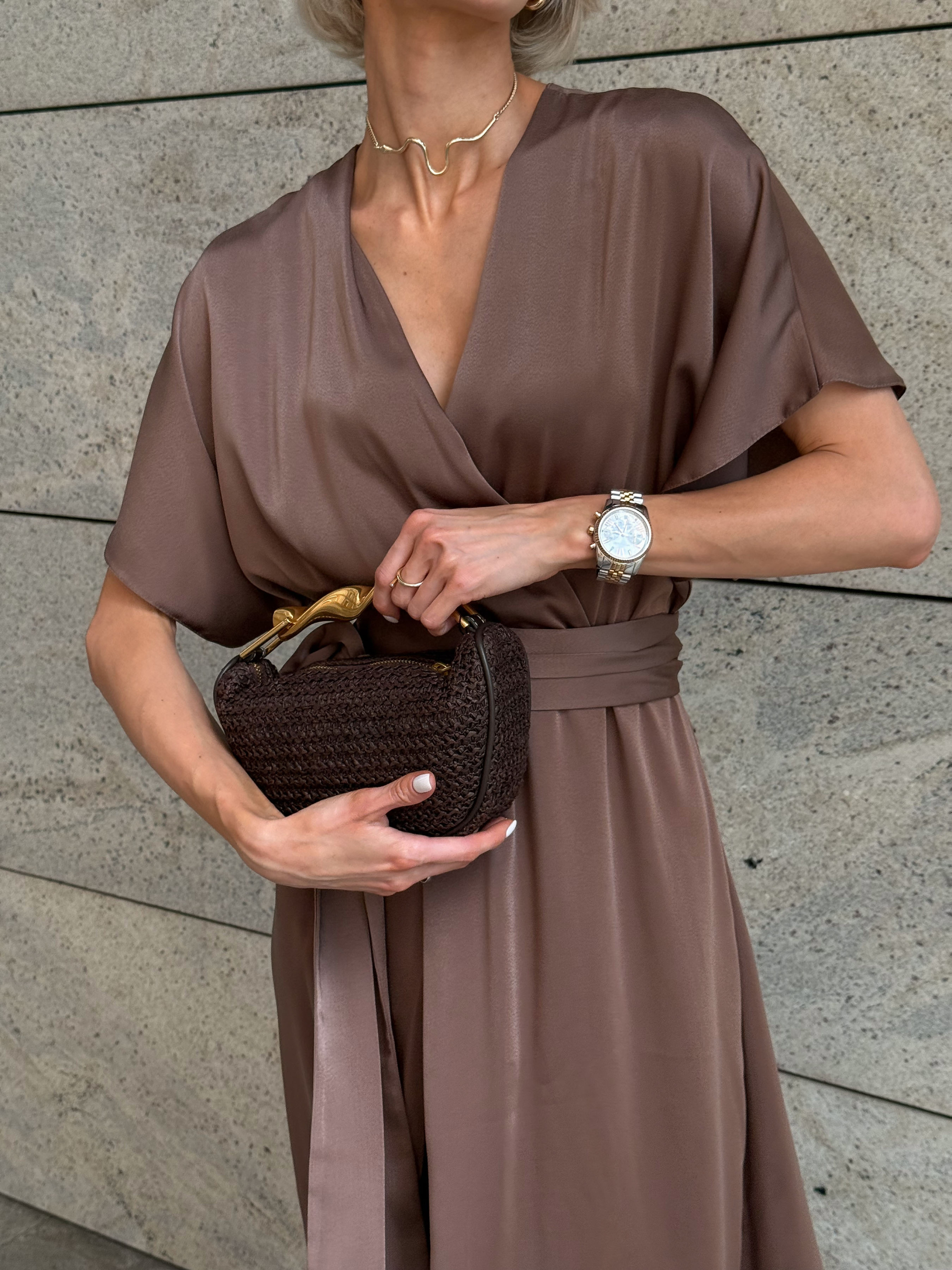 Ткань: шелк MANGO Состав: 97% полиэстер, 3% эластан. Цвет: голубой, молочный, черный, шоколад Размер: XS, S, M, L, XL Параметры модели на фото Рост: 174 см, ОГ: 84 см, ОТ: 60 см, ОС: 89 см. На фото на моделях представлена модель размер S (42/44). Комплектация: платье и пояс Фактические измерения изделия: XS Объем по груди: 80 см; Объем по талии (резинка): 54-56 см; Объем по бедрам: 90 см; Длина по спинке: 153 см; Длина изделия до талии: 40 см; Длина юбки: 113 см; Объем рукава сверху: 48,5 см; Длина рукава от шеи: 32 см; S Объем по груди: 84 см; Объем по талии (резинка): 58-70 см; Объем по бедрам: 94 см; Длина по спинке: 153 см; Длина изделия до талии: 40 см; Длина юбки: 113 см; Объем рукава сверху: 50 см; Длина рукава от шеи: 32 см; М Объем по груди: 88 см; Объем по талии (резинка): 62-74 см; Объем по бедрам: 98 см; Длина по спинке: 153 см; Длина изделия до талии: 40 см; Длина юбки: 113 см; Объем рукава сверху: 51,5 см; Длина рукава от шеи: 32 см; L Объем по груди: 92 см; Объем по талии (резинка): 66-78 см; Объем по бедрам: 102 см; Длина по спинке: 153 см; Длина изделия до талии: 40 см; Длина юбки: 113 см; Объем рукава сверху: 53 см; Длина рукава от шеи: 32 см; XL Объем по груди: 96 см; Объем по талии (резинка): 70-82 см; Объем по бедрам: 106 см; Длина по спинке: 153 см; Длина изделия до талии: 40 см; Длина юбки: 113 см; Объем рукава сверху: 54 см; Длина рукава от шеи: 32 см; Силуэт: Х-образный Рукав: цельнокройный Горловина: на запАх Декоративные элементы: асимметричная складка на юбке, съемный пояс Изящное платье макси длины с элегантным Х-образным силуэтом создано для тех, кто ценит комфорт, легкость и женственность. Модель выполнена из мягкой ткани шелка MANGO, которая приятно ложится по фигуре и создает эффектный силуэт. Платье подходит для торжеств, вечерних выходов или романтических свиданий. Асимметричная складка придает динамику образу, а съемный пояс позволяет изменять акценты в соответствии с настроением. Цветопередача на мониторе и телефоне может отличаться оттенками с цветом ткани.