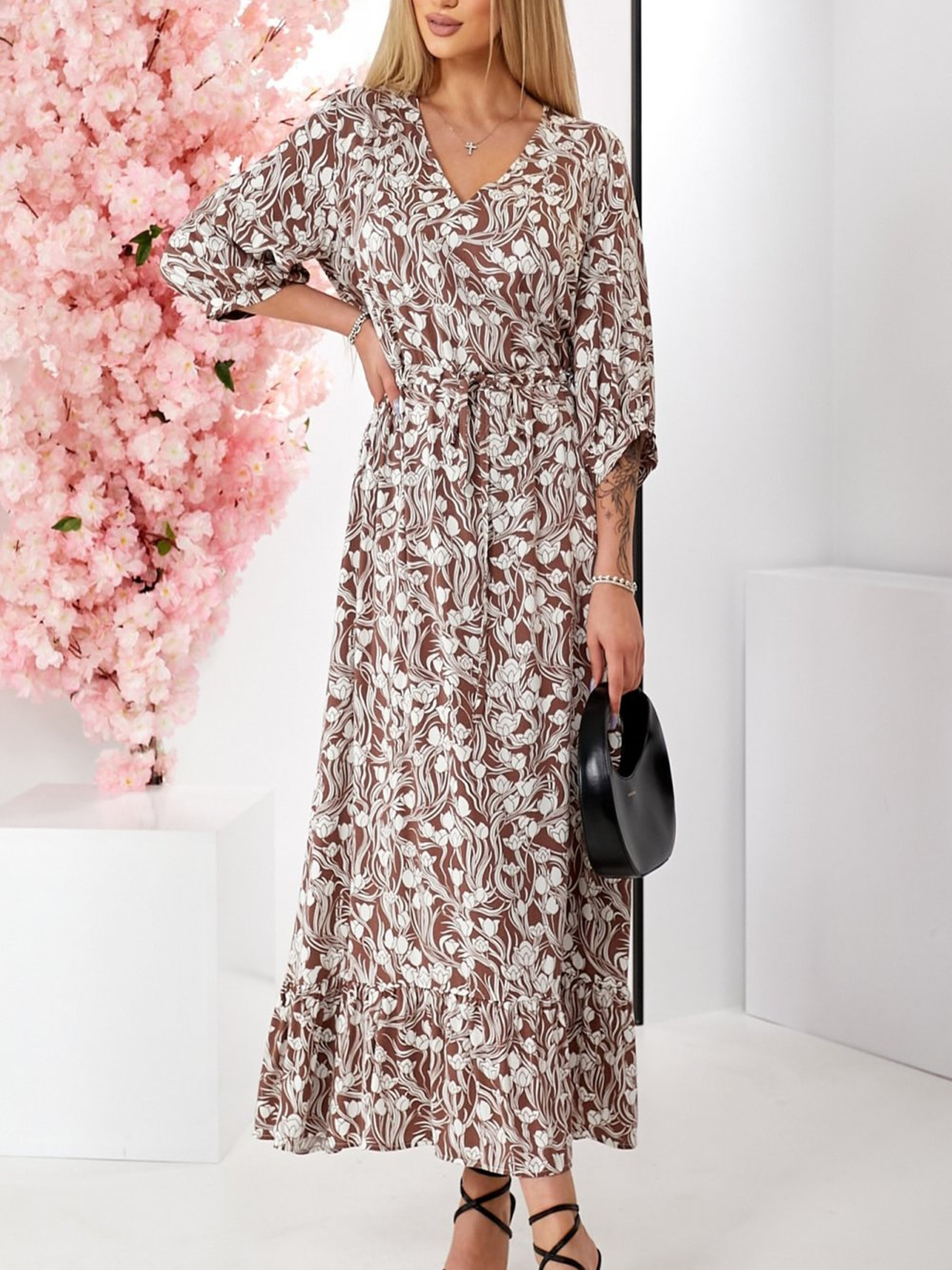 Сукня міді коричнева в білі квіти — жіночність, легкість і комфорт у кожному русі Ця сукня — втілення витонченості та природної елегантності. Ніжний квітковий принт на глибокому коричневому фоні створює романтичний і водночас вишуканий образ, який підходить для будь-якої нагоди — від прогулянок до офіційних зустрічей. Модель має пряму форму, але завдяки відрізній талії з куліскою ви можете легко регулювати посадку по фігурі, підкреслюючи силует. V-подібний виріз горловини візуально подовжує шию, додає легкості образу та пасує до різних типів фігури. Рюша по подолу надає легкості та динаміки, підкреслюючи рухи, а три чверті рукави з манжетами додають стриманої елегантності й зручності для повсякденного носіння. Переваги моделі: Модна довжина міді — ідеальна для міжсезоння та літніх днів Квітковий принт — завжди актуальний, жіночний акцент Прямий крій із куліскою на талії — універсальний для різних типів фігури V-подібний виріз — витягує силует, робить шию візуально довшою Рукави 3/4 з манжетами — зручні та стильні Ніжна рюша по низу — романтичний акцент Довжина виробу — 132 см — ідеальна для офісу, прогулянки або побачення Стиль: романтичний, повсякденний (casual), офісний Сезон: весна-літо, початок осені Довжина: міді (132 см) Крій: прямий, з куліскою на талії Деталі: рюша, V-виріз, рукави з манжетами Матеріал: легка тканина (уточнюється) Ця сукня вдало поєднує комфорт і стиль, дозволяючи вам виглядати елегантно без зайвих зусиль. Ідеальна для тих, хто цінує природність, легкість і функціональність.