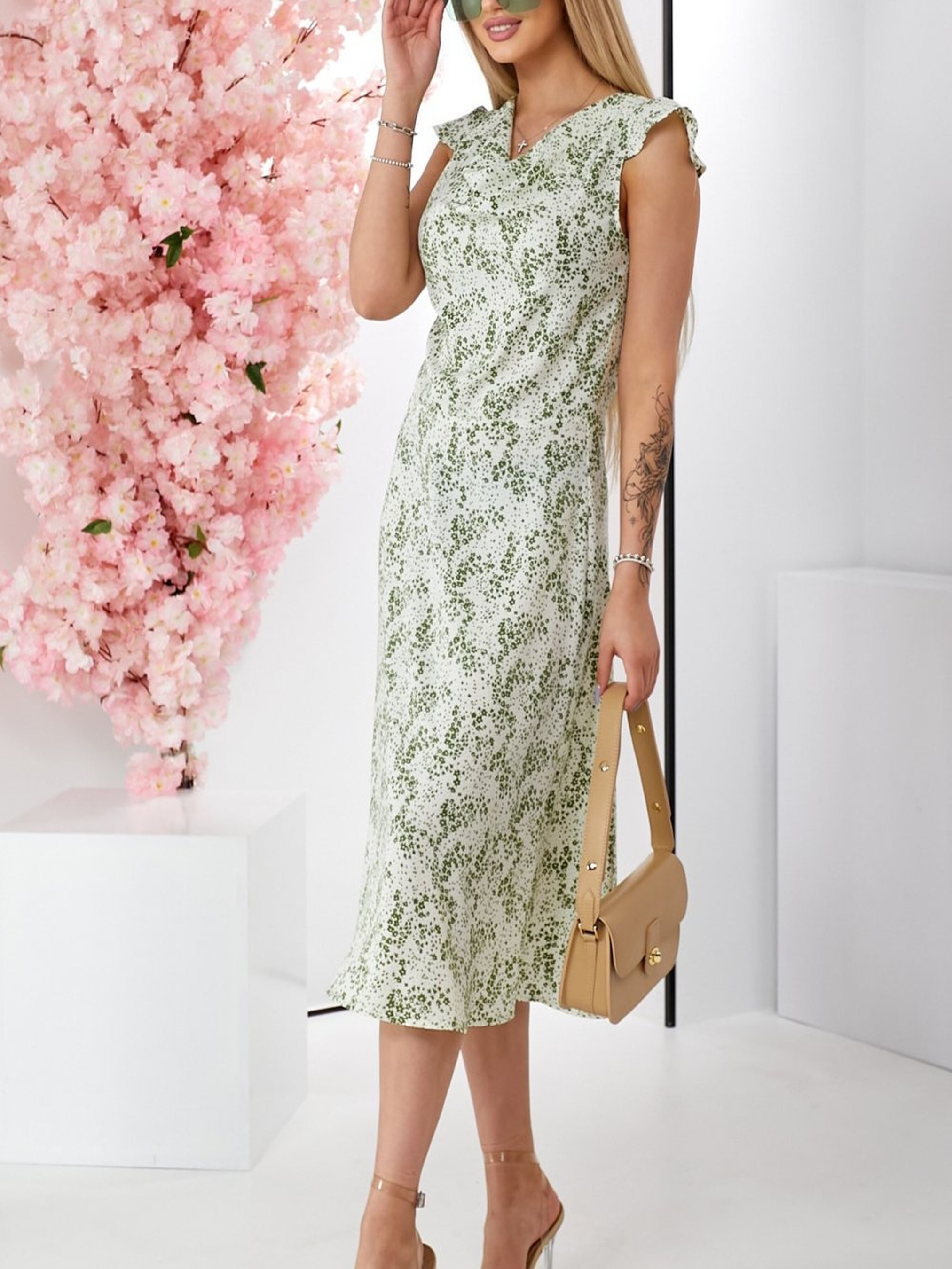 Сукня біла в зелені квіти з горловиною гойдалкою — витончений варіант для романтичного або повсякденного образу, що поєднує ніжність кольорів і жіночний крій. Особливості моделі: Горловина гойдалка: М’яке драпірування тканини в зоні декольте створює витончений акцент, додаючи образу легкості та елегантності. Квітковий принт: Зелені квіти на білому фоні створюють свіжий і весняний настрій. Принт виглядає ніжно, але водночас яскраво, не перевантажуючи образ. Легка тканина: сукня виготовлена з приємного до тіла матеріалу, що добре дихає та красиво лягає по фігурі. Ідеї для стилізації: Поєднуйте з босоніжками на підборах або зручними балетками для денного образу. Додайте мінімалістичні прикраси, наприклад, сережки-кільця або тонкий ланцюжок, аби підкреслити горловину. В прохолодну погоду сукню можна доповнити світлим кардиганом або джинсовою курткою. Ця сукня — ідеальне рішення для теплих днів, побачень, прогулянок або навіть літніх святкових подій.