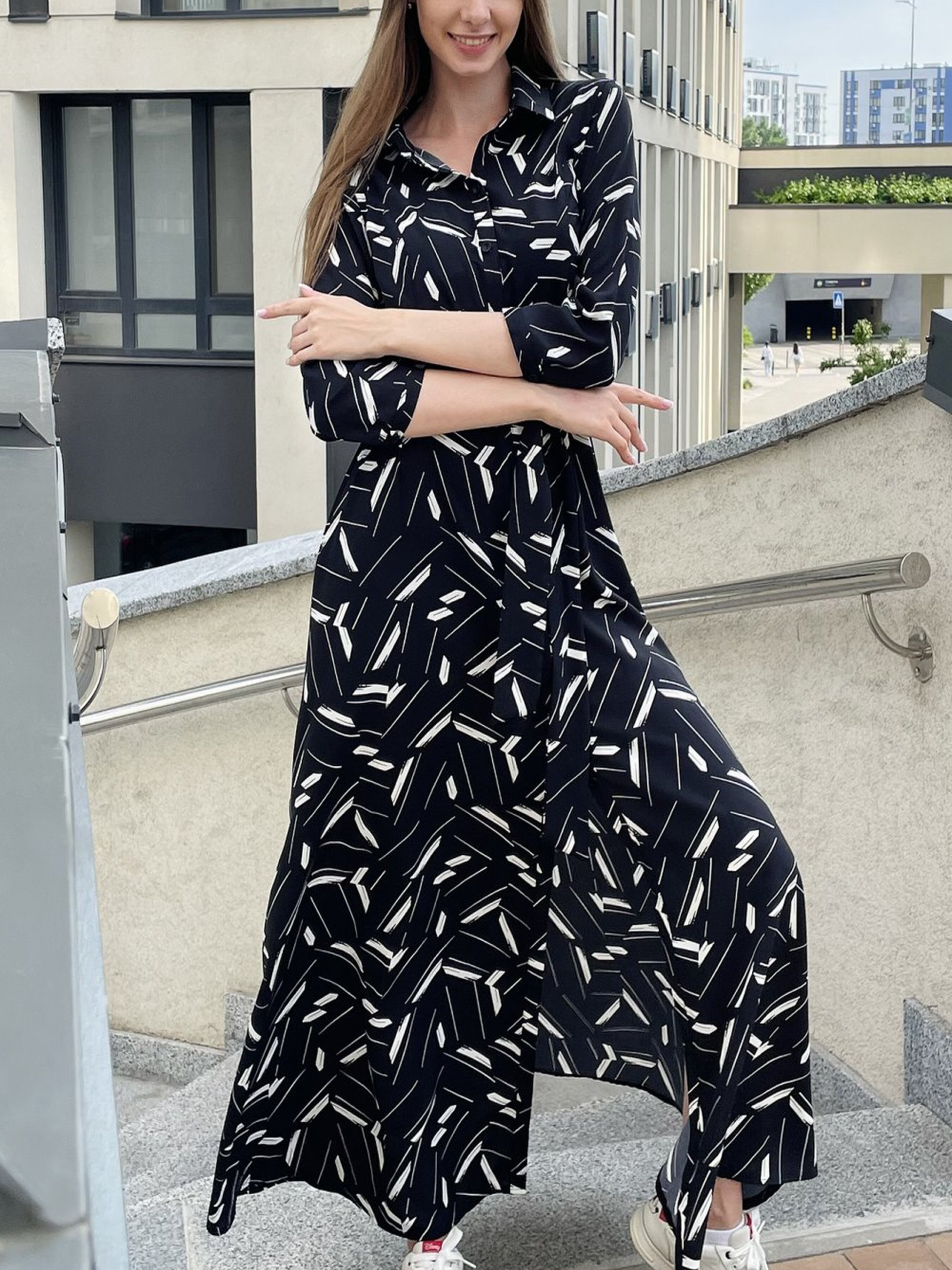 Сукня до підлоги чорна з білими полосками — елегантний вибір, що поєднує класичний стиль і сучасні акценти. Основні характеристики: Матеріал: Високоякісна тканина, що забезпечує комфорт і зручність. Крій: Прямий або широкий крій для ідеального вигляду та вільного руху. Рукава: Манжети на рукавах додають елегантності та структури. Спідниця: Довга до підлоги, що підкреслює витонченість і стиль. Закриття: На ґудзиках для зручного одягання. Пояс: Пояс на талії дозволяє підкреслити силует та додає стилю. Деталі: Чорний колір сукні з білими полосками створює стильний контраст і привертає увагу. Манжети на рукавах додають класичний вигляд і роблять сукню ще більш витонченою. Стилізація: Нарядний стиль: Чудово підходить для вечірніх подій або урочистих заходів завдяки своєму елегантному вигляду. Офісний стиль: Завдяки строгому крою та поясу, сукня також підходить для ділових зустрічей і офісної обстановки. Повсякденний стиль: Для неформальних подій, прогулянок або зустрічей з друзями вона стане відмінним вибором. Сукня до підлоги чорна з білими полосками — це універсальний і стильний варіант, який можна носити на різні випадки, поєднуючи класичну елегантність з сучасними трендами.