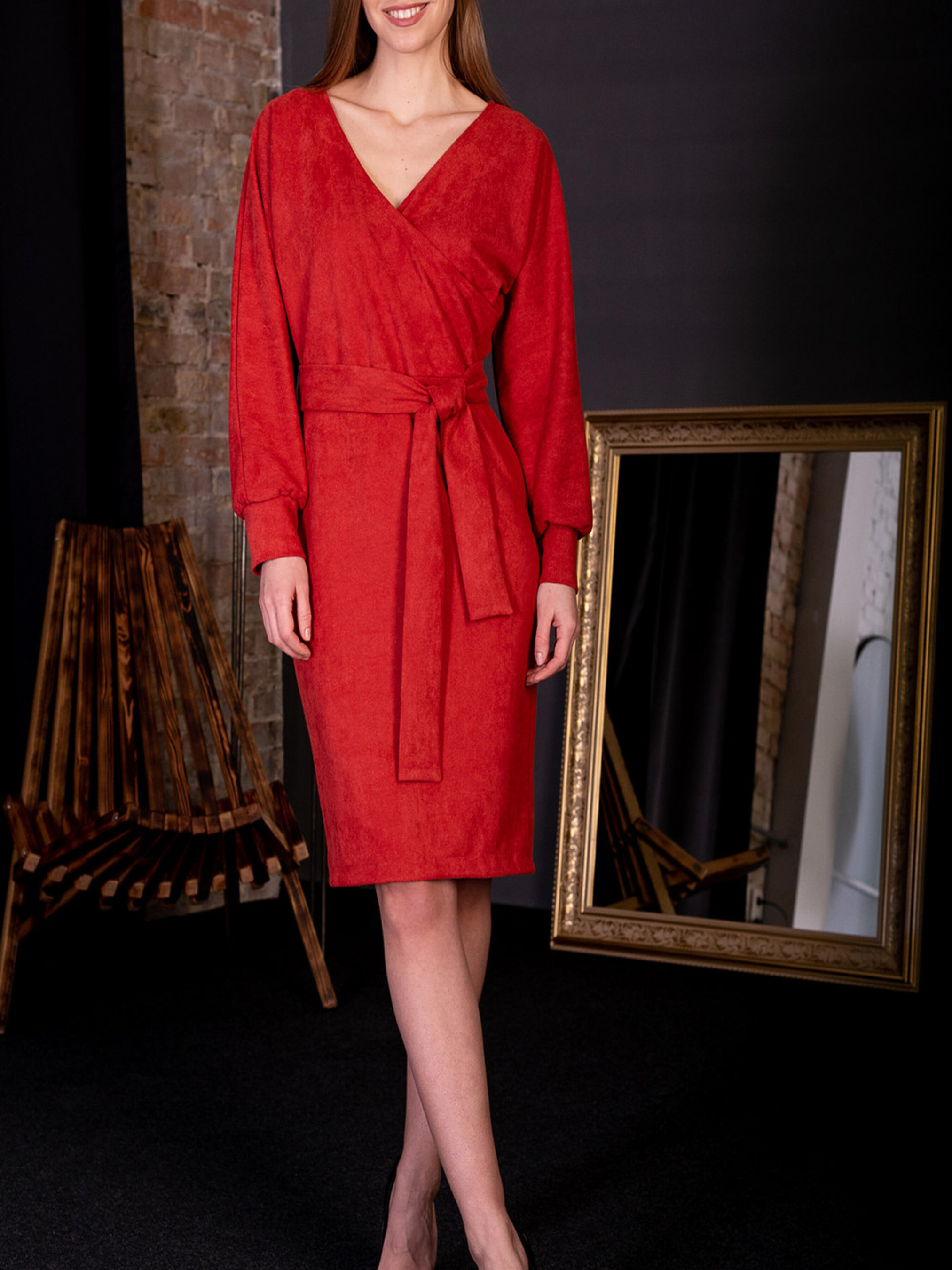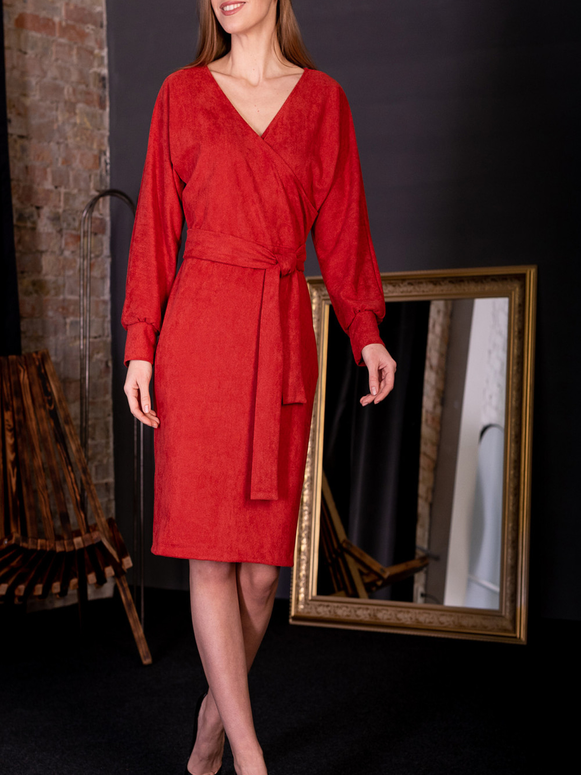 Сукня з червоного замшу — це вражаючий вибір для стильних і елегантних образів, який поєднує розкішний матеріал і сучасний дизайн. Червоний колір додає яскравості та виразності, підкреслюючи вашу індивідуальність та стиль. Завдяки класичному крою та елементам, як запах і пояс, ця сукня стане чудовим доповненням до вашого гардеробу в осінньо-зимовий сезон. Основні характеристики: Матеріал: Червоний замш — це матеріал, який додає сукні розкішного вигляду. М'яка текстура замшу не тільки приємна на дотик, але й виглядає стильно, підходить для вечірніх виходів та офісних заходів. Запах: Технологія крою на запах додає витонченості та елегантності сукні. Це класичний стиль, який робить сукню універсальною для будь-яких ситуацій. Вузький крій: Сукня має вузький крій, який підкреслює фігуру, створюючи стильний і елегантний силует. Такий фасон ідеально підходить для кокетливих образів, додаючи витонченості і жіночності. Через голову: Сукня надягається через голову, що робить її зручною у використанні та додає лаконічності дизайну. Пояс: Пояс дозволяє регулювати обсяг сукні і підкреслювати лінію талії, що додає ще більше елегантності та жіночності. Молнія: Наявність молнії ззаду або збоку дозволяє легко застібати сукню, зберігаючи при цьому чистоту ліній та елегантність фасону. Міді довжина: Міді довжина сукні — це ідеальний варіант для будь-якої події, підкреслюючи витонченість та елегантність, роблячи образ завершеним. Переваги: Червоний колір замшу додає яскравості та виразності образу. Запах і вузький крій підкреслюють фігуру, створюючи стильний та елегантний силует. Пояс на сукні дозволяє підкреслити лінію талії, додаючи жіночності. Молнія додає практичності і зручності при носінні. Міді довжина — це універсальний варіант, який підходить для будь-яких заходів, від офісу до святкових подій. Як стилізувати: Поєднайте цю сукню з елегантними чорними туфлями на підборах і золотими аксесуарами для створення розкішного і стильного образу. Можна додати тонку сумку або клатч, щоб завершити вечірній вигляд. Для більш повсякденного стилю можна носити з класичними ботильйонами. Сукня з червоного замшу — це елегантний і стильний вибір для тих, хто хоче виглядати розкішно та впевнено в будь-якій ситуації.