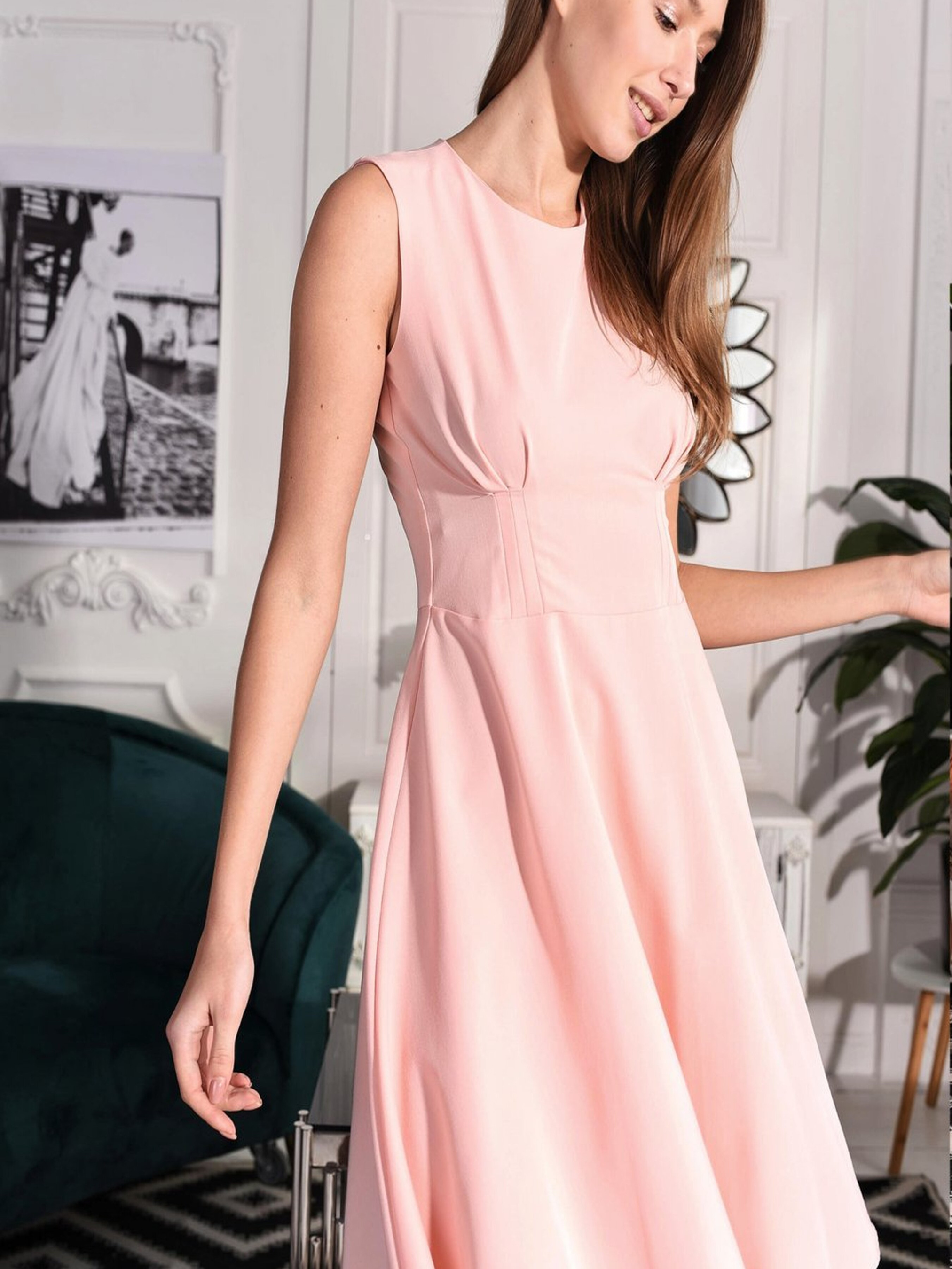 Рожева сукня із защипами — це елегантний і ніжний вибір для весняно-літнього сезону, який підкреслить вашу індивідуальність і створить легкий, романтичний образ. Сукня поєднує стиль і комфорт, що робить її ідеальним варіантом як для повсякденних днів, так і для більш урочистих заходів. Основні характеристики: Колір: Рожевий відтінок додає сукні м'якості та жіночності, ідеально підходить для теплих весняних і літніх днів. Защипи: Защипи на сукні створюють красиві складки, що додають об'єму та елегантності, роблячи силует витонченим і легким. Комір: Круглий комір додає класичної простоти і вишуканості, підкреслюючи лінію шиї і додаючи невимушеності образу. Застібка: Сукня застібається на молнію, що робить її зручною та практичною для носіння. Без рукавів: Відсутність рукавів дозволяє відчувати комфорт навіть в найспекотніші дні, роблячи сукню ідеальною для літніх прогулянок чи свят. Переваги: М'який рожевий колір додає жіночності та романтичності. Легкі защипи створюють витончений і стильний вигляд. Крулий комір додає класичної елегантності. Молнія забезпечує зручність і швидкість одягання. Ідеально підходить для літніх прогулянок, дружніх зустрічей або навіть для романтичних побачень. Як стилізувати: Сукня виглядатиме чудово з легкими босоніжками або сандалями на плоскій підошві. Для створення більш офіційного образу можна доповнити сукню елегантними серйозними аксесуарами та витонченими туфлями. Підходить як для повсякденних прогулянок, так і для урочистих заходів, де важлива легкість і стиль. Рожева сукня із защипами — це вишуканий і універсальний елемент літнього гардеробу, який додасть вам елегантності і витонченості у будь-якій ситуації.