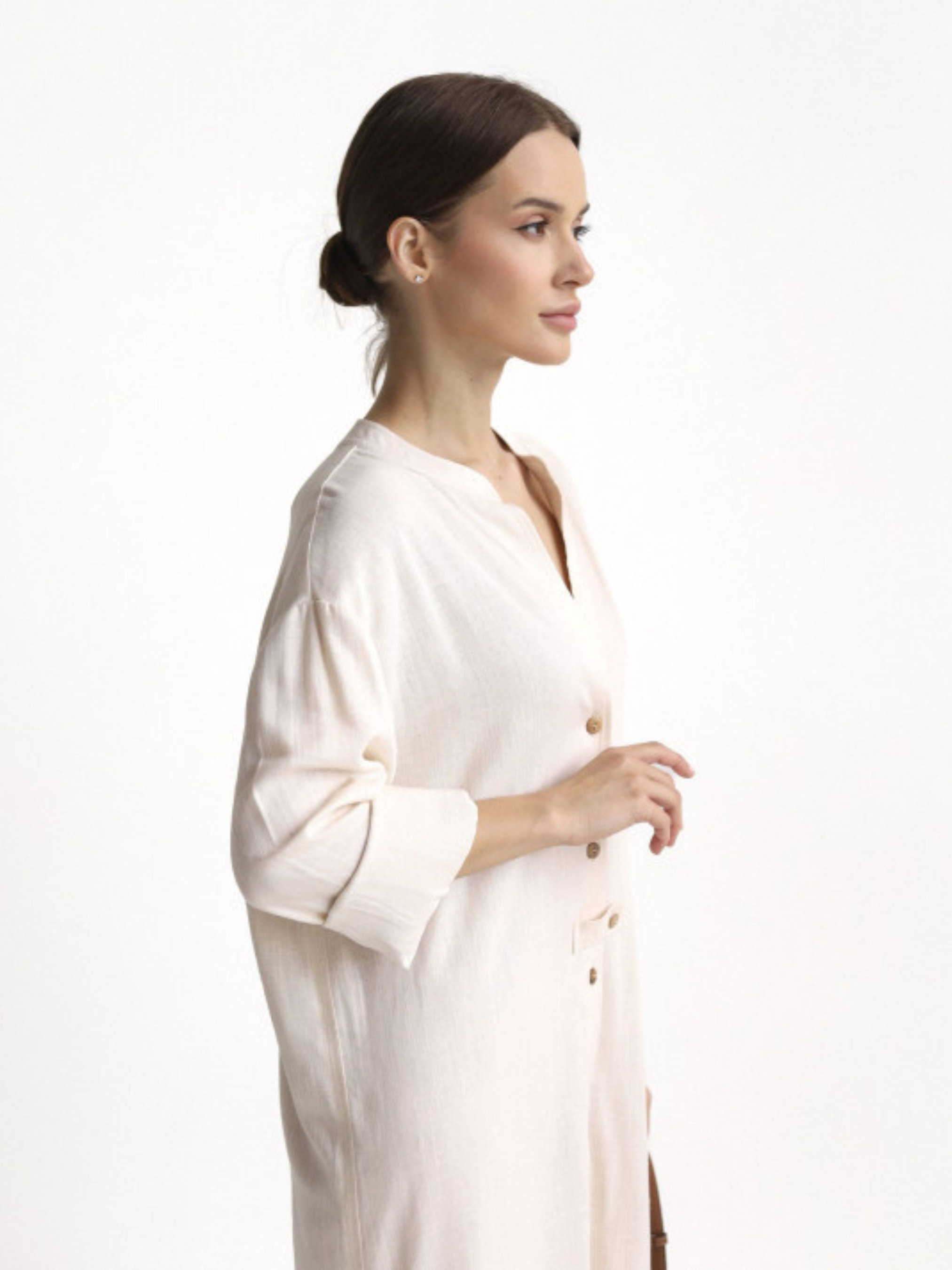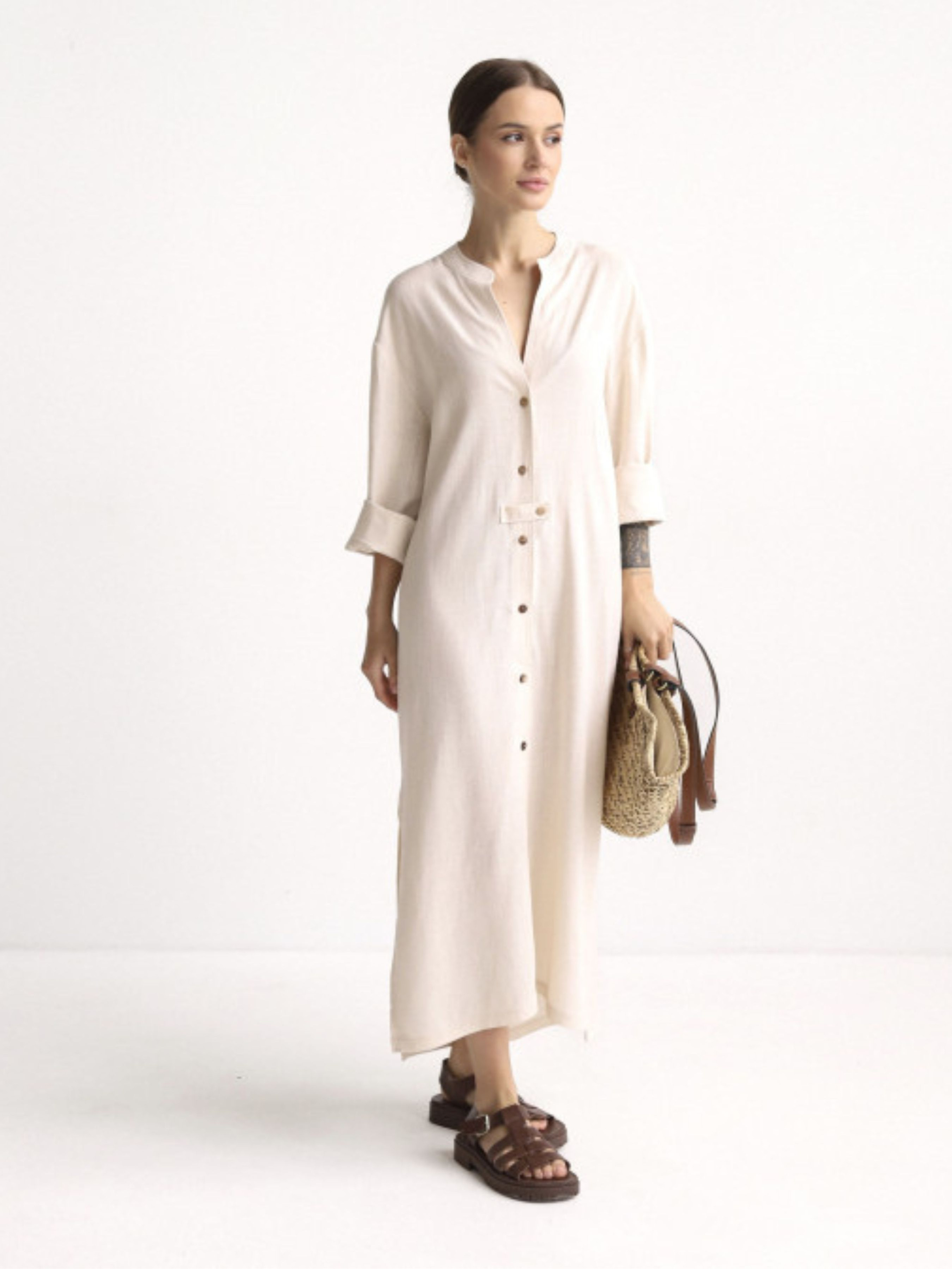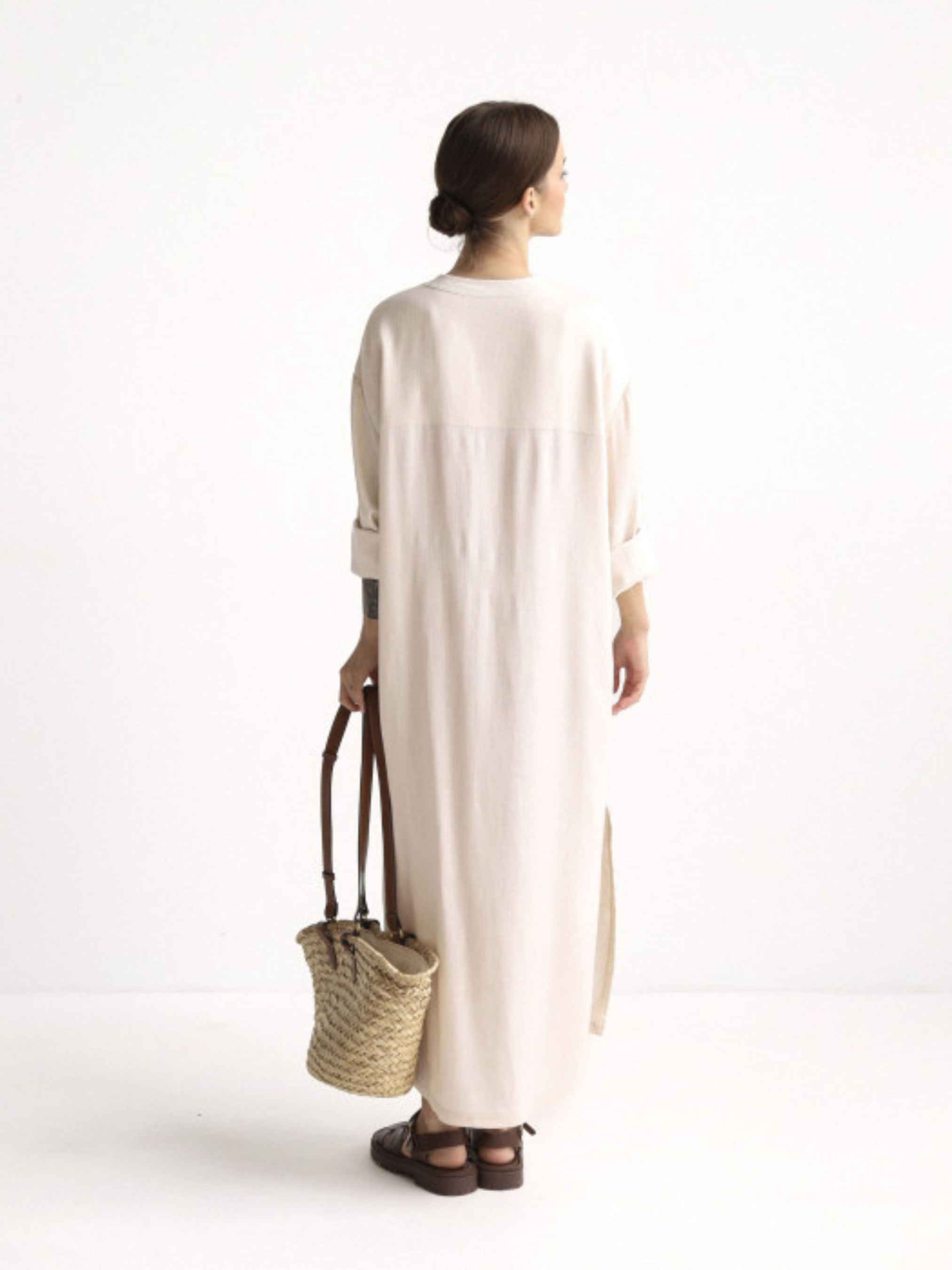Универсальное, как летнее утро в Одессе — платье-рубашка из натурального льна с добавлением коттона создана для тех, кто выбирает легкость, свободу и уверенность в каждом шагу. Она не требует лишних слов – достаточно застегнуть пуговицы и выйти в город или на прогулку у моря. Прямой крой, мягкий воротник-стойка, разрезы по бокам и длина меди – это база, которая адаптируется под твой ритм и настроение. Носить ее можно как отдельно, так и поверх купальника или с любимыми босоножками.