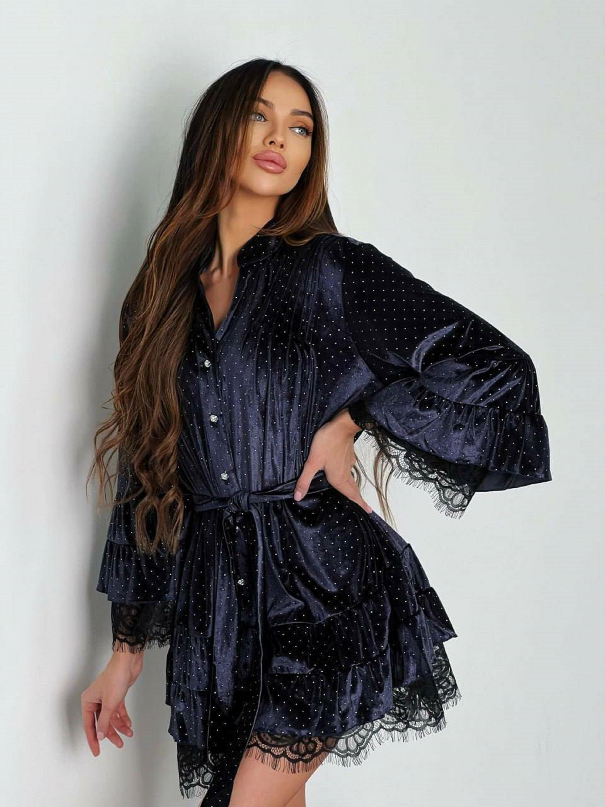 Особливості та переваги сукні Miami: Широкий крій, підходить на розміри 42-46; Велюр з вишуканими стразами додає елегантного блиску; Ґудзики з камінням – стильна деталь декору; Тканинний пояс підкреслює талію та додає жіночності; Легко поєднується з різним взуттям та аксесуарами – від кросівок до вечірніх туфель. Характеристики: Тканина: велюр зі стразами Розмір: єдиний 42-46 Кольори: беж, темно-синій Цього сезону обов’язково поповніть свій гардероб модною сукнею Miami, щоб відчути себе найпривабливішою та чарівною. Стильна модель з м’якого велюру прикрашена блискучими стразами, які створюють святковий та ефектний образ. Широкий крій і тканинний пояс роблять силует універсальним та комфортним для різних типів фігури.