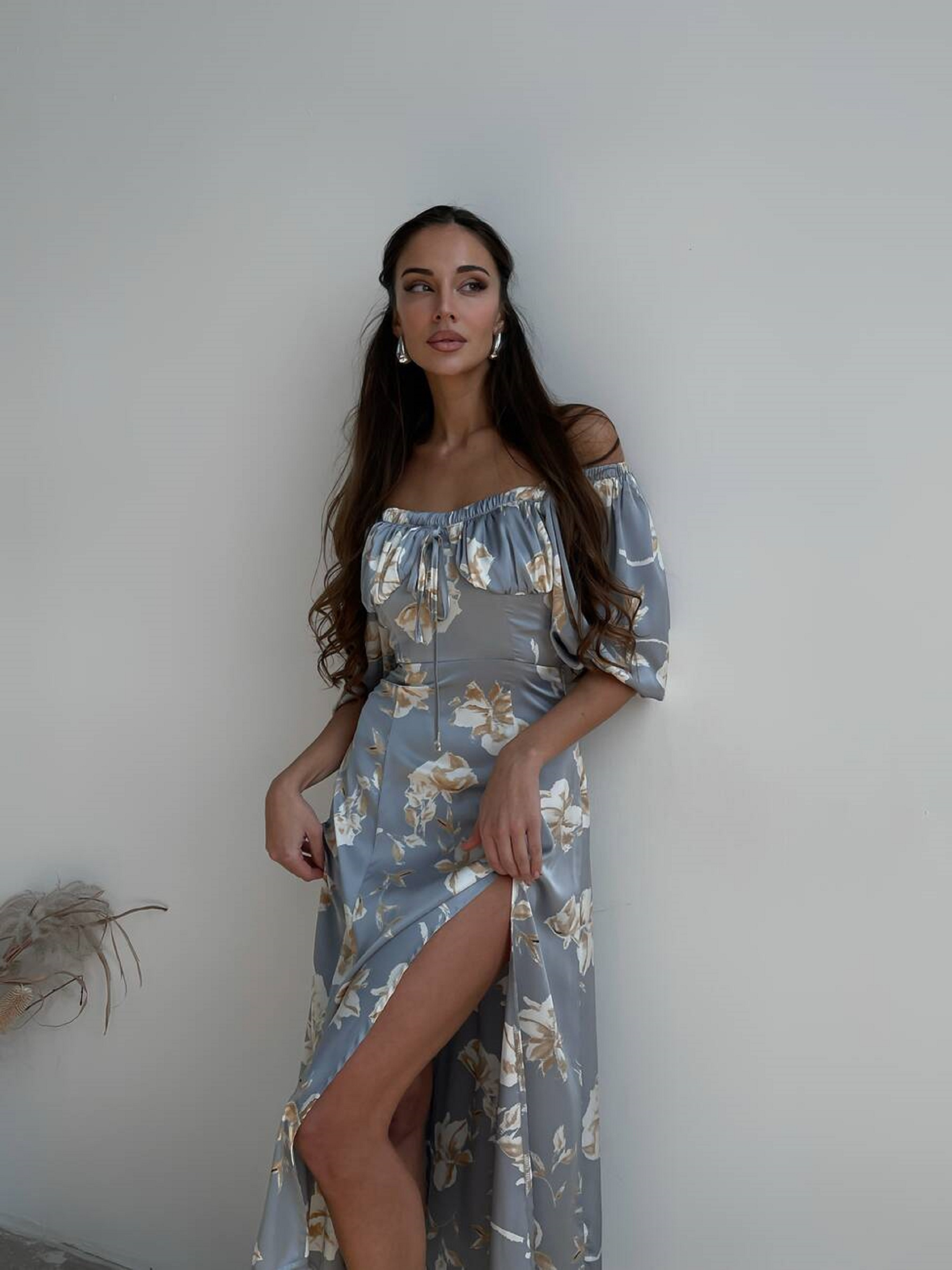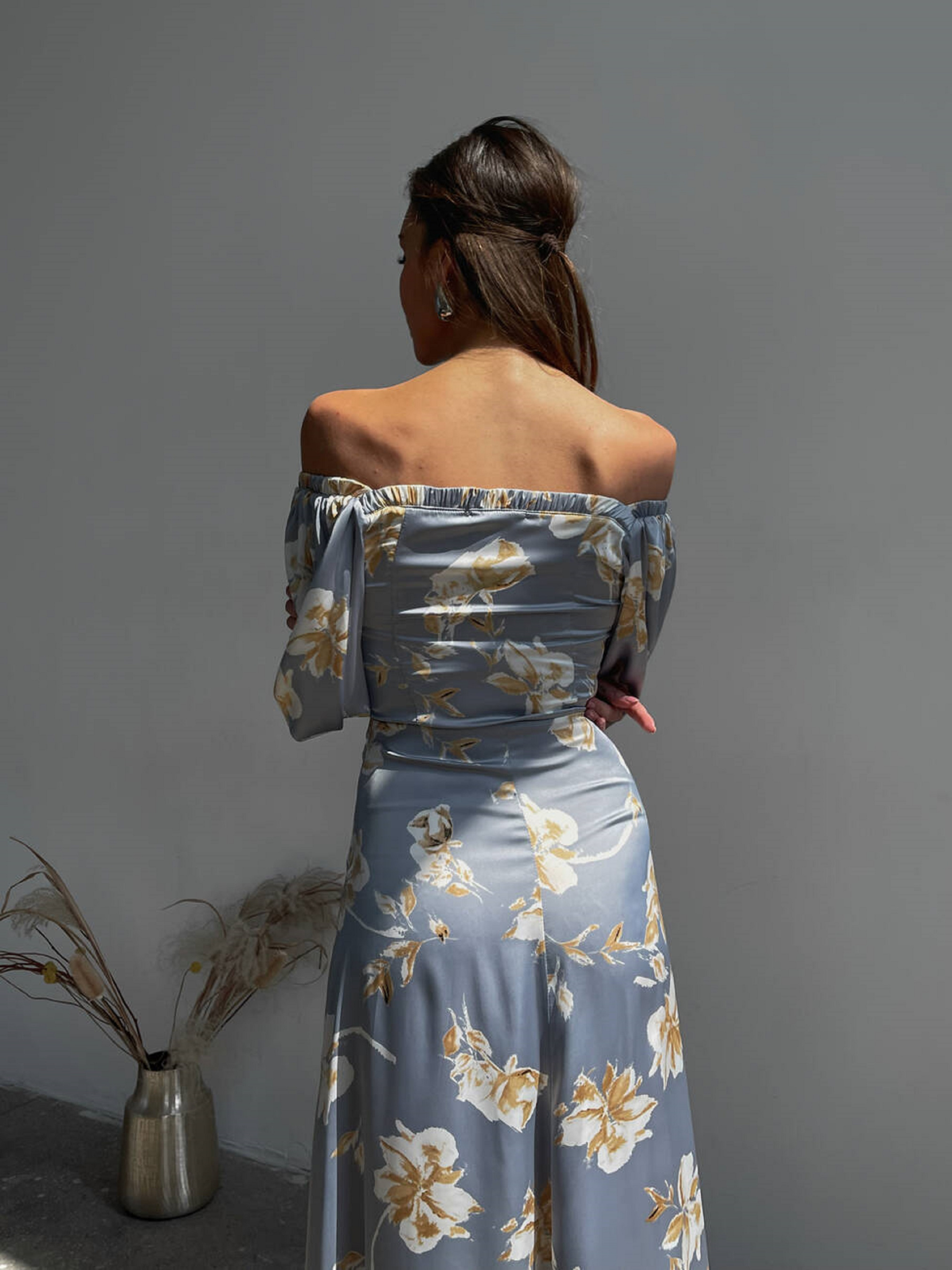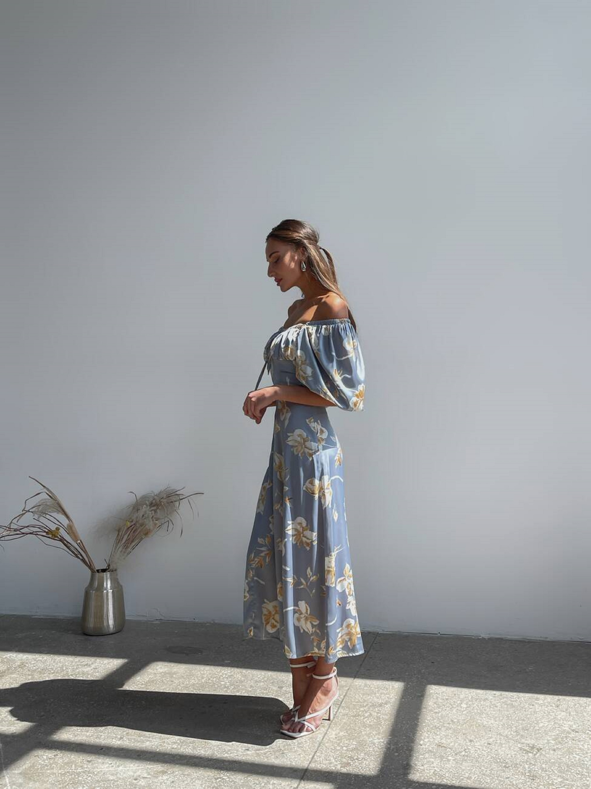 Особливості та переваги сукні SOFI: Напівприлеглий силует підкреслює талію; Відкрите декольте створює звабливий акцент на ключицях; Легка тканина шовк Армані забезпечує комфорт у спекотні дні; Довжина сукні робить її ідеальною для прогулянок, вечірок чи літніх подій; Поєднується з босоніжками, туфлями на підборах та легкими аксесуарами. Характеристики: Тканина: шовк Армані Розмір: S (42-44), M (44-46) Кольори: ніжний принт з ліліями Легка і елегантна літня сукня SOFI створена для того, щоб підкреслити витонченість фігури. Модель ніжно відкриває плечі та декольте, а довжина сукні акцентує красу ніг, створюючи романтичний і жіночний образ.