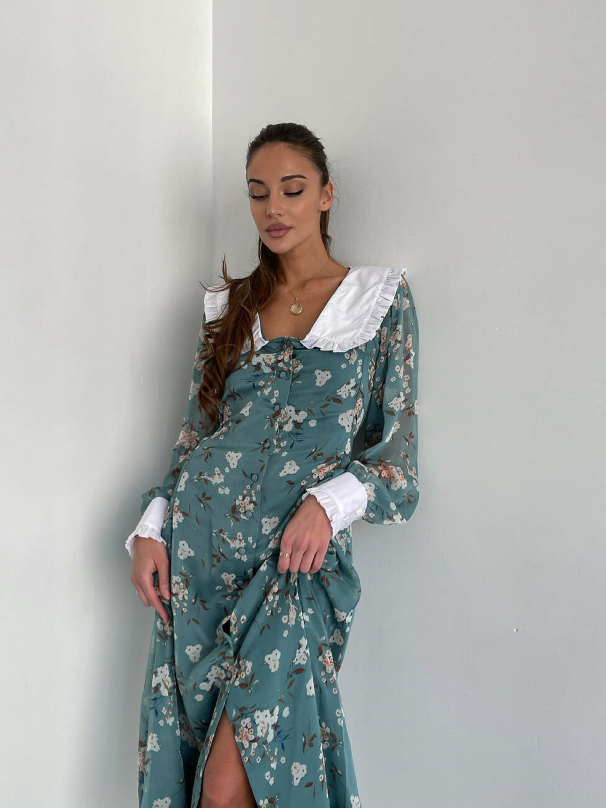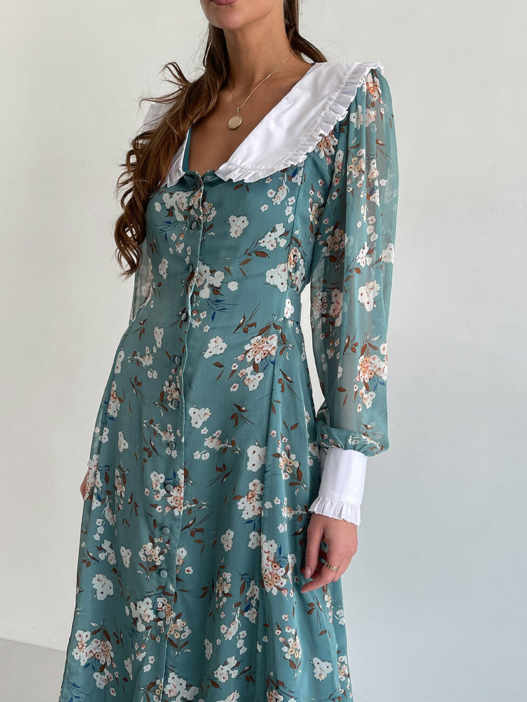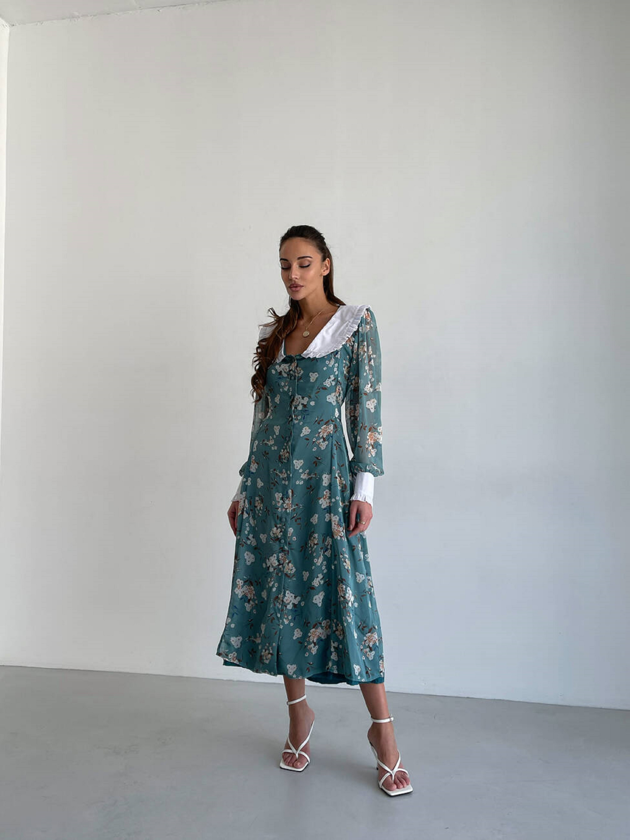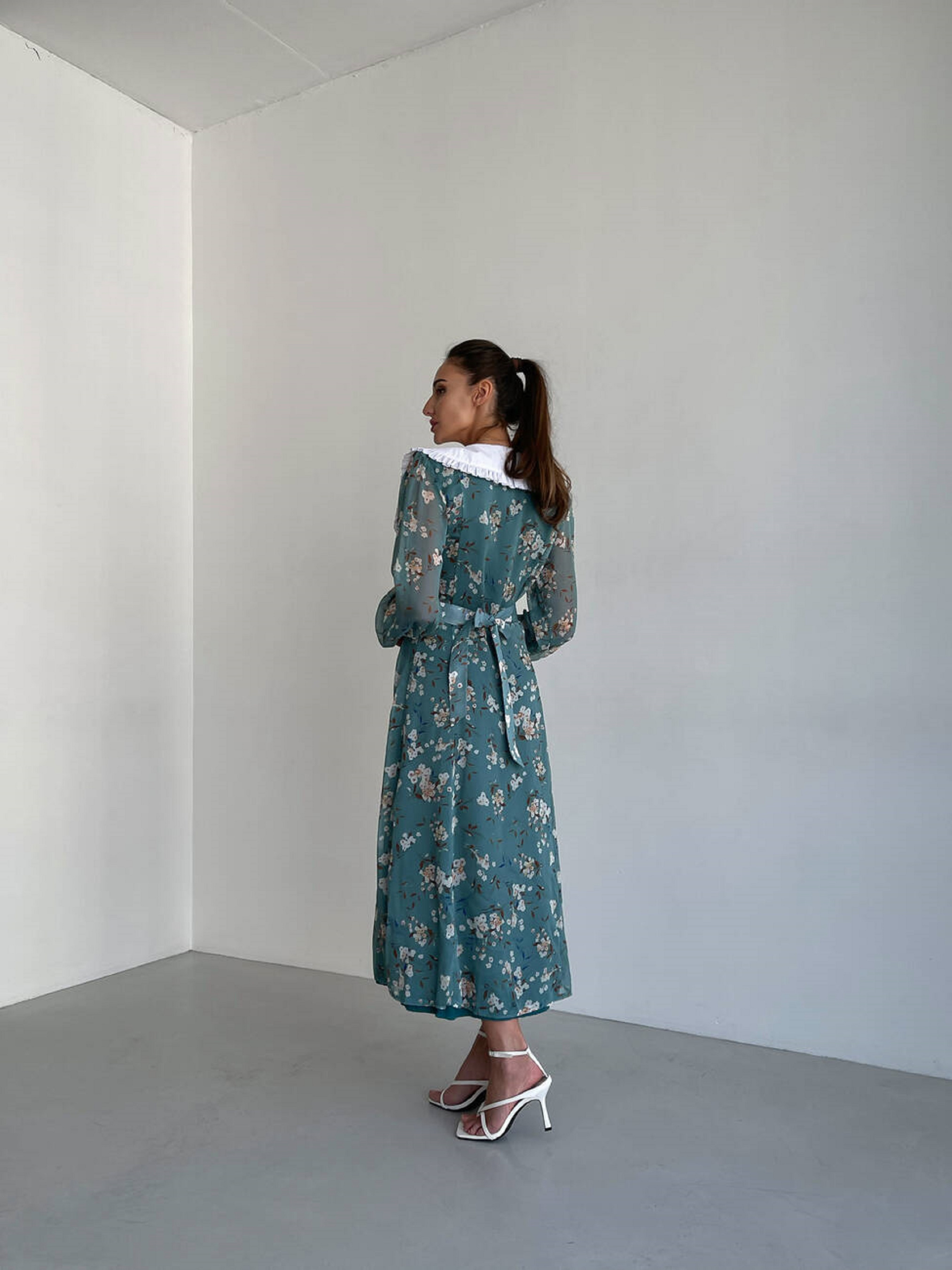 Особливості та переваги сукні VENETTA: Довжина міді, напівприлеглий силует; Білий комірець і манжети підкреслюють елегантність; Вшитий пояс зав’язується на бант позаду, ефектно формуючи талію; Матеріал – шифон, легкий та приємний на дотик; Легкий догляд: машинне делікатне прання при 30°; Характеристики: Тканина: шифон Розмір: S/M, M/L Кольори: зелений принт Ніжне плаття з повітряного шифону з чарівним квітковим принтом. Елегантності моделі надають білий комірець та манжети, які роблять образ вишуканим і жіночним. Підходить для поєднання з будь-яким взуттям і аксесуарами (туфлі, босоніжки, черевики).