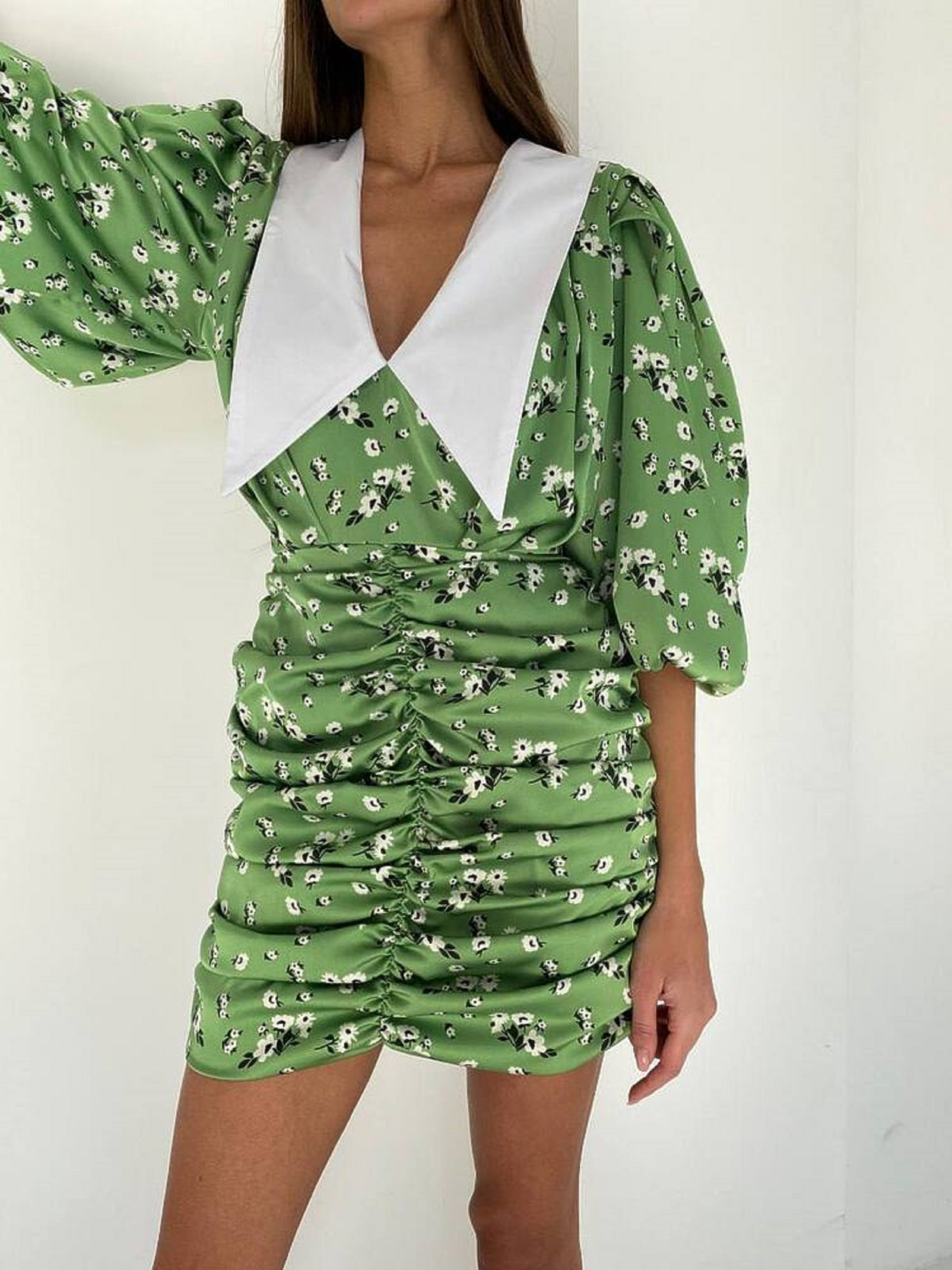 Характеристики: Тканина: шифон з підкладкою Силует: приталений Рукави: ¾, повітряні Застібка: потайна блискавка по спинці Пояс: знімний, регулює посадку по талії Розміри: S, M, L Кольори: зелений Догляд: Ручне прання при температурі до 30 °C Використовувати м’які миючі засоби Не віджимати та не сушити в сушарці Прасувати при низькій температурі через тканину Ніжна та витончена сукня створена для романтичних і повсякденних образів. Сукня з м’якого легкого шифону прикрашена дрібним квітковим принтом, має злегка приталений силует і повітряні рукави ¾. Верх моделі оздоблений оборками та V-подібним вирізом, який підкреслює лінію шиї. У комплекті йде знімний пояс із тієї ж тканини, що дозволяє регулювати посадку по талії. Модель застібається на потайну блискавку по спинці, а легка підкладка забезпечує комфорт під час носіння.