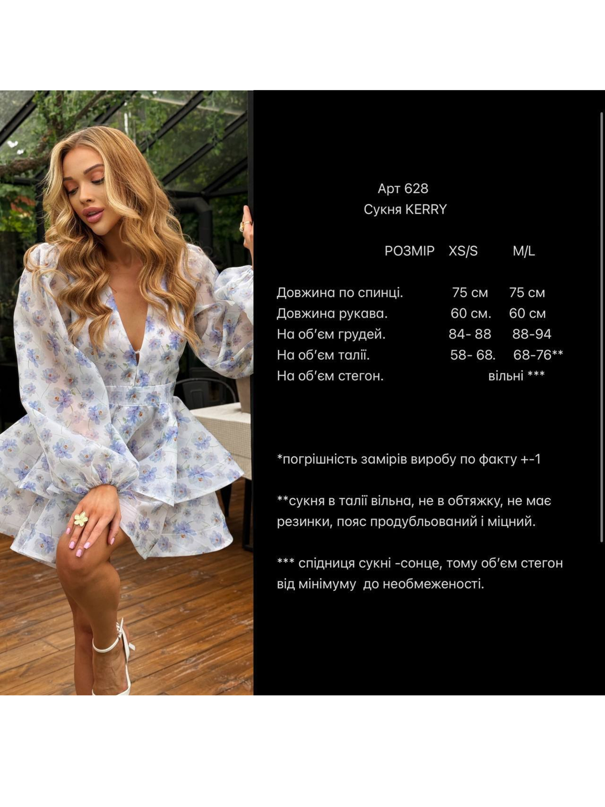 Характеристики: Тип виробу: сукня святкова Фасон: приталений верх, легка спідниця Виріз горловини: V-подібний Довжина рукава: короткий Довжина сукні: міді Тканина: органза принтована Підкладка: 100% бавовна Розміри: XS/S, M/L Принти: гортензія, сакура, рожева орхідея, блакитна квітка, півонії рожева Догляд: делікатне машинне прання при температурі до 30 °C прасування з вивороту при середній температурі до 150 °C не відбілювати не використовувати хімічну чистку сушити в тіні у розкладеному вигляді Особливості та опис: Сукня KERRY — це поєднання легкості, жіночності та ніжності. Виконана з прозорої принтованої органзи, вона створює ефект легкого сяйва та чудово тримає форму. Завдяки натуральній бавовняній підкладці виріб приємний до тіла й комфортний у носінні навіть у спекотну погоду. V-подібний виріз елегантно підкреслює лінію шиї та декольте, додаючи образу витонченості. Верхня частина сукні м’яко облягає фігуру, плавно переходячи у розкльошену спідницю, що красиво рухається під час ходи. Романтичні квіткові принти — гортензії, сакури, орхідеї та півонії — створюють святковий настрій і надають образу свіжості. Ця модель стане чудовим вибором для урочистих подій, вечірок або літніх свят. Сукня KERRY — це гармонія стилю, ніжності та природної краси, яка підкреслить індивідуальність кожної жінки.