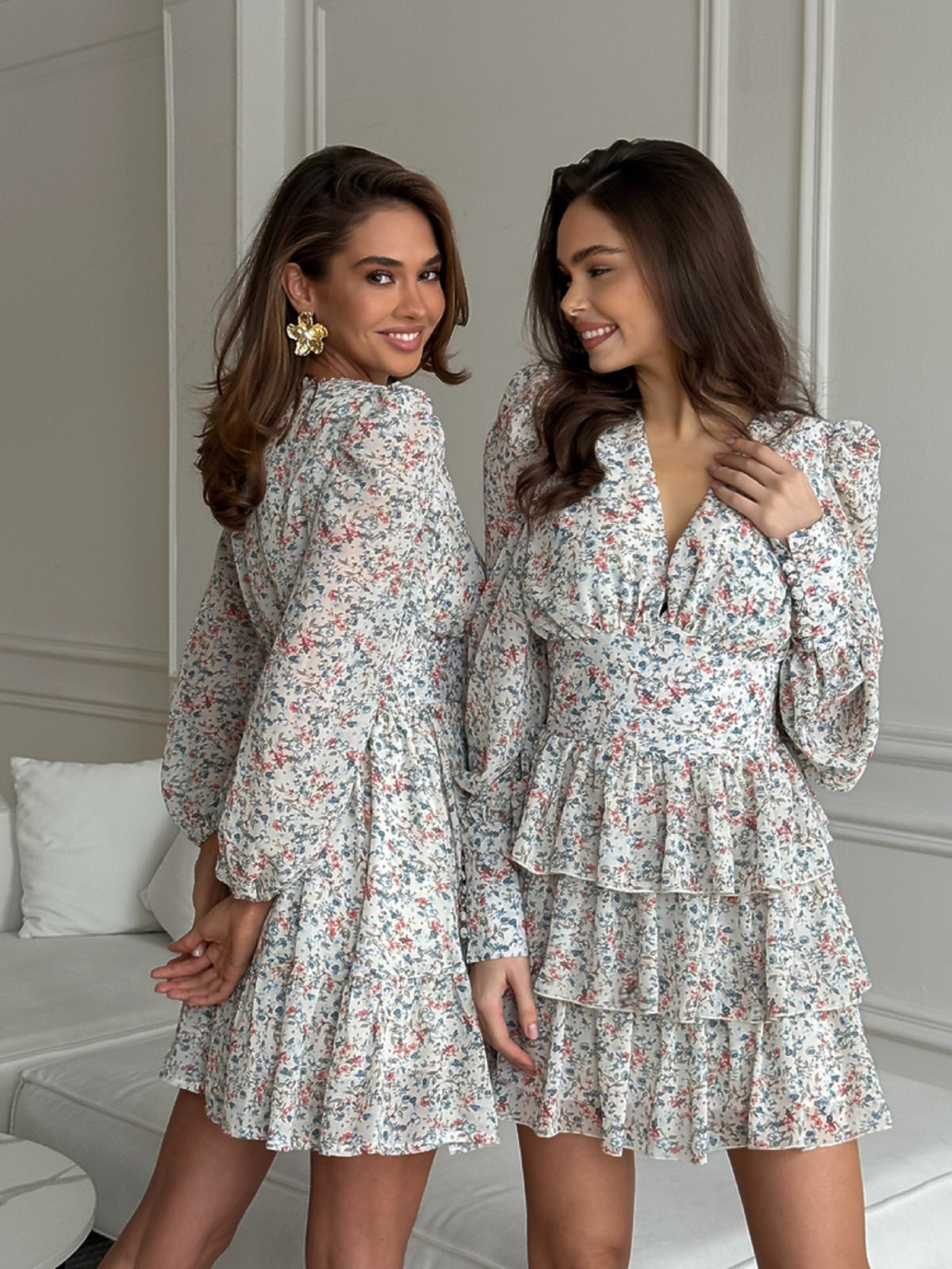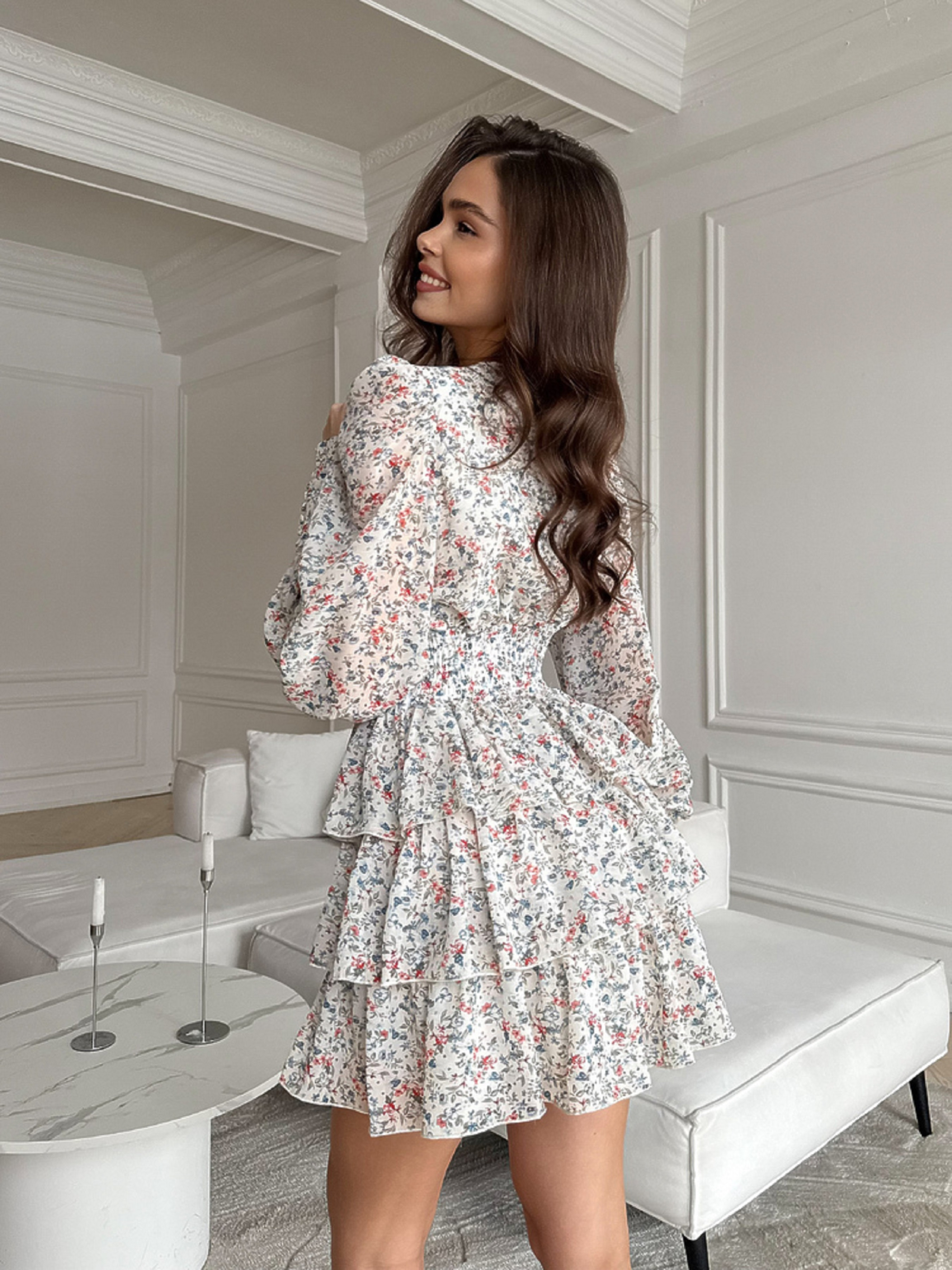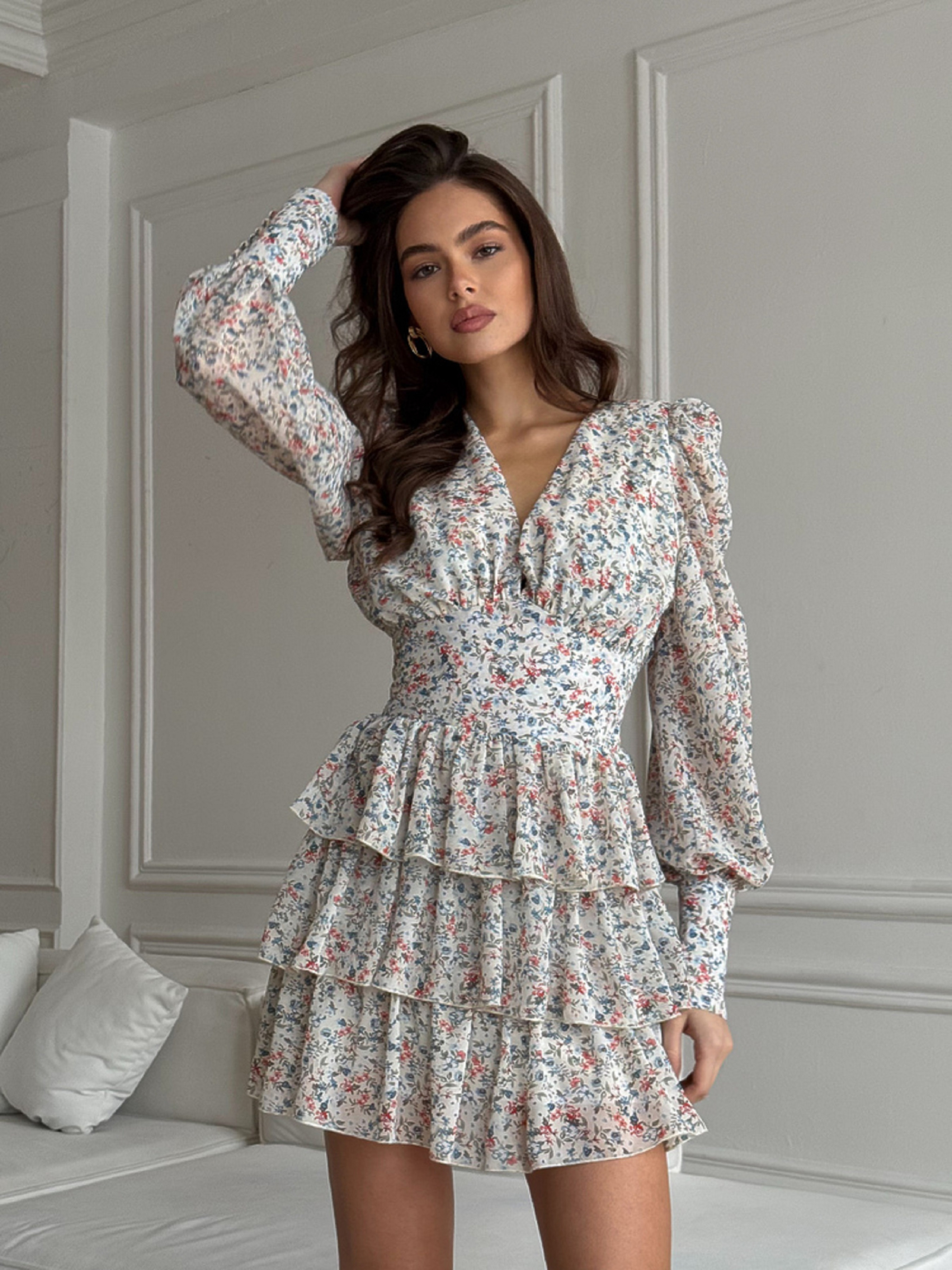 Характеристики: Виріз горловини: V-подібний Довжина рукава: довгий Фасон: приталений верх, розкльошена спідниця Матеріал верху: шифон люксової якості Підкладка: 100% бавовна Колір: дрібні квіти Розмір: one size (S,M; S,L) Як носити: Сукня VIKKY ідеально поєднується з босоніжками, балетками або чобітками на низькому ходу. Додайте джинсову або шкіряну куртку — і образ готовий як для романтичного побачення, так і для прогулянки містом. Неймовірно тендітна та романтична сукня VIKKY створена для тих, хто цінує легкість і жіночність. Легка тканина, повітряний крій і ніжний квітковий принт надають образу витонченості та шарму. Сукня має V-подібне декольте, що красиво підкреслює зону шиї та ключиць. Лінія талії зі злегка утягуючим ефектом вигідно формує силует, а еластична резинка по спинці забезпечує комфорт і посадку по фігурі. Рукави з широкими манжетами, оздобленими ґудзиками, обтягнутими тією ж тканиною, додають елегантності. Пишна тришарова спідниця створює відчуття легкості й руху при кожному кроці.