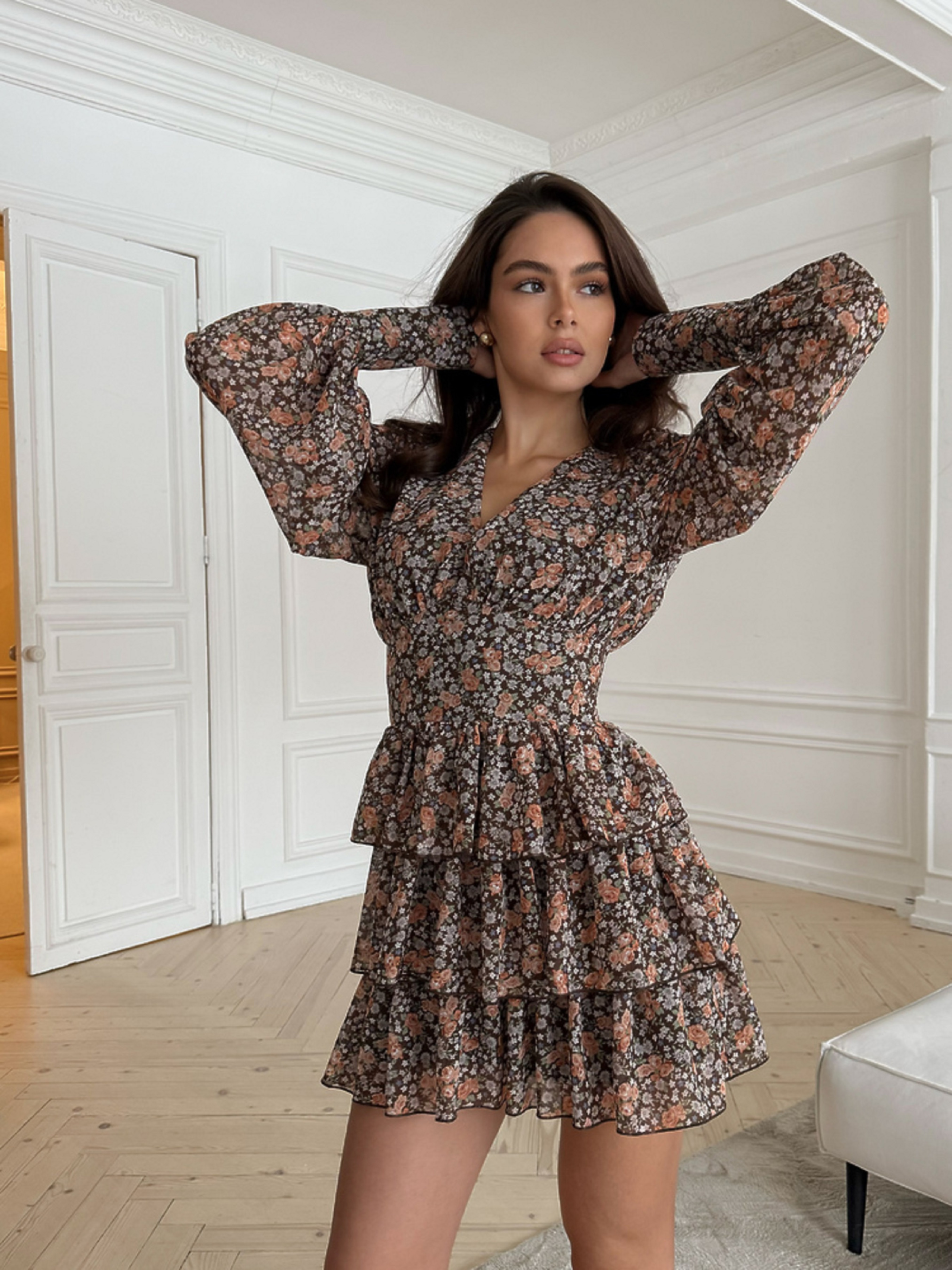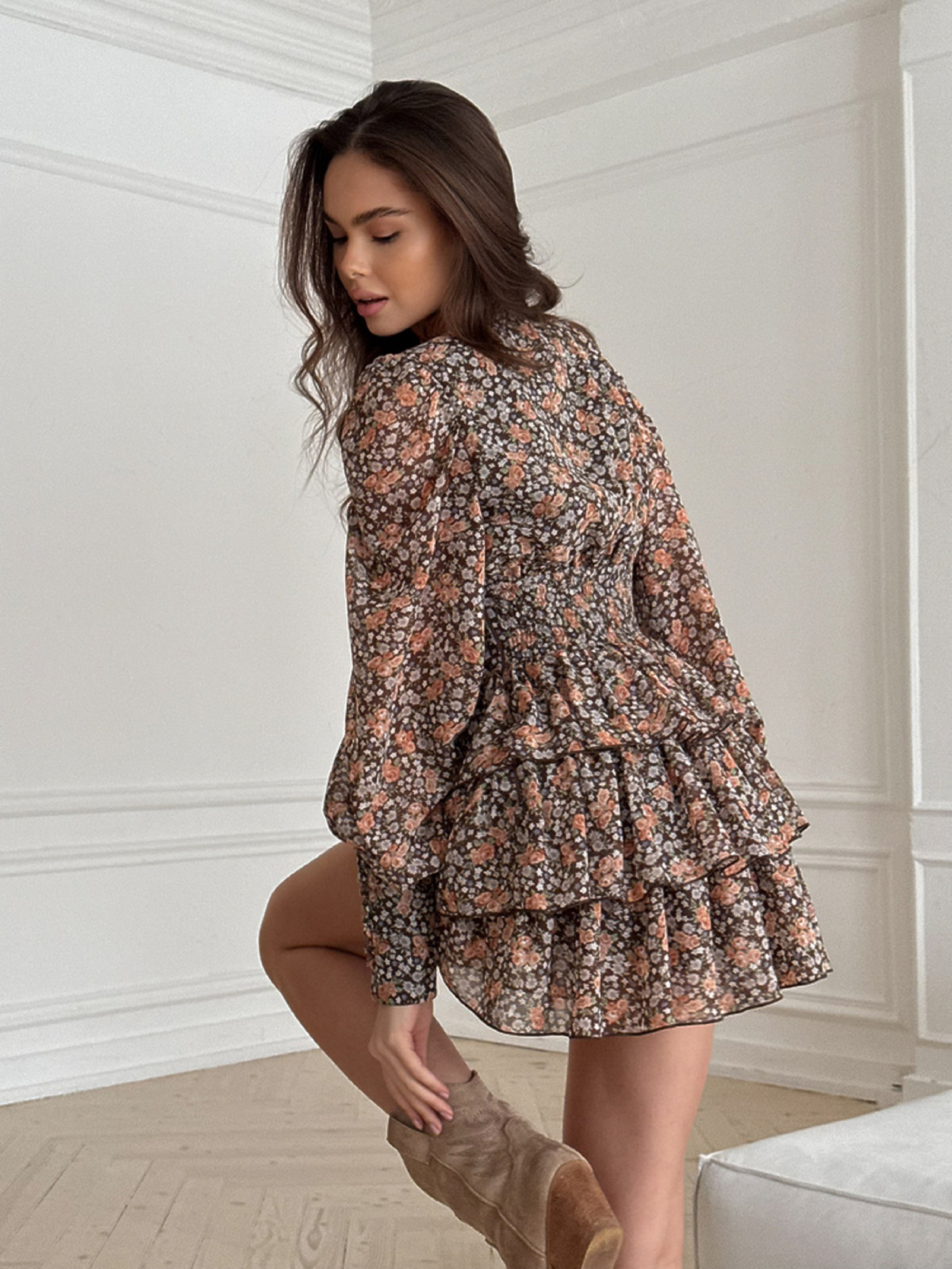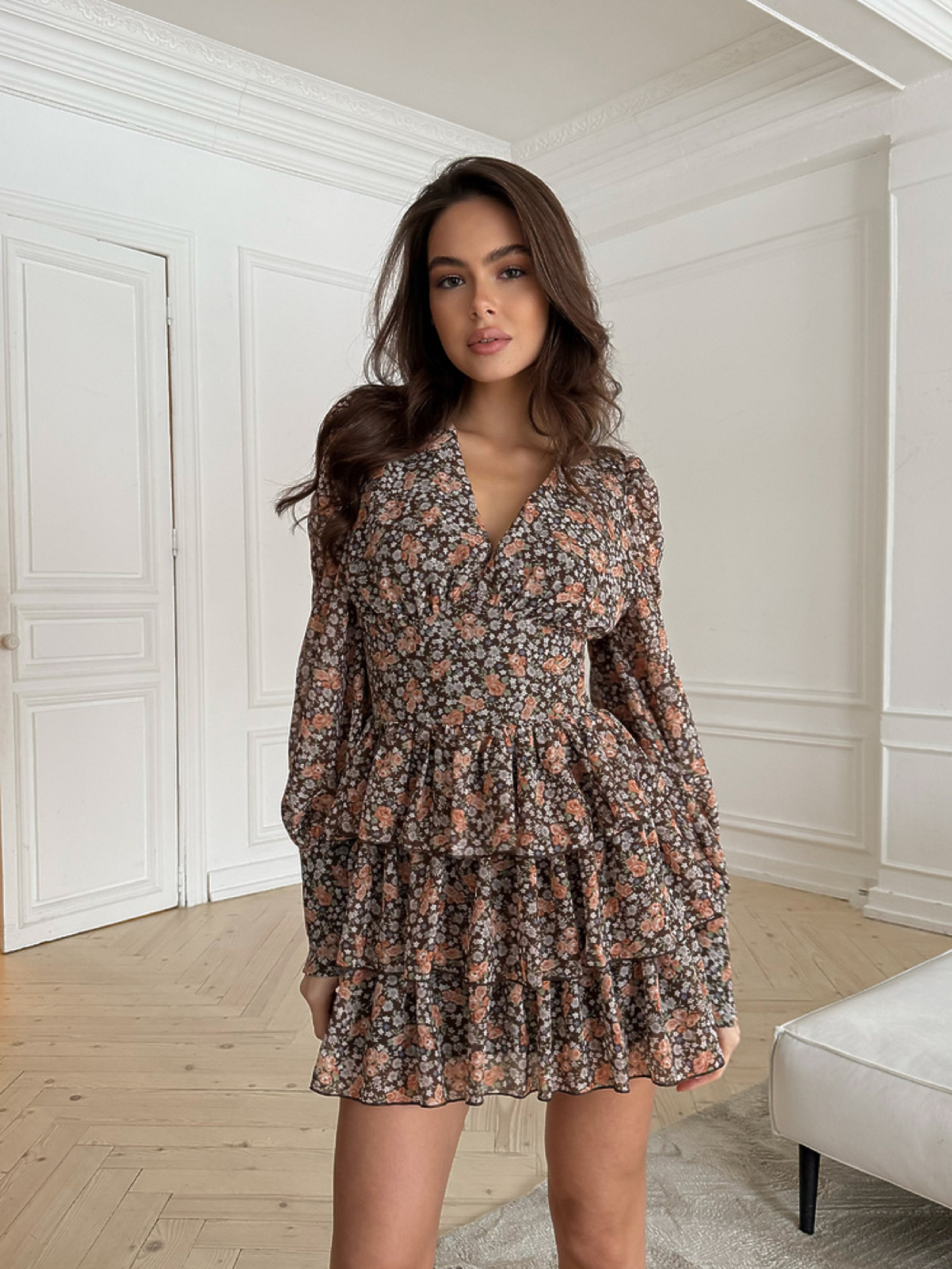 Характеристики: Виріз горловини: V-подібний Довжина рукава: довгий Фасон: приталений верх, розкльошена спідниця Матеріал верху: шифон люксової якості Підкладка: 100% бавовна Колір: дрібні квіти Розмір: one size (S,M; S,L) Як носити: Сукня VIKKY ідеально поєднується з босоніжками, балетками або чобітками на низькому ходу. Додайте джинсову або шкіряну куртку — і образ готовий як для романтичного побачення, так і для прогулянки містом. Неймовірно тендітна та романтична сукня VIKKY створена для тих, хто цінує легкість і жіночність. Легка тканина, повітряний крій і ніжний квітковий принт надають образу витонченості та шарму. Сукня має V-подібне декольте, що красиво підкреслює зону шиї та ключиць. Лінія талії зі злегка утягуючим ефектом вигідно формує силует, а еластична резинка по спинці забезпечує комфорт і посадку по фігурі. Рукави з широкими манжетами, оздобленими ґудзиками, обтягнутими тією ж тканиною, додають елегантності. Пишна тришарова спідниця створює відчуття легкості й руху при кожному кроці.