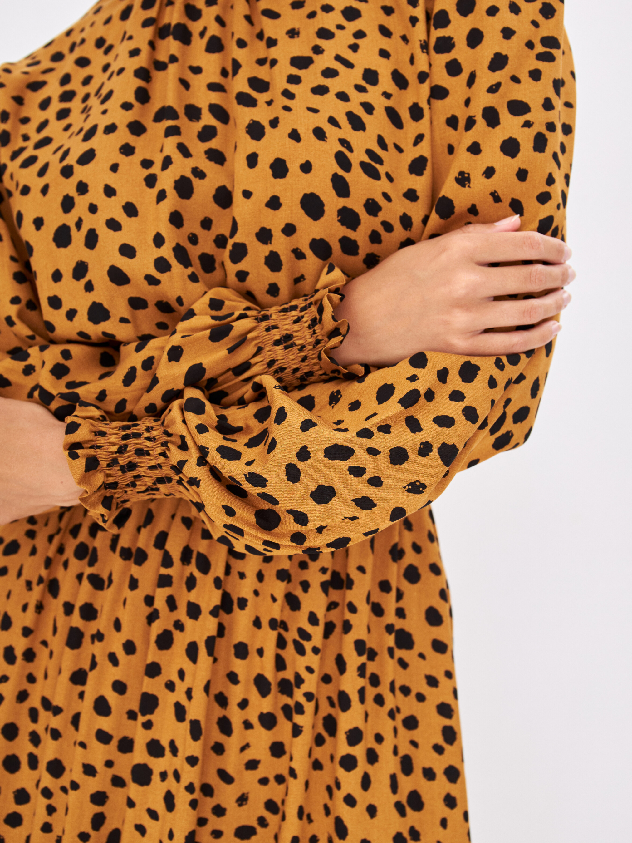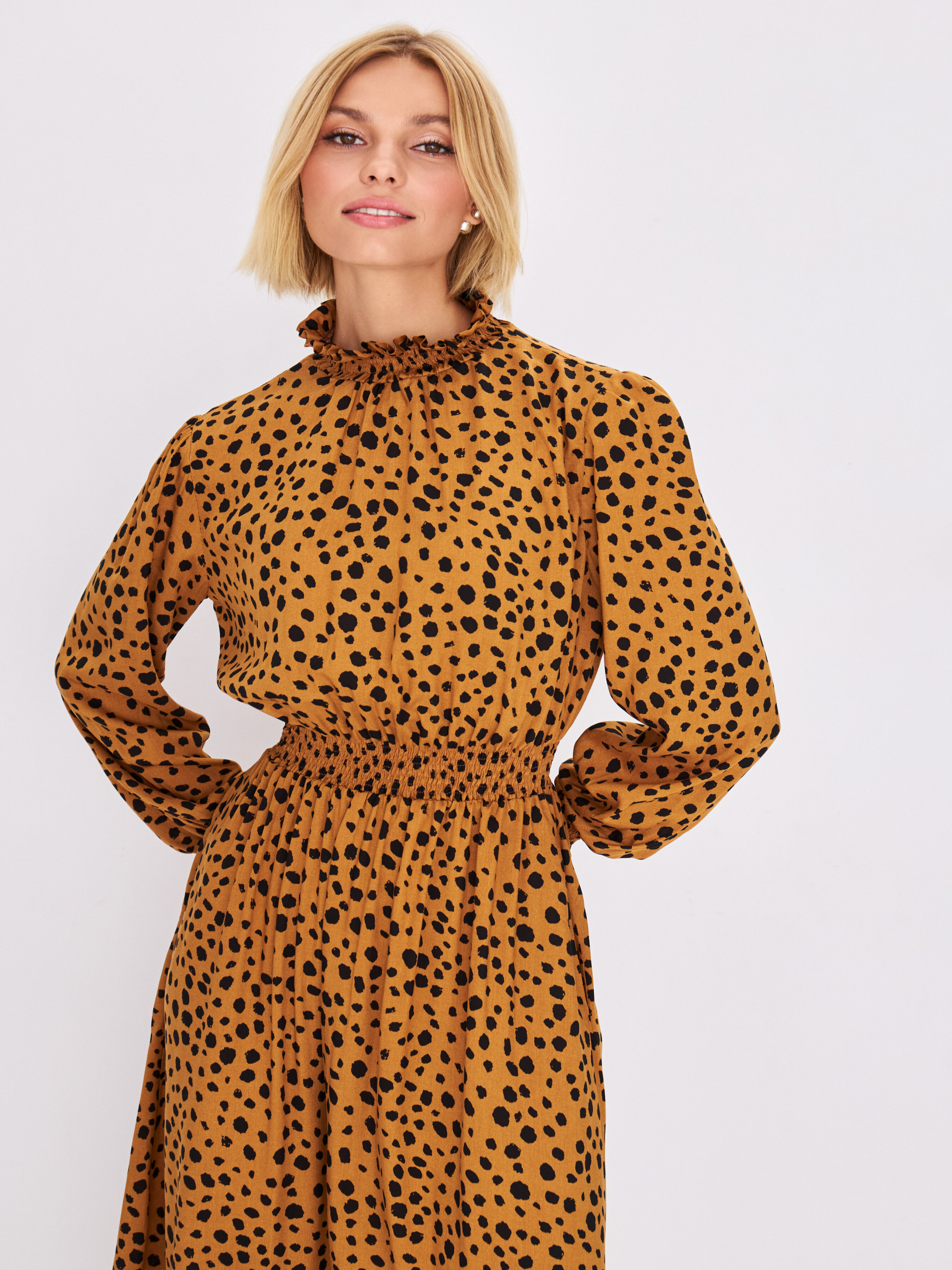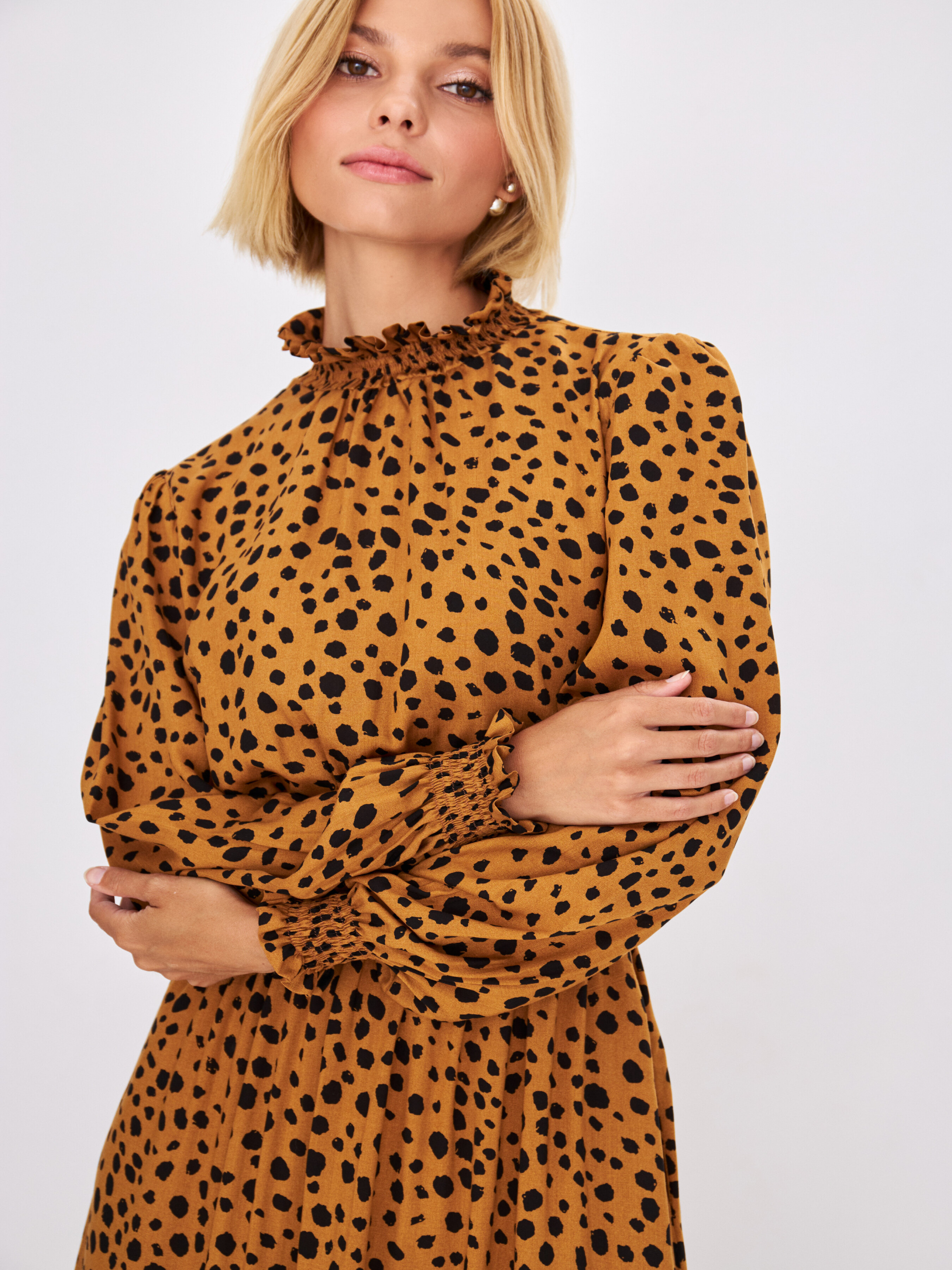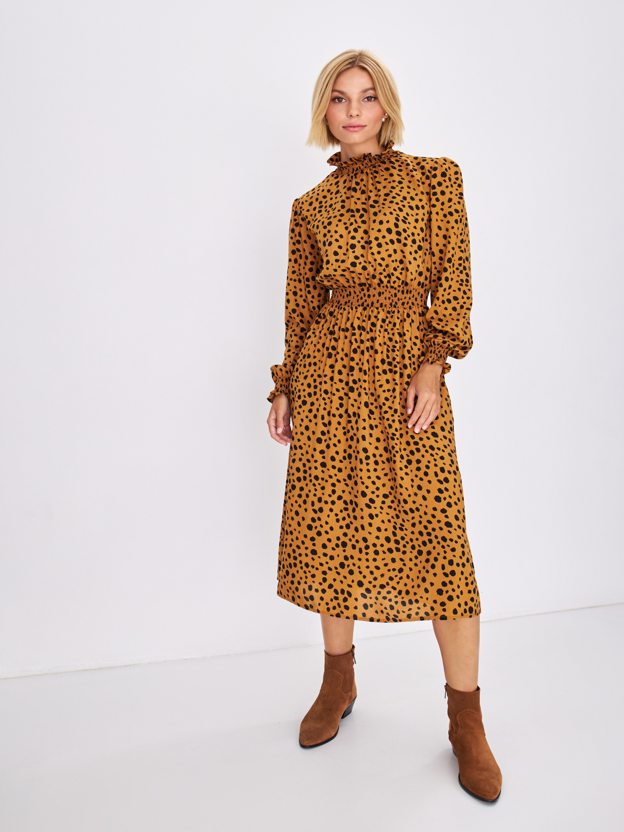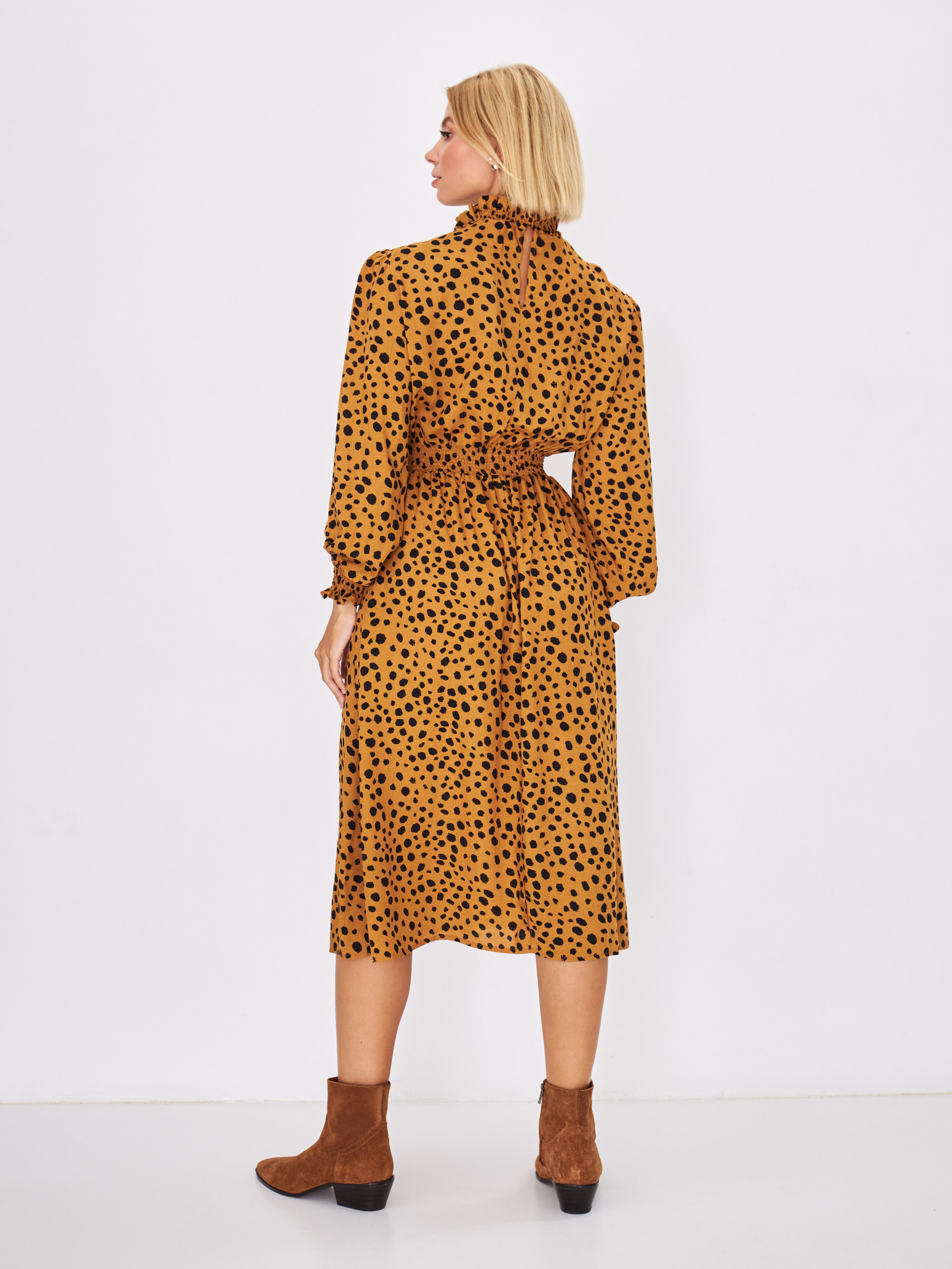 Платье длиной миди по праву считается классикой и актуально в любое время года. Прилегающий силуэт красиво подчеркнёт линию талии и сделает акцент на стройных ножках. Лаконичный крой и активный цветочный принт. Длинный рукав дополняет манжет на резинке. Воротник стойка фиксируется с помощью пуговиц и формирует каплевидный вырез по спине изделия. Данный наряд выглядит свежо и элегантно и станет неотъемлемой частью осеннего гардероба.