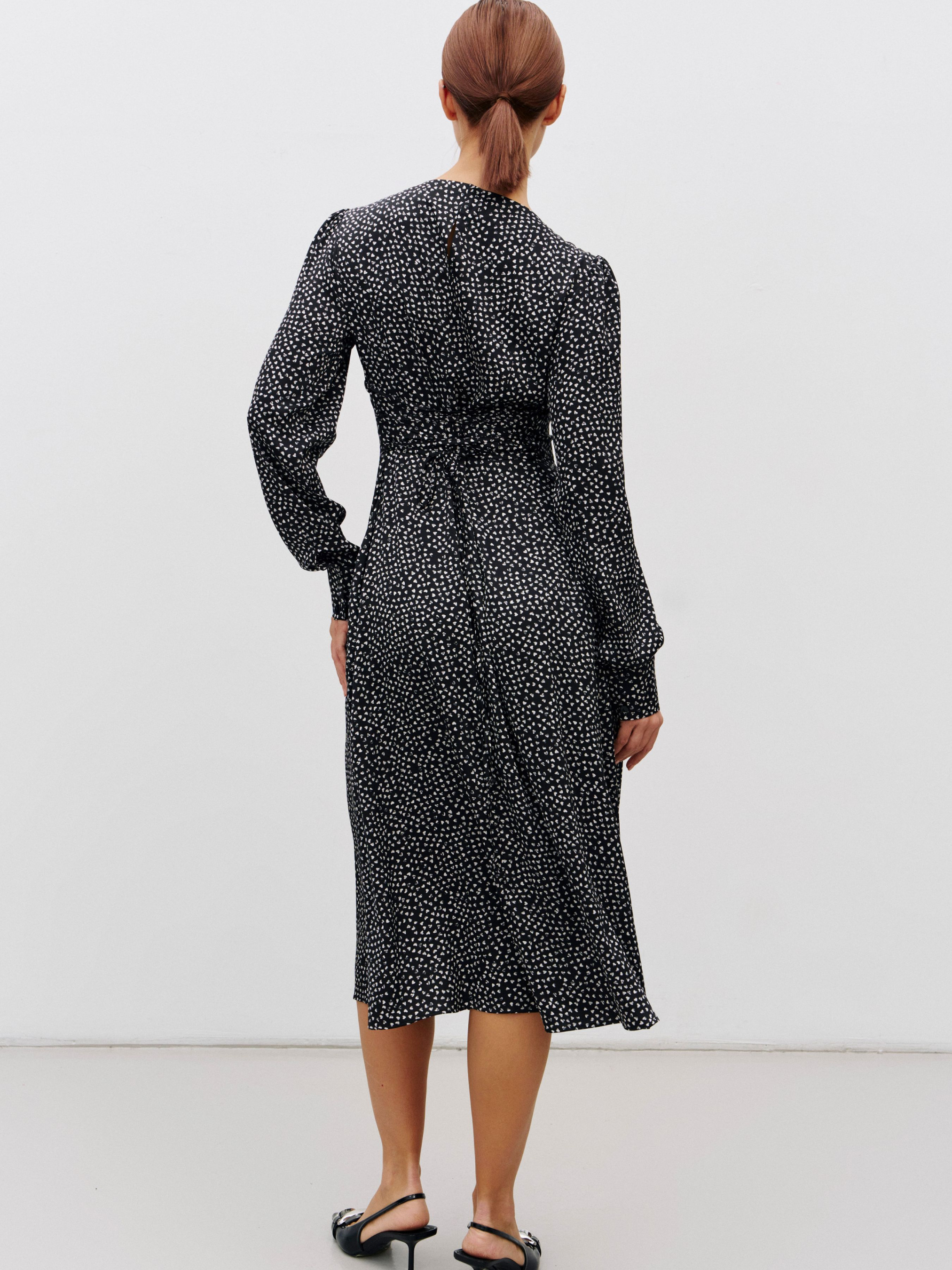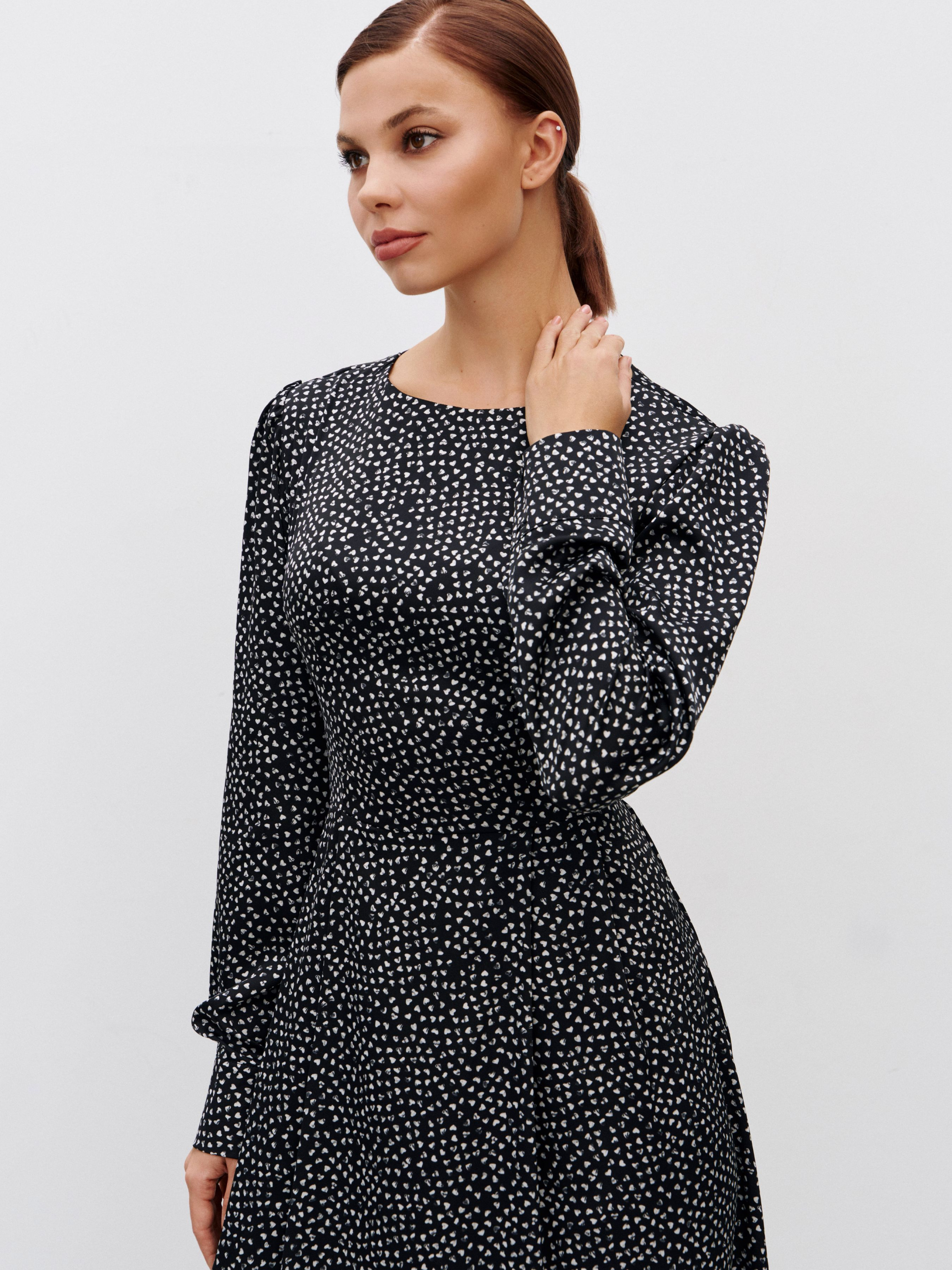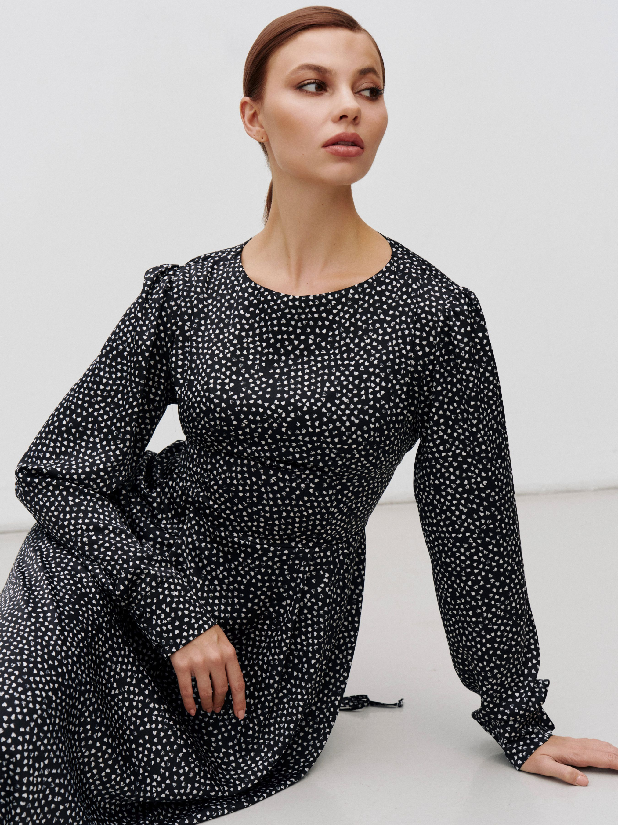 Для изготовления платья использовали ткань с сатиновым переплетением с добавлением эластана, что усиливает эффект праздничности. Шнуровка на спине в зоне талии регулируется. Это позволяет сделать платье более силуэтным или более свободным. Вариация возможных комплектов поражает с высокими сапогами, классическими ботинками, пиджаками или свитерами, бомберами и тренчами. Каждая девушка сможет адаптировать это платье в своем гардеробе. Состав: полиэстер 55%, вискоза 40%, эластан 5%.