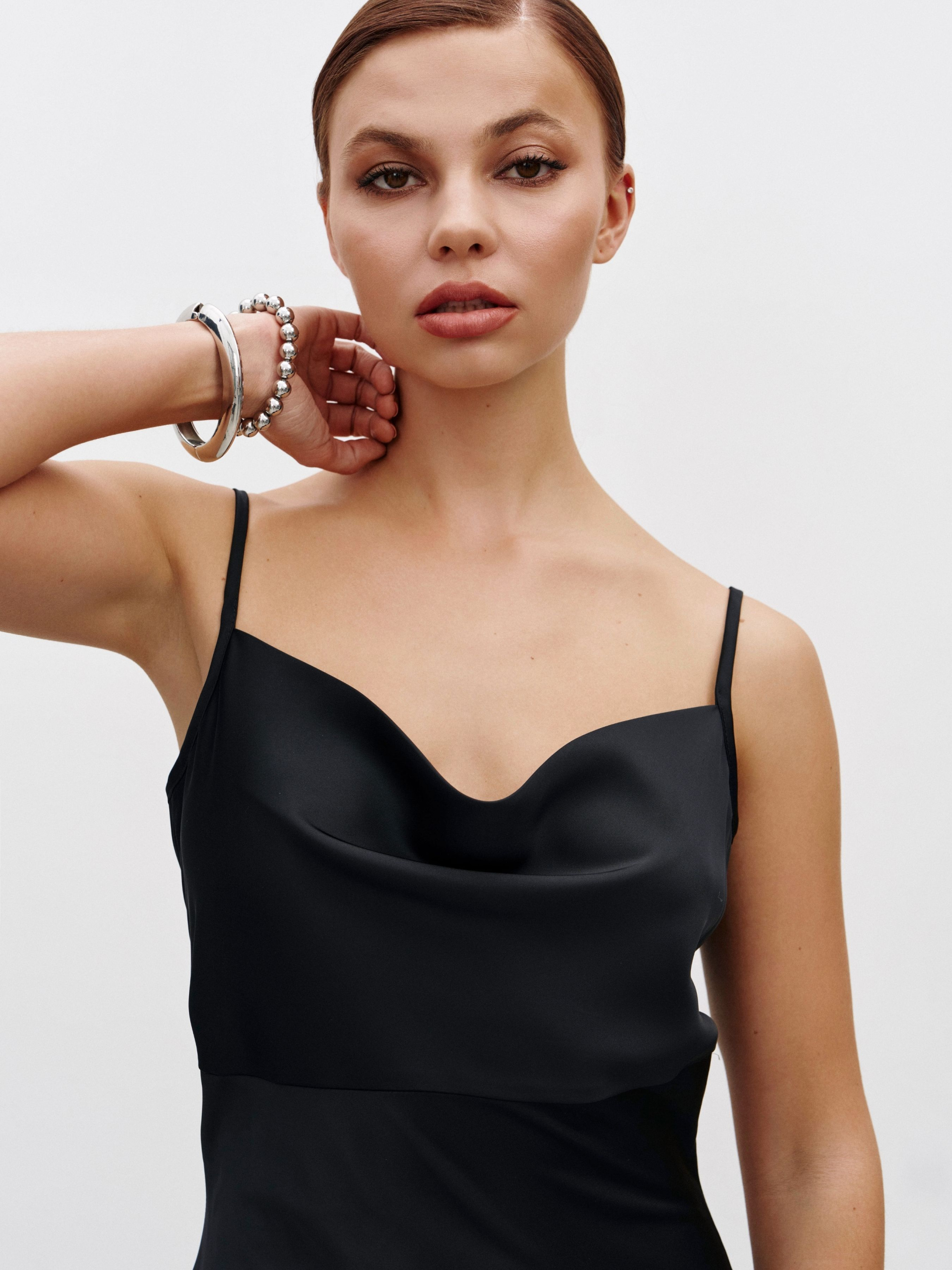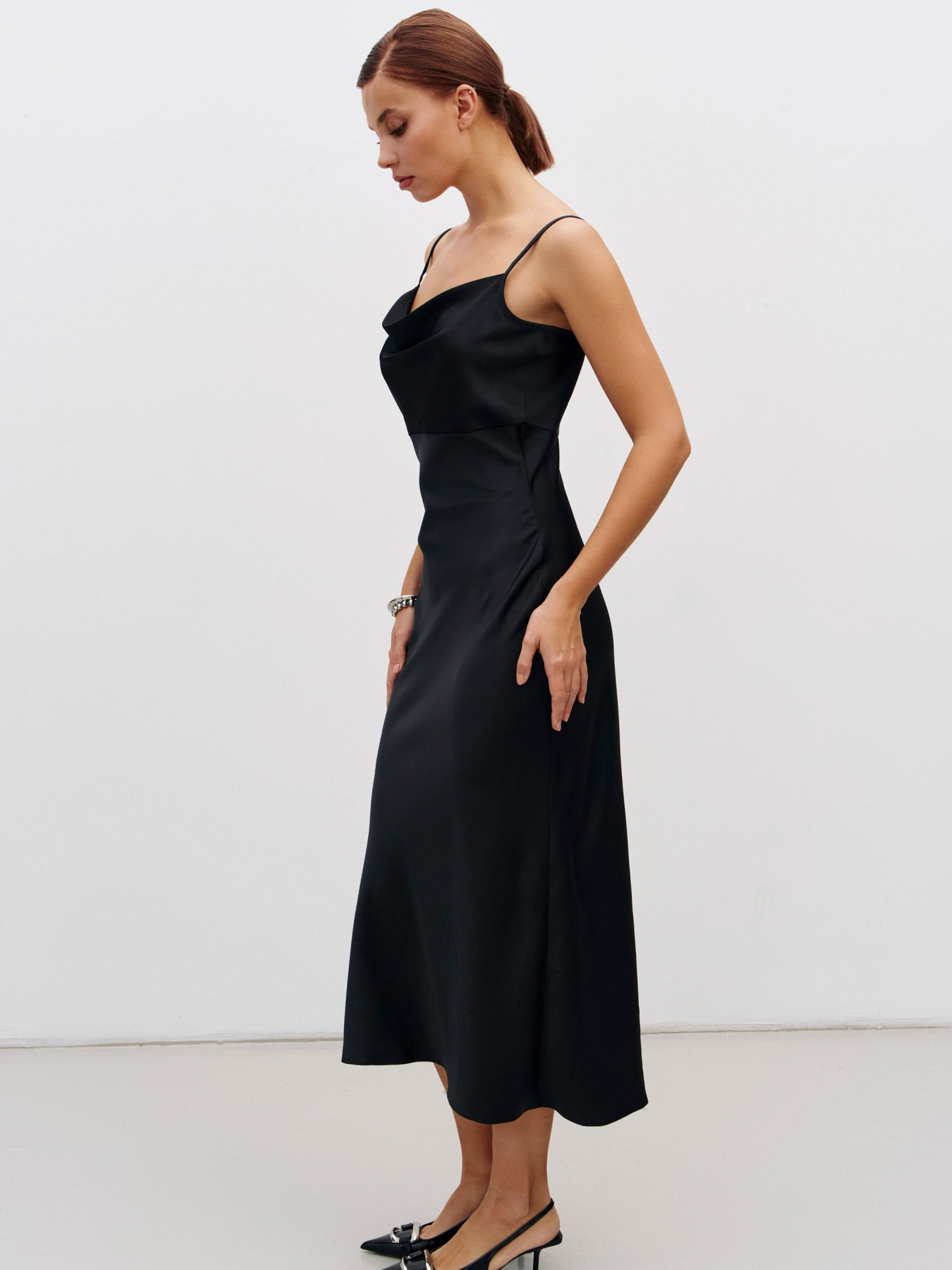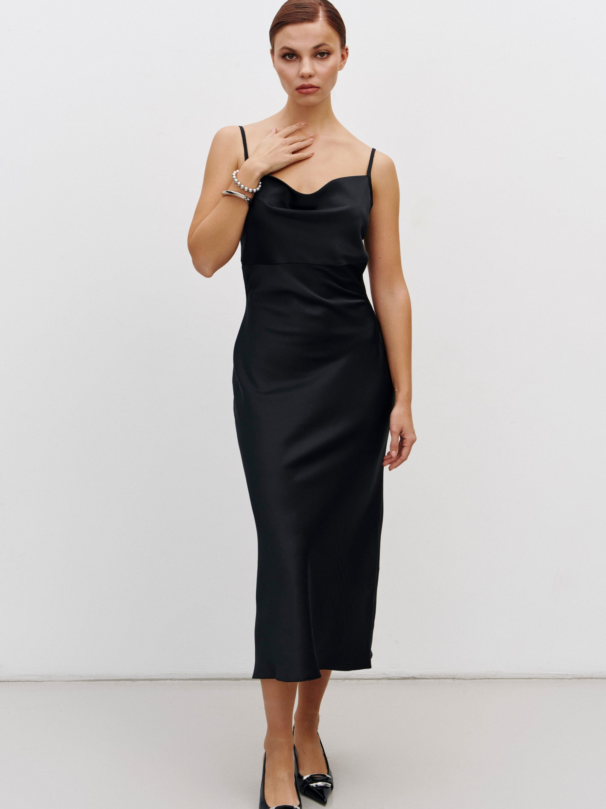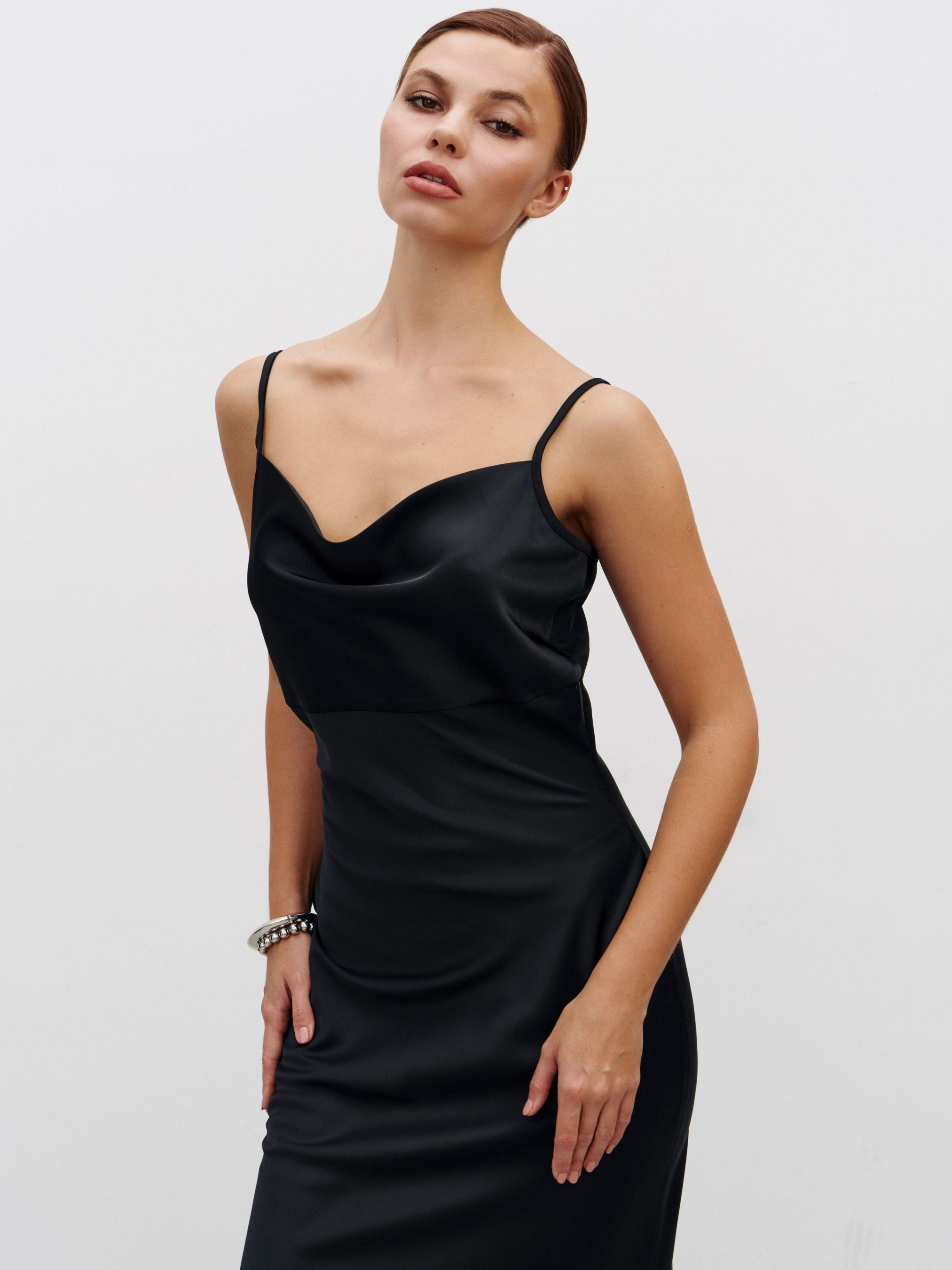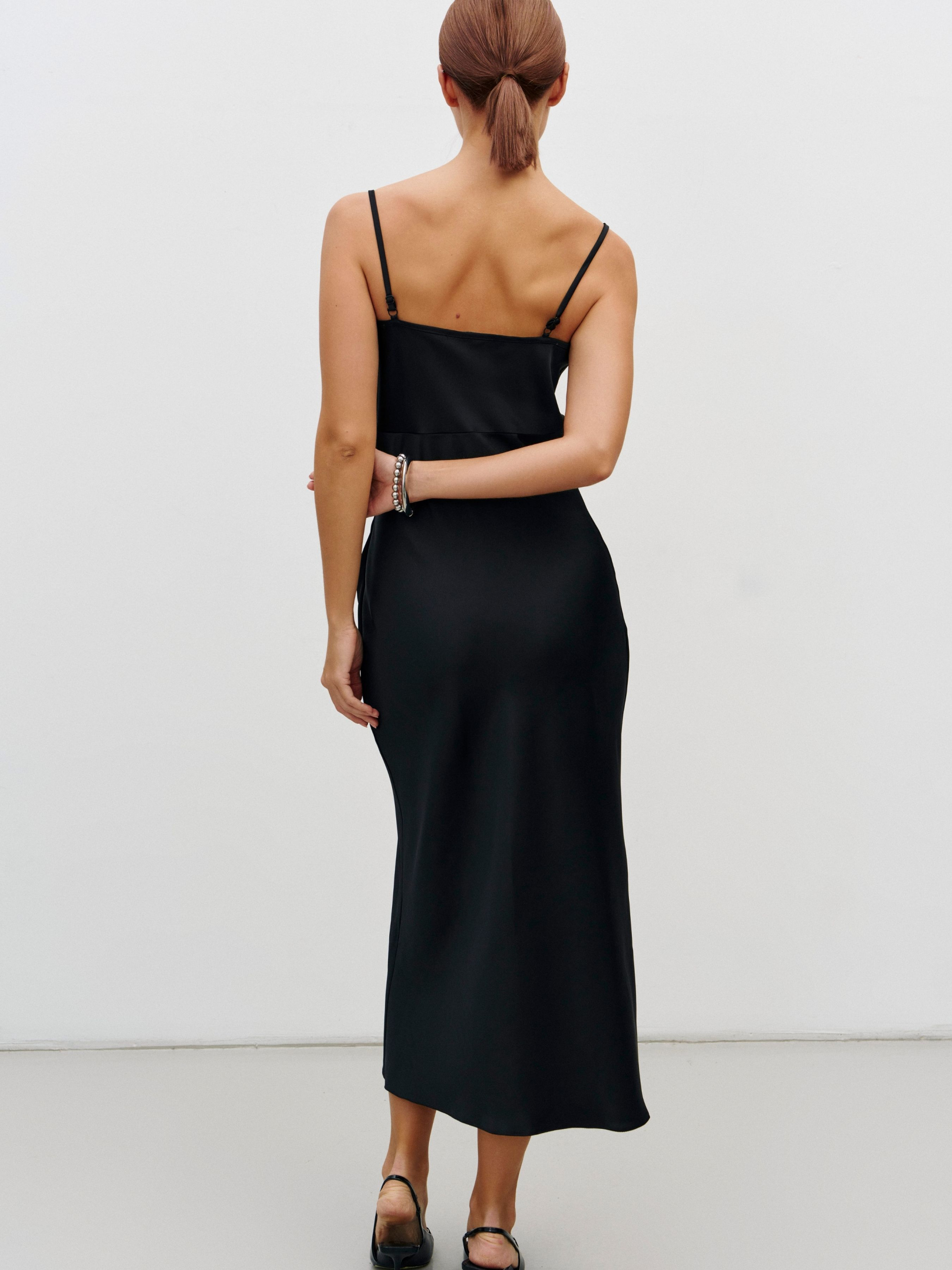 Чувственное платье-комбинация деликатно подчеркнет линии фигуры. На первый взгляд базовое платье, но его преимущество в том, что конструкция раскроена по косой, что позволило избежать вытачек при шитье, она становится эластичной по всем направлениям, а потенциал изделия раскрывается на теле – нежно обнимает силуэт ее обладательницы и не поднимается при ходьбе. Зона декольте оформлена привлекательным вырезом-качелька, бретели регулируются по длине. Состав: полиэстер 75%, вискоза 20%, эластан 5%.