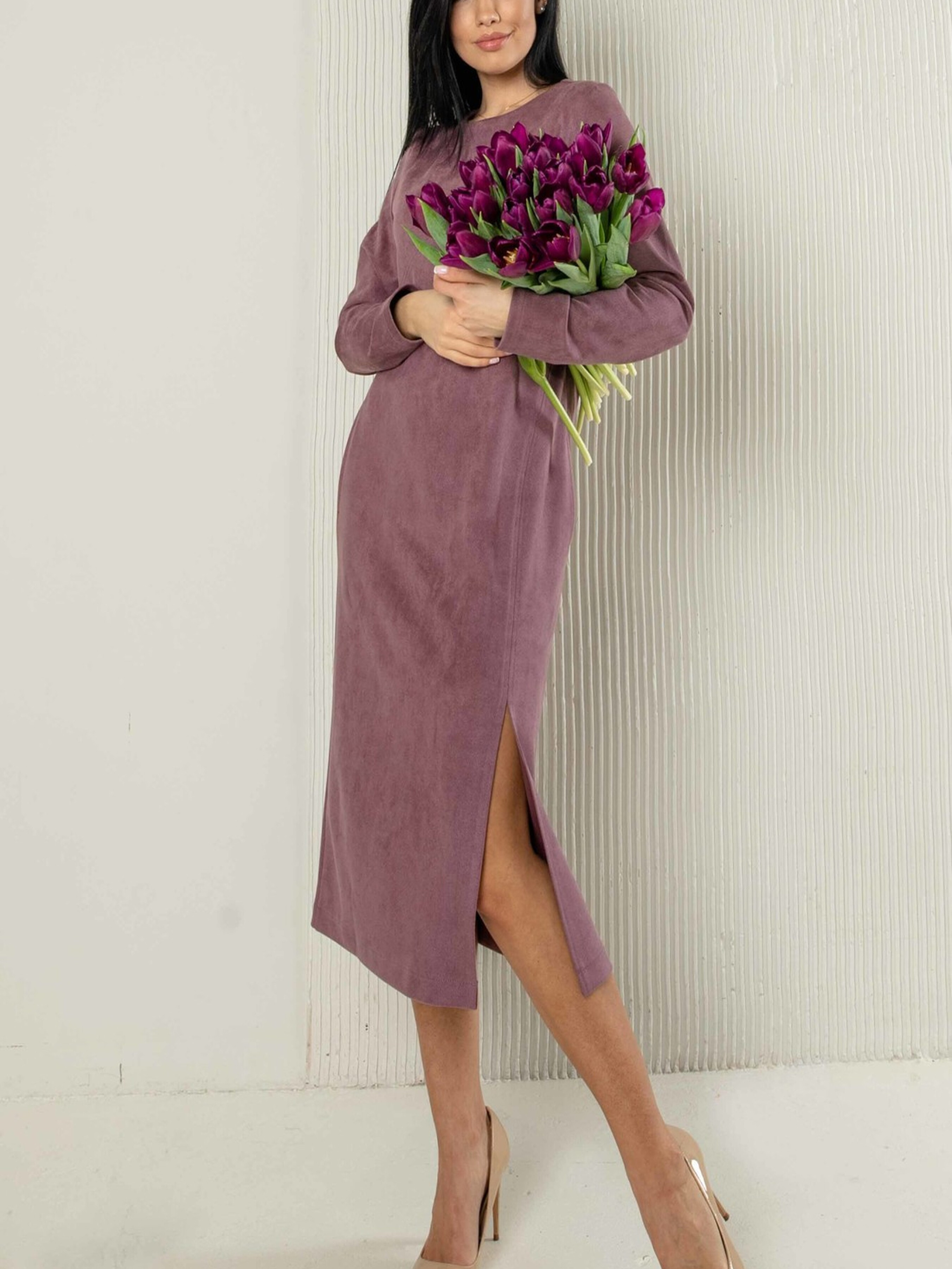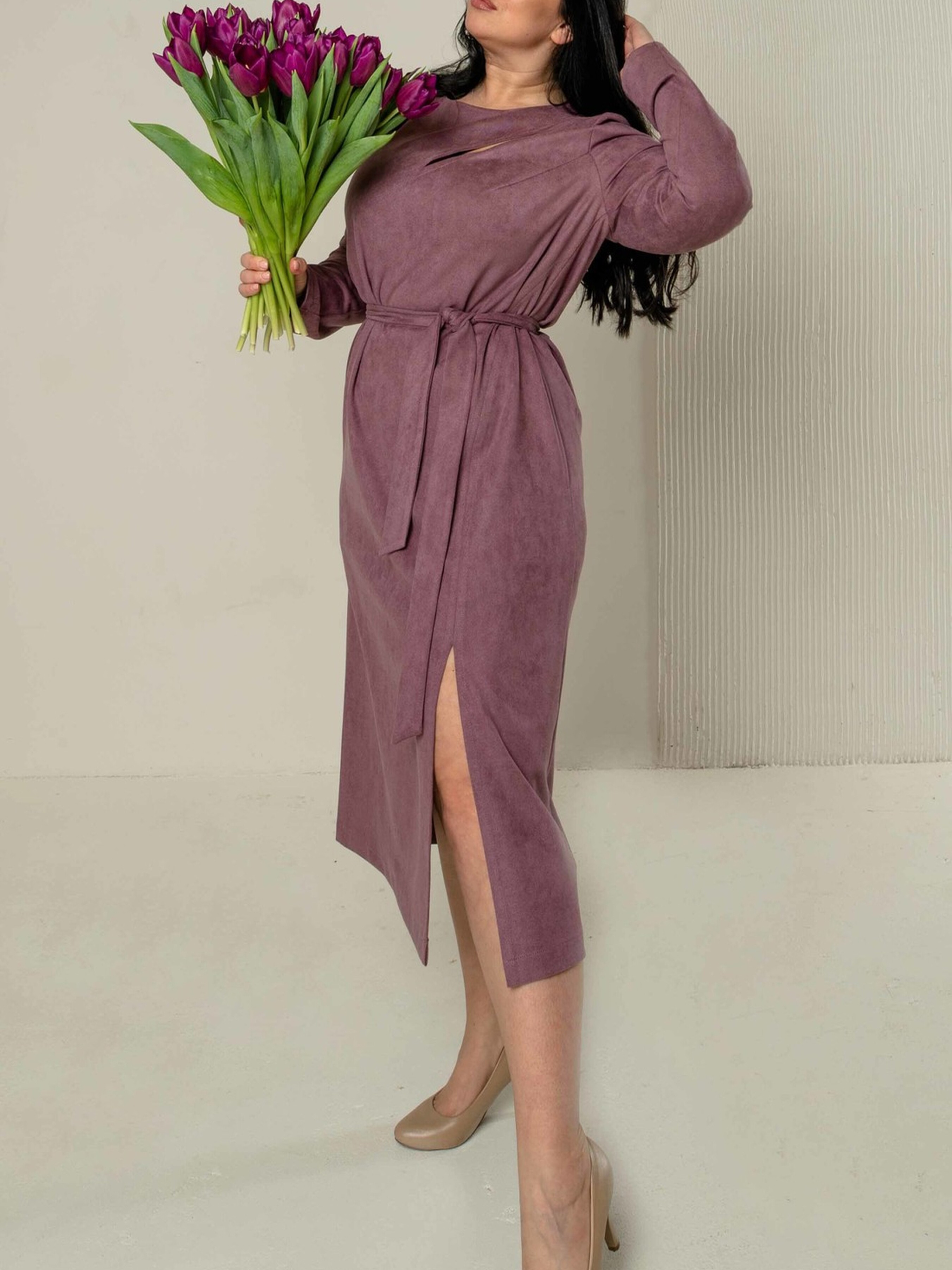 Стильна демісезонна сукня напівприлеглого силуету елегантної міді довжини вирізняється оригінальним дизайном. Ліворуч від круглої горловини розташований фігурний розріз, що додає образу витонченості. З лівого бокового шва починається фігурний рельєф, який завершується розрізом унизу, створюючи цікавий акцент. Зручні кишені, розташовані в бічних швах, роблять цю сукню практичною для повсякденного носіння. У комплекті йде пояс з основної трикотажної тканини, який допоможе вам підкреслити лінію талії та створити більш жіночний силует. Виготовлена з м'якого та приємного на дотик трикотажу із замшем-діагоналлю, ця сукня забезпечить вам комфорт у прохолодну погоду, зберігаючи при цьому елегантний вигляд. Характеристики: Матеріал сукні: Трикотаж із замшем-діагональ (56% поліестер, 34% віскоза, 10% бавовна) Крій: Напівприлеглий силует, міді довжина Горловина: Кругла з фігурним розрізом ліворуч Деталі: Фігурний рельєф з розрізом унизу з лівого бокового шва, кишені в бічних швах Додатково: Пояс із тканини сукні Стиль: Стильний, демісезонний, повсякденний, елегантний Властивості: М'яка, комфортна трикотажна тканина, оригінальний дизайн Сезон: Весна, осінь