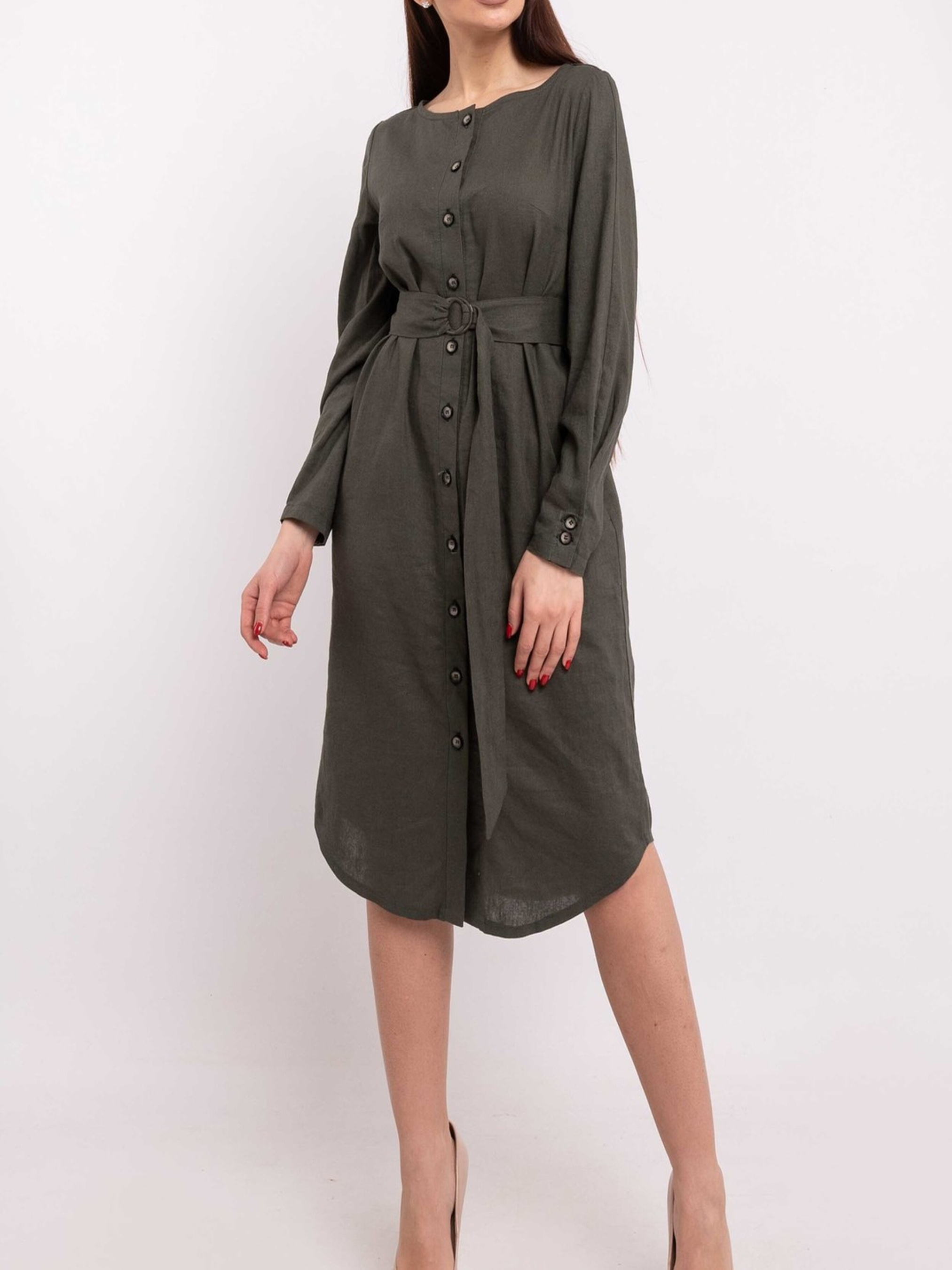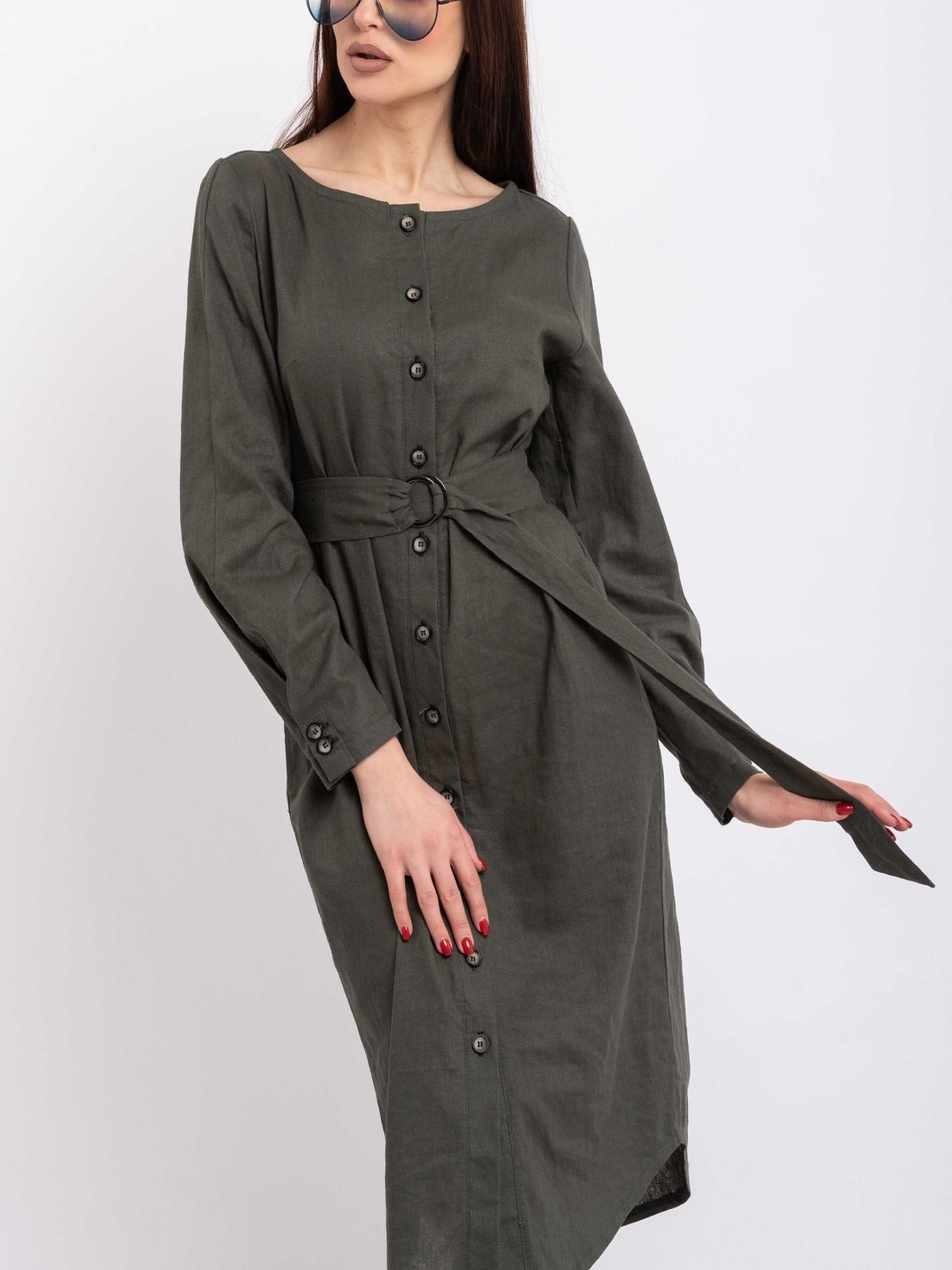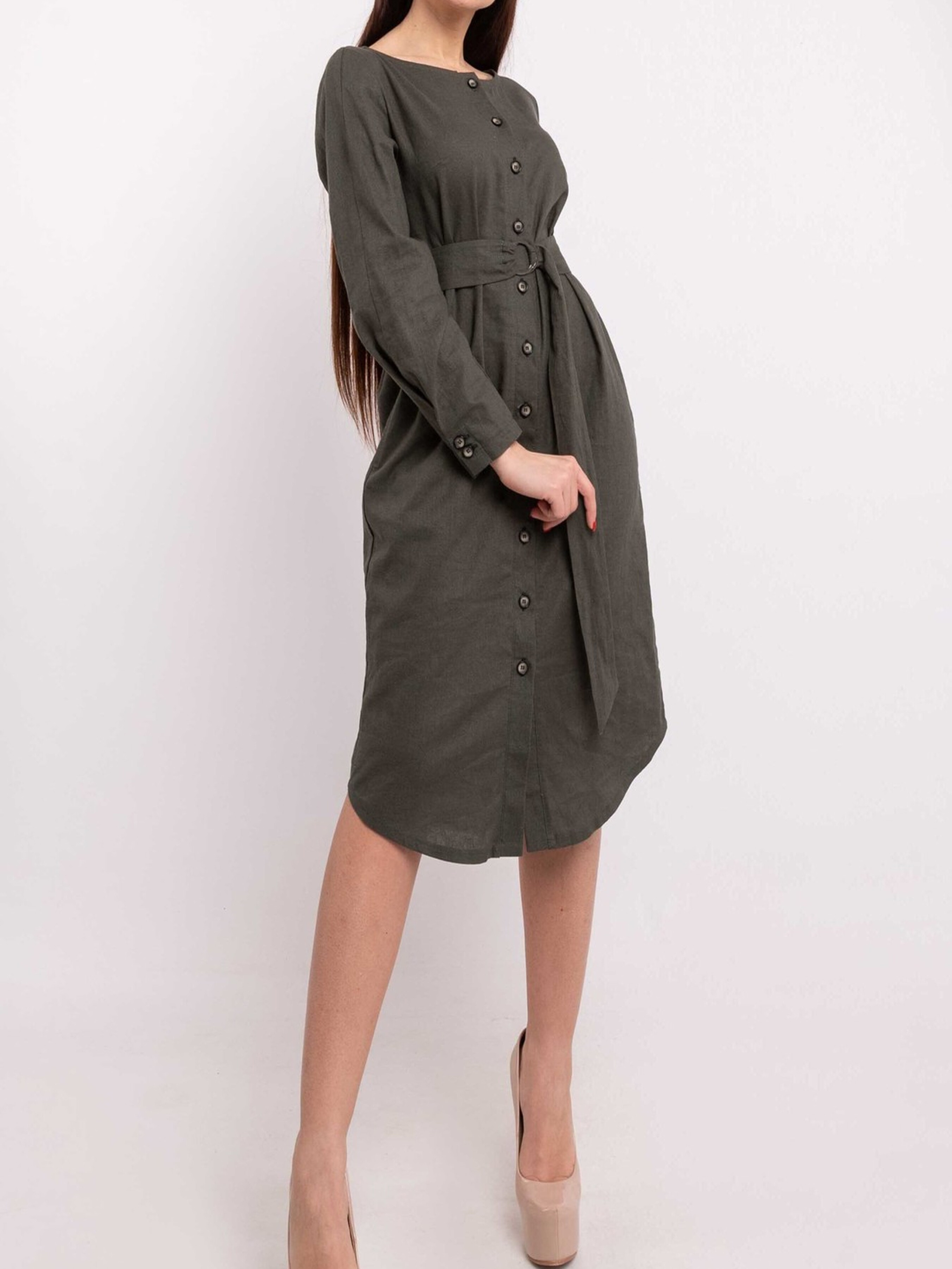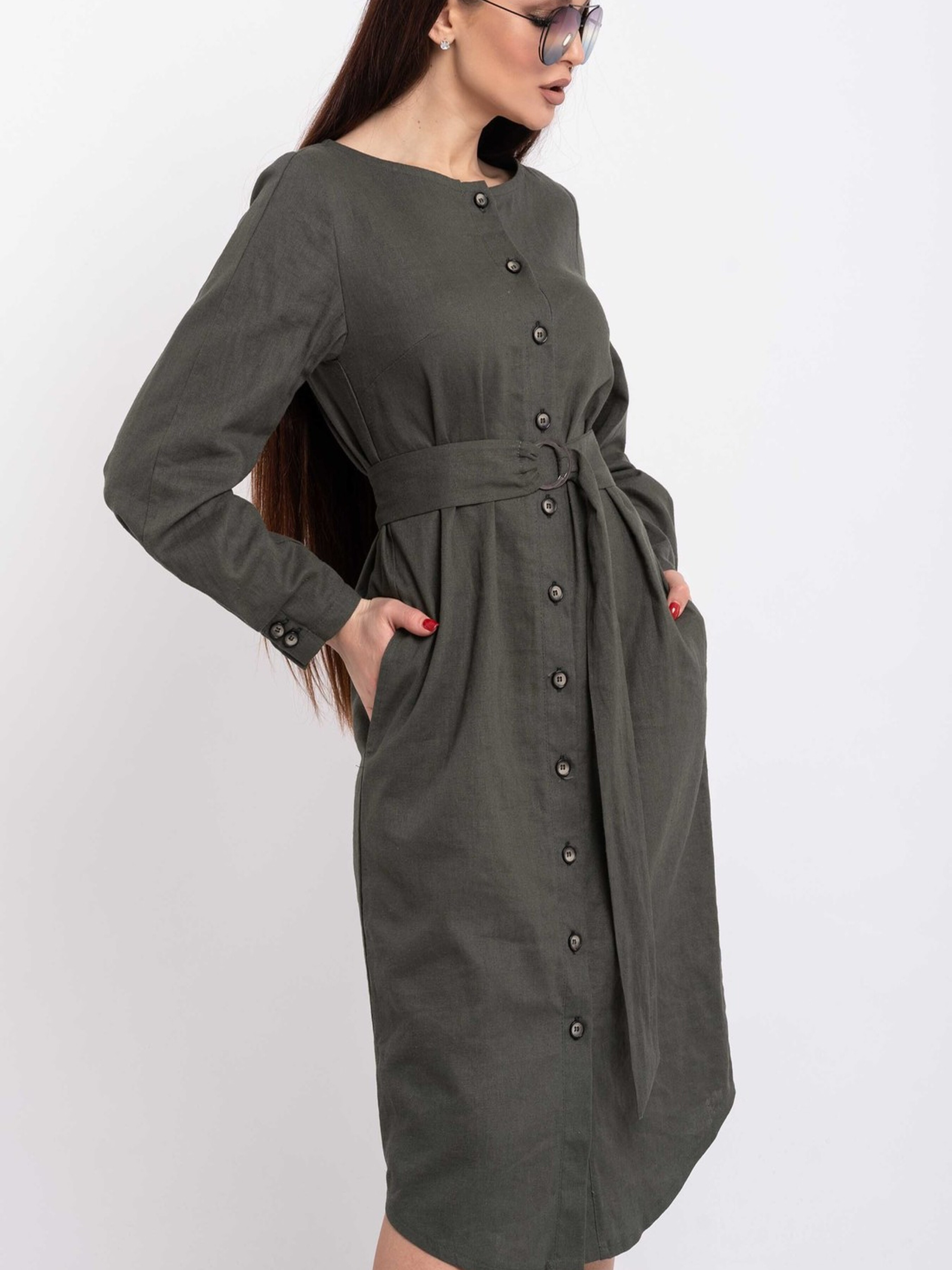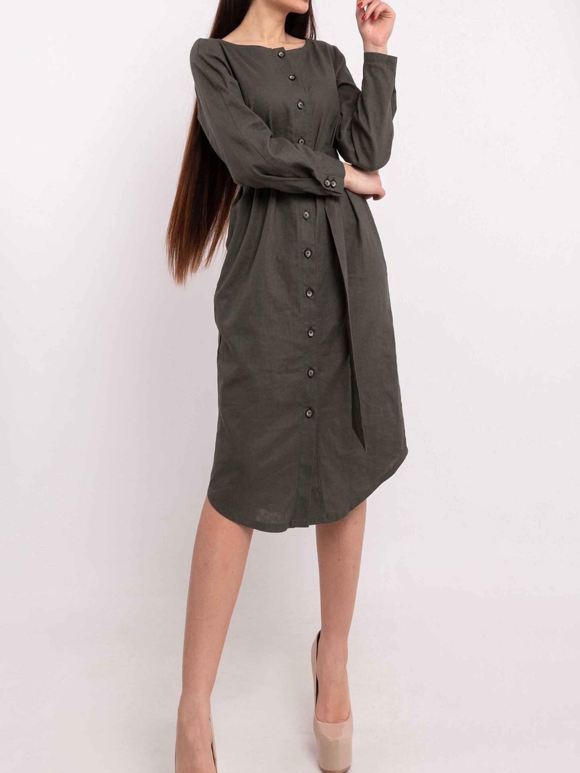 Елегантна лляна сукня-сорочка прямого силуету елегантної міді довжини стане незамінним елементом вашого гардеробу завдяки своїй універсальності та стилю. Функціональна застібка по центру переду дозволяє регулювати глибину вирізу, а акуратна кругла горловина додає ніжності образу. Класичний напівкруглий низ завершує силует. Легкі східні нотки сукні надає оригінально виконаний манжет з імітацією застібки, що формує елегантну складку по всій довжині рукава. Ця багатогранна сукня чудово адаптується до різних образів: у поєднанні з поясом на кільцях з основної лляної тканини, що йде в комплекті, вона струнко витягує силует, підкреслюючи талію, а без пояса створює розслаблений та комфортний вигляд. Натуральний льон забезпечує відмінну повітропроникність та легкість, роблячи цю сукню ідеальною для теплої погоди. Характеристики: Матеріал: Льон (100% льон) Крій: Прямий силует, довжина міді Горловина: Кругла Застібка: Функціональна по центру переду Рукав: Довгий, з оригінальним манжетом (імітація застібки, складка по довжині) Низ: Класичний напівкруглий Додатково: Пояс з основної тканини на кільцях Стиль: Елегантний, повсякденний, універсальний, з елементами східного стилю Властивості: Натуральна тканина, повітропроникна, легка, візуально витягує силует (з поясом) Сезон: Літо, демісезон