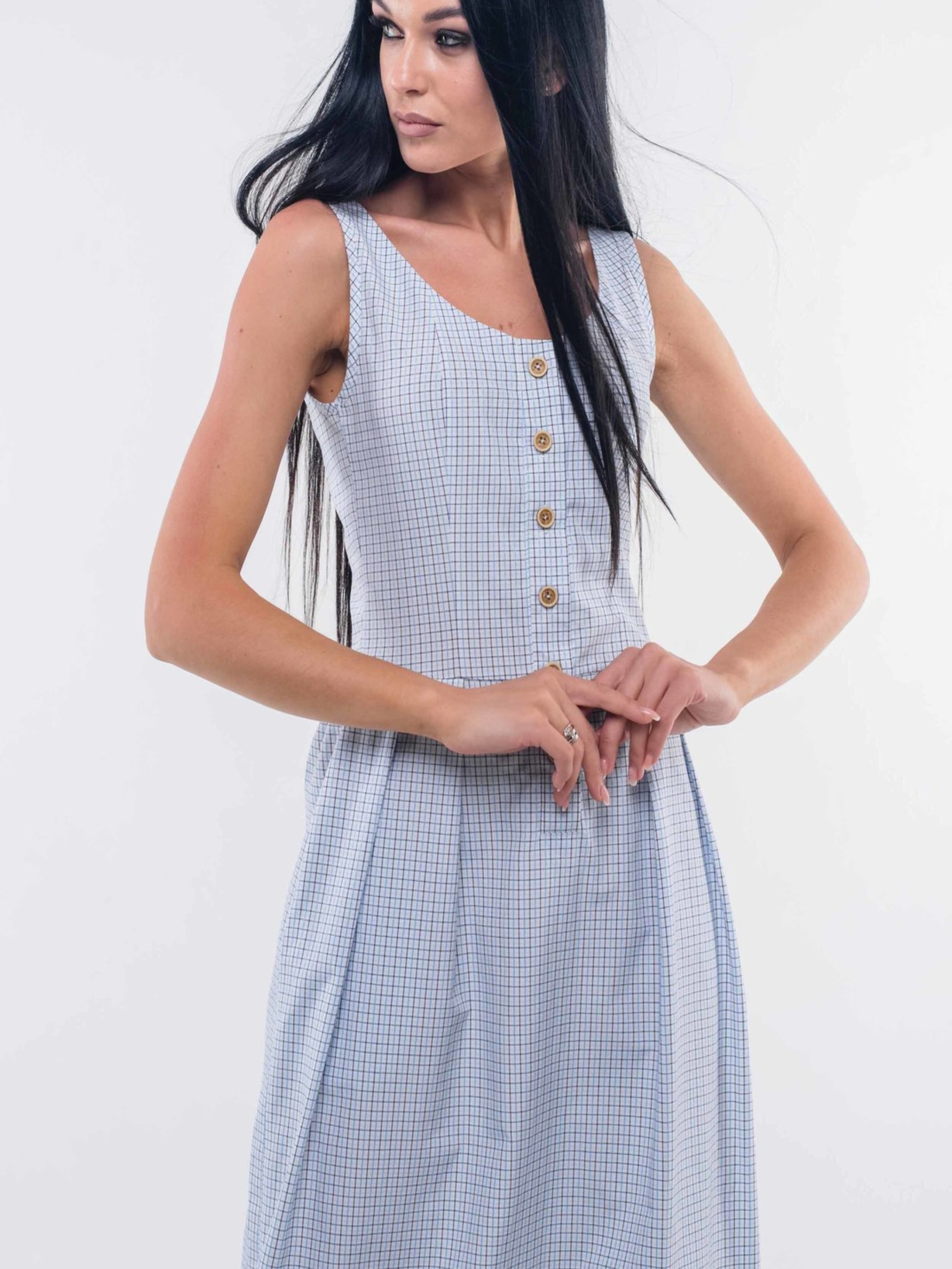 Жіночий сарафан прилеглого силуету довжиною міді стане елегантним доповненням вашого гардеробу. Його строгий та консервативний дизайн, доповнений функціональною центральною застібкою до лінії стегна та практичними кишенями в бічних швах, робить його чудовим вибором для ділового офісного середовища. Водночас, додавши яскраві аксесуари, ви легко трансформуєте його для романтичного вечора. Сарафан відрізний по лінії талії: верх виконаний у витонченому корсетному стилі, а спідниця, що елегантно розкльошується, має широкі складки спереду та легку збірку на спинці, створюючи жіночний силует. Виготовлений з якісного джинс-коттону, сарафан поєднує комфорт бавовни та практичність поліестеру. Характеристики: Матеріал: Джинс-коттон (60% бавовна, 40% поліестер) Крій: Прилеглий силует, довжина міді Лінія талії: Відрізний, корсетний верх Спідниця: Розкльошена, широкі складки спереду, легка збірка на спинці Застібка: Функціональна центральна до лінії стегна Деталі: Кишені в бічних швах Стиль: Діловий, офісний, елегантний, романтичний (з аксесуарами) Властивості: Строгий, консервативний, універсальний