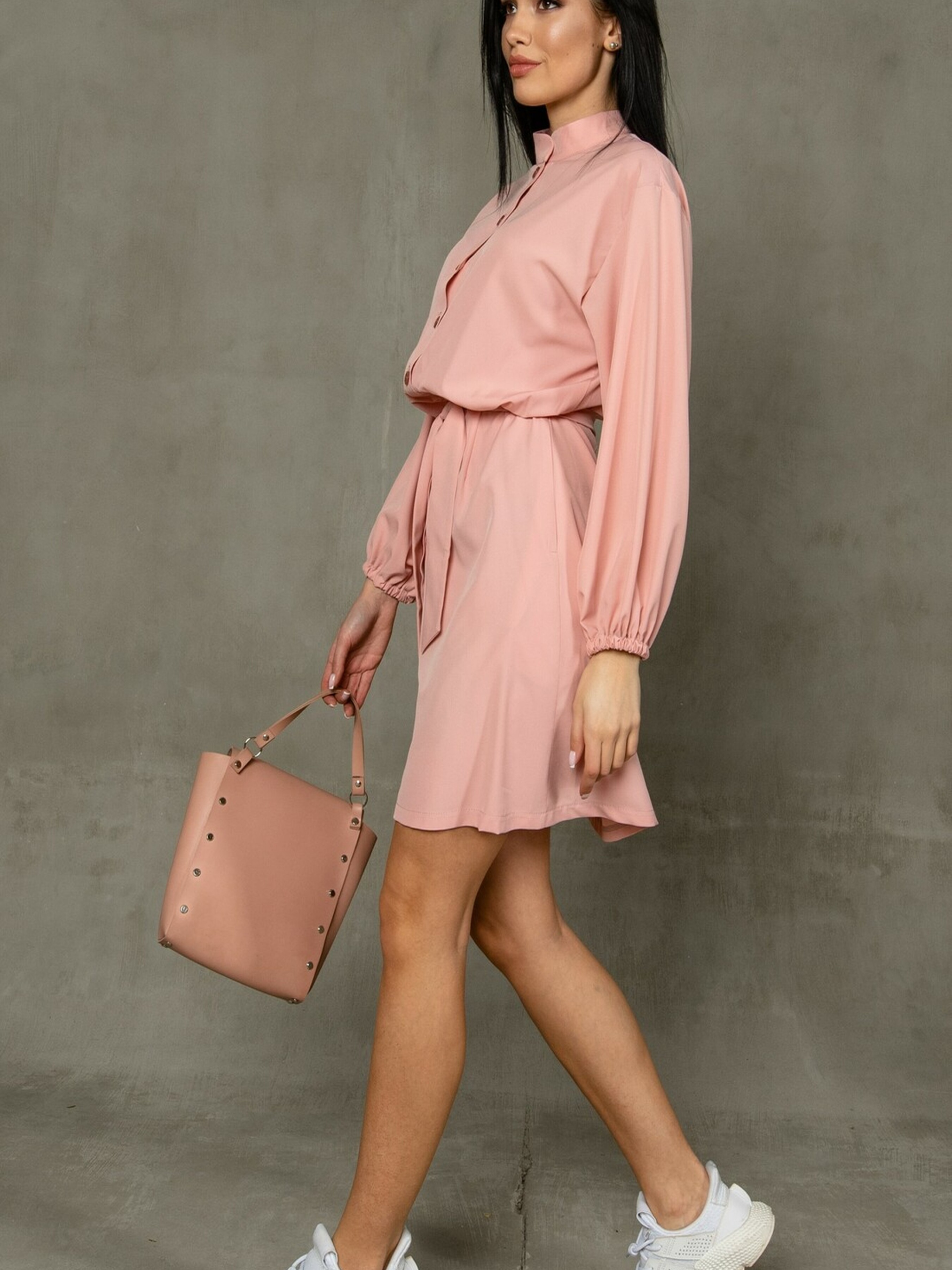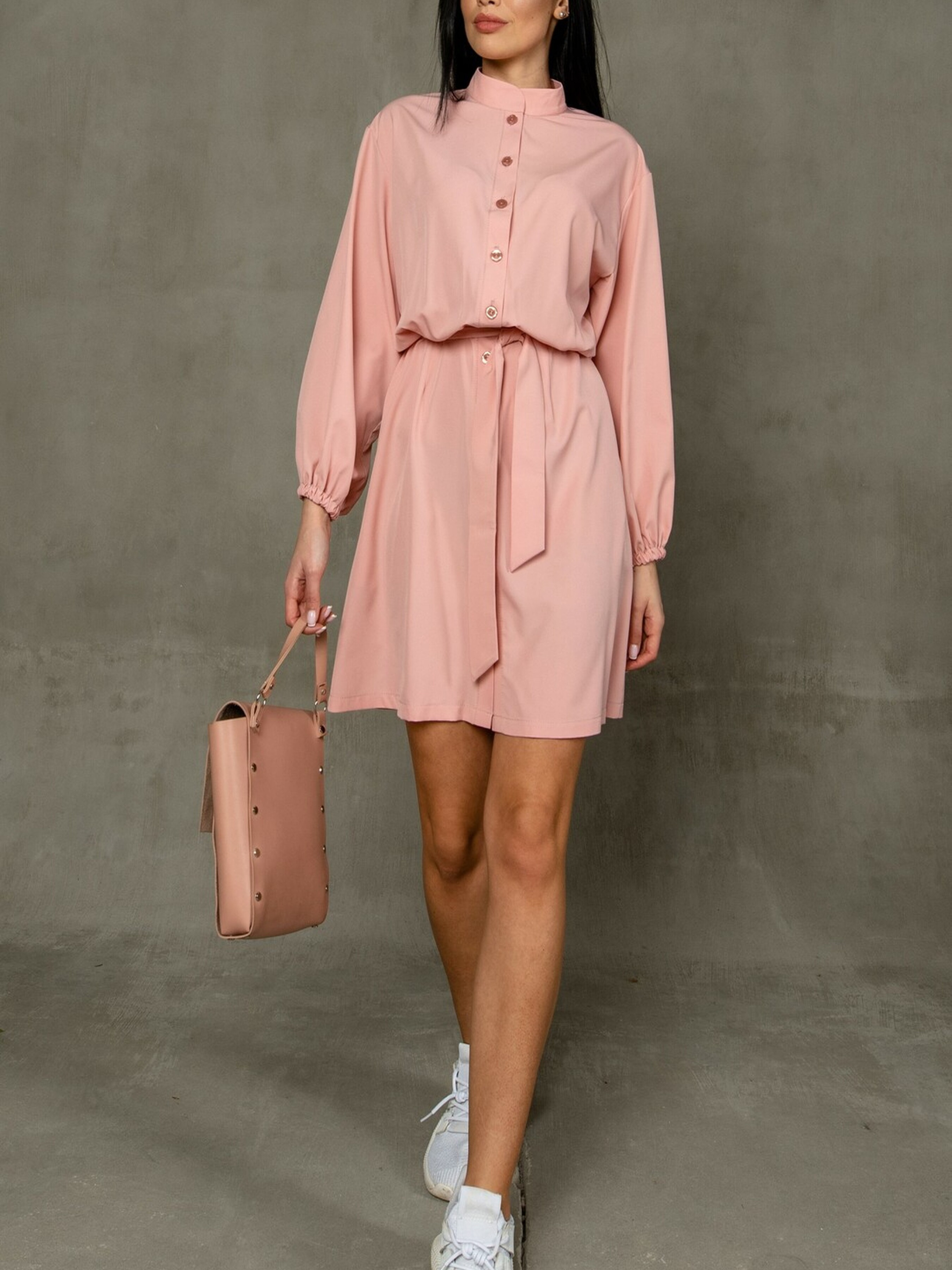 Повсякденна сукня напівприлеглого силуету міні довжини стане вашим улюбленим вбранням для створення легких та стильних образів. Акуратна горловина-стійка та функціональна центральна застібка на ґудзики спереду додають їй стриманості та практичності. Спущена лінія плеча та рукави, що закінчуються ніжними манжетами на резинці, створюють м'який та жіночний образ. Сукня відрізна по лінії талії, а верх зі складками гармонійно поєднується зі спідницею-трапецією, що підкреслює фігуру та забезпечує свободу рухів. Зручні кишені, розташовані в бічних швах, роблять цю модель ще більш функціональною. У комплекті йде пояс, який допоможе вам акцентувати талію. Характеристики (залежно від кольору): Матеріал сукні (беж принт): Штапель-твіл (100% бавовна) Матеріал сукні (пудра): Софт (56% поліестер, 34% віскоза, 10% бавовна) Крій: Напівприлеглий силует, міні довжина, спідниця-трапеція Горловина: Стійка Застібка: Функціональна центральна на ґудзики Рукав: Спущена лінія плеча, манжета на резинці Деталі: Відрізна по талії, складки на верхній частині, кишені в бічних швах Додатково: Пояс Стиль: Повсякденний, жіночний, комфортний, стильний Властивості: М'яка та дихаюча тканина (штапель-твіл) / легка та струмлива тканина (софт) Сезон: Літо, тепла весна/осінь