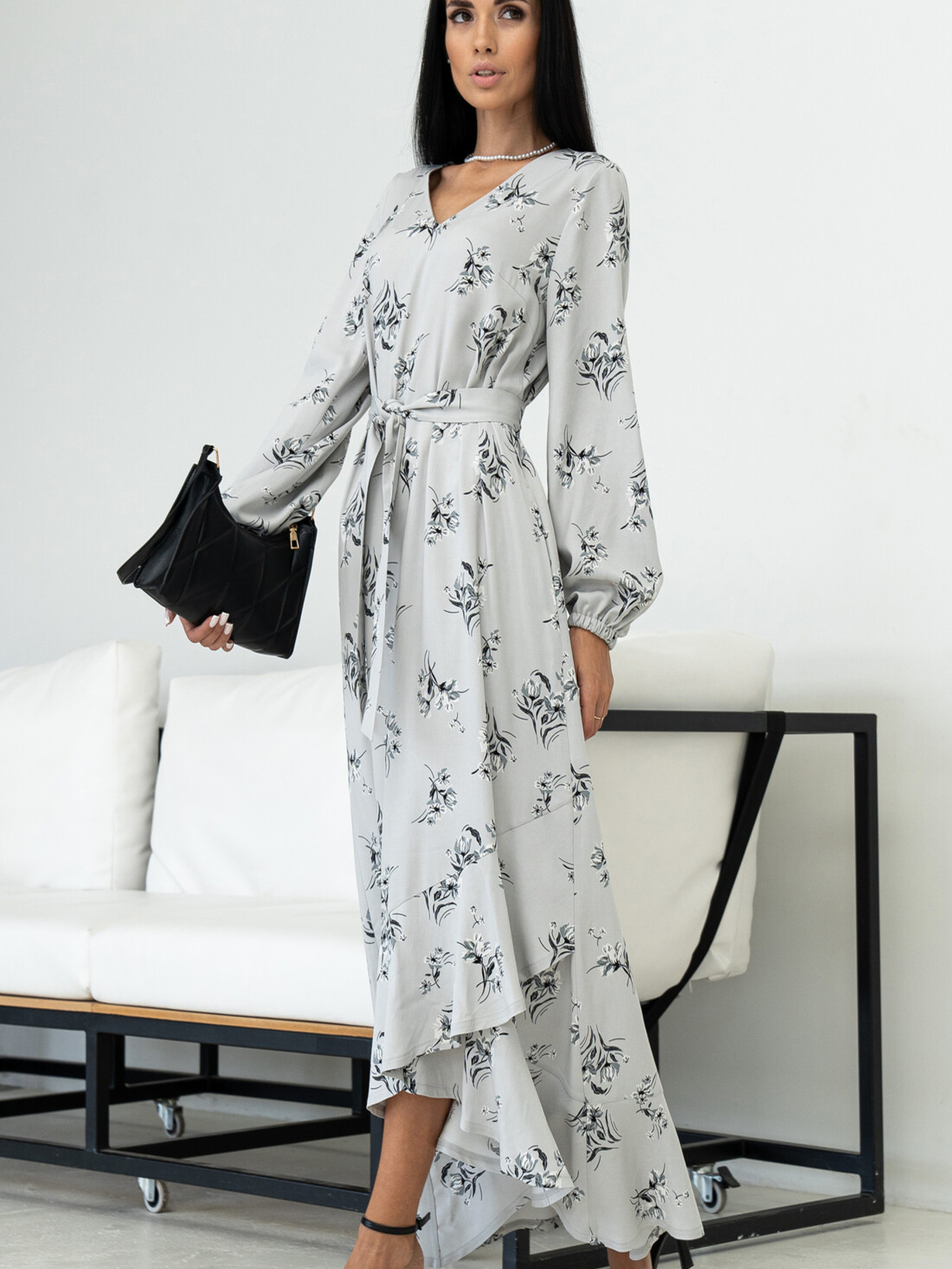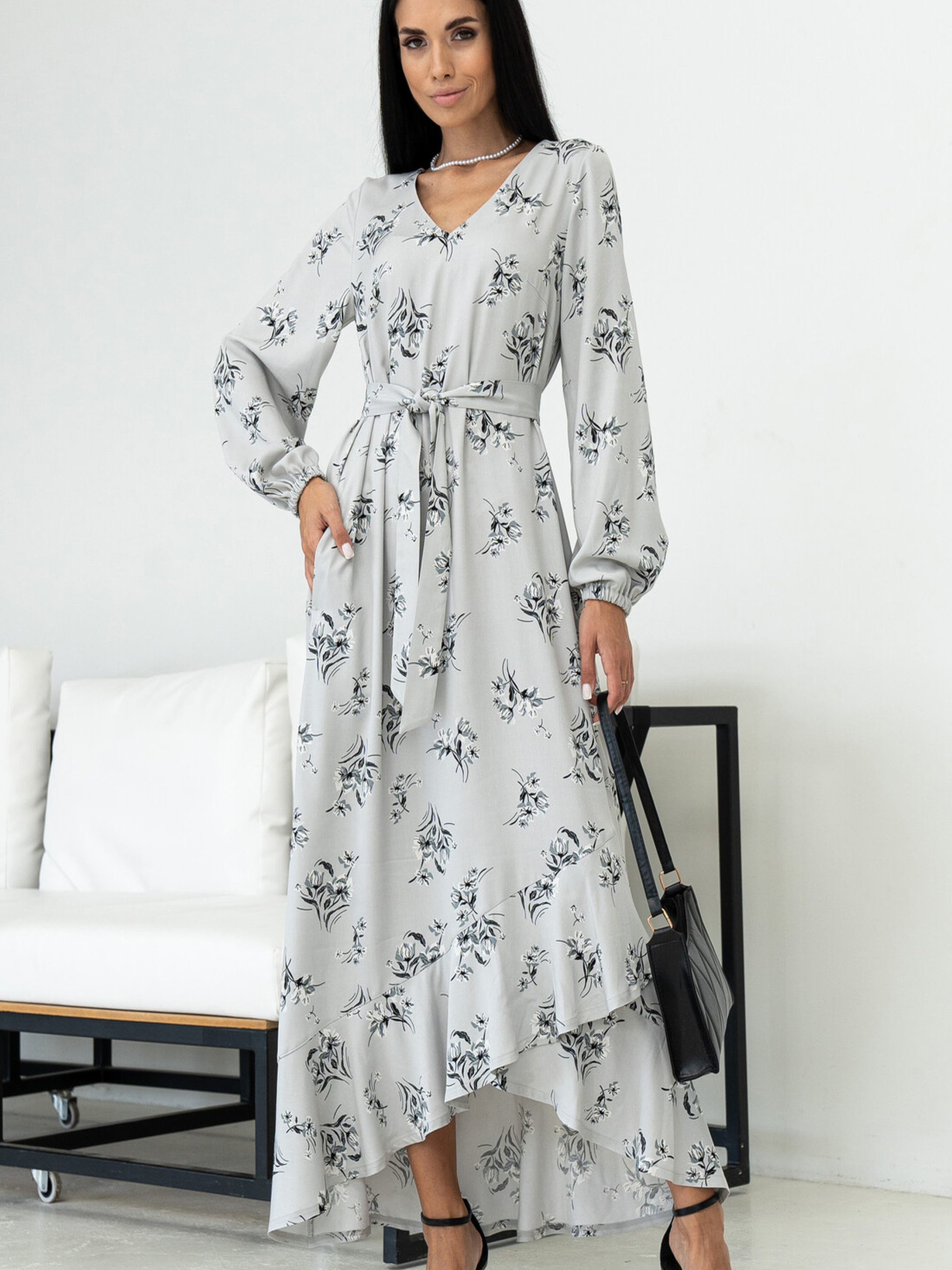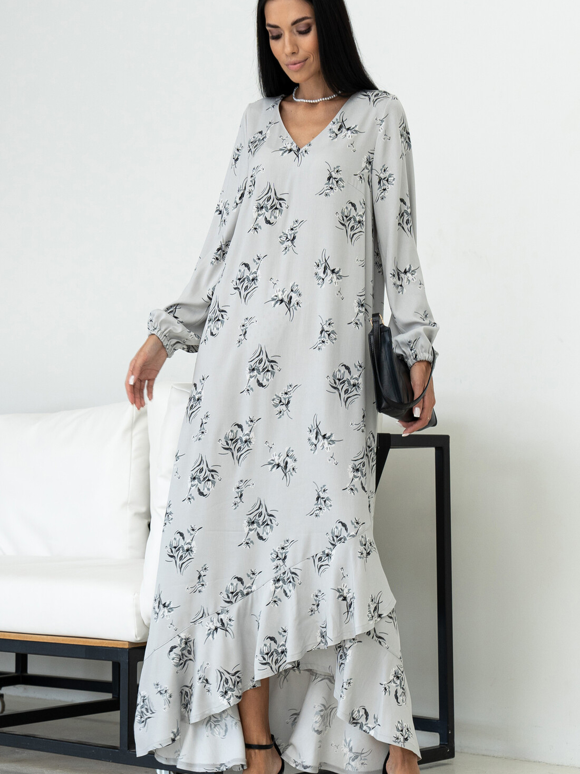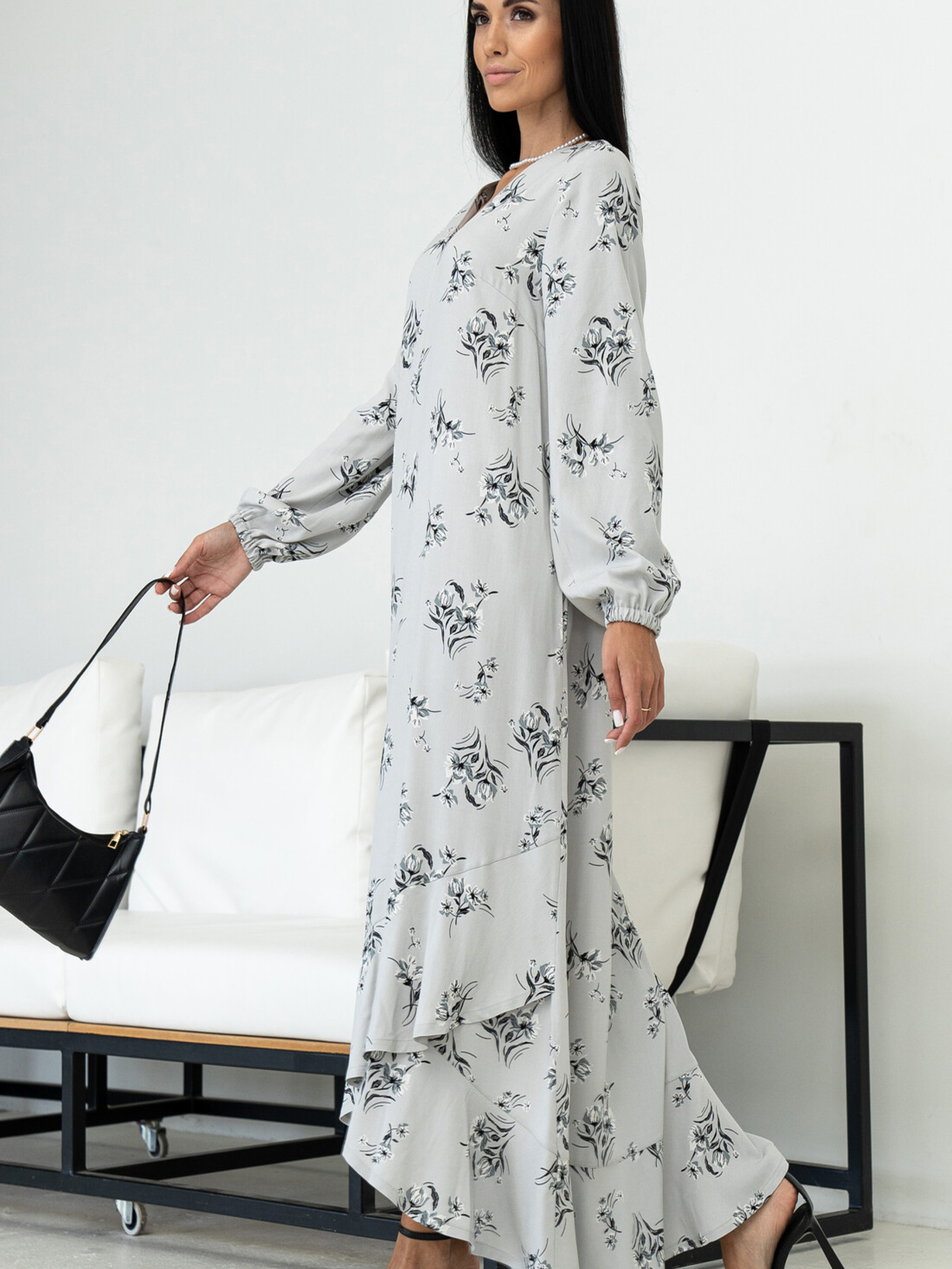 Жіночна сукня вільного силуету елегантної максі довжини поєднує в собі комфорт та вишуканість. Її V-подібна горловина підкреслює лінію шиї. Зручні кишені розташовані в бічних швах. По низу сукні йде асиметричний волан, що додає образу легкості та динаміки. Оригінальні рукави, розкльошені донизу та зібрані на еластичну стрічку, створюють ніжний акцент. У комплекті передбачений пояс з основної тканини, який допоможе підкреслити талію. Характеристики (залежно від кольору): Матеріал сукні (синій, чорний, сірий, сірий принт, хакі ка принт): Штапель-твіл (60% віскоза, 40% бавовна) Матеріал сукні (кориця): Штапель-твіл (100% бавовна) Крій: Вільний силует, максі довжина Горловина: V-подібна Рукав: Розкльошений донизу, зібраний на еластичну стрічку Деталі: Кишені в бічних швах, асиметричний волан по низу Додатково: Пояс із тканини сукні Стиль: Жіночний, елегантний, повсякденний, практичний Властивості: М'яка тканина з гарною драпірувальність (віскоза з бавовною) / Легка та дихаюча тканина (бавовна) Сезон: Літо, тепла весна/осінь