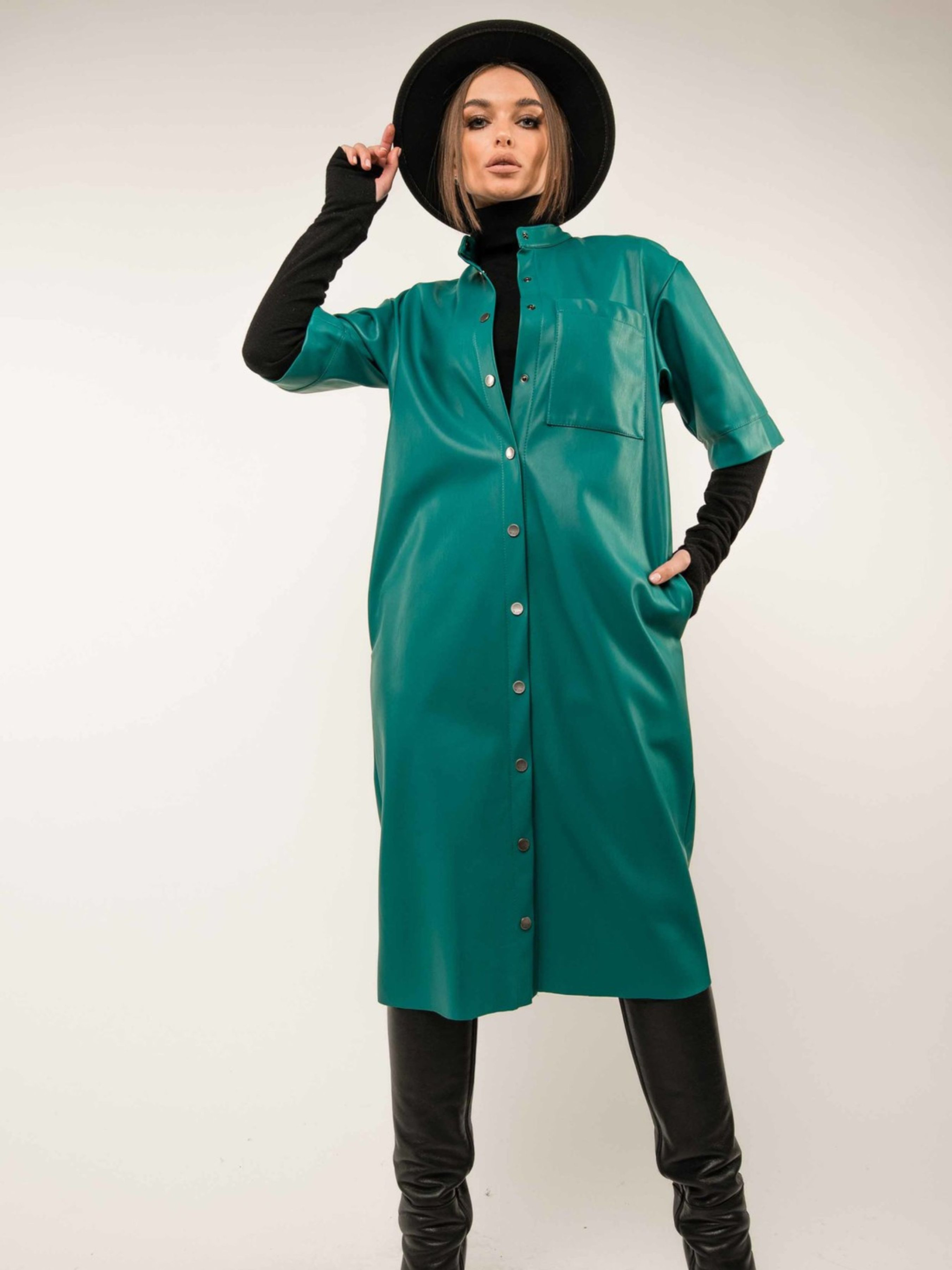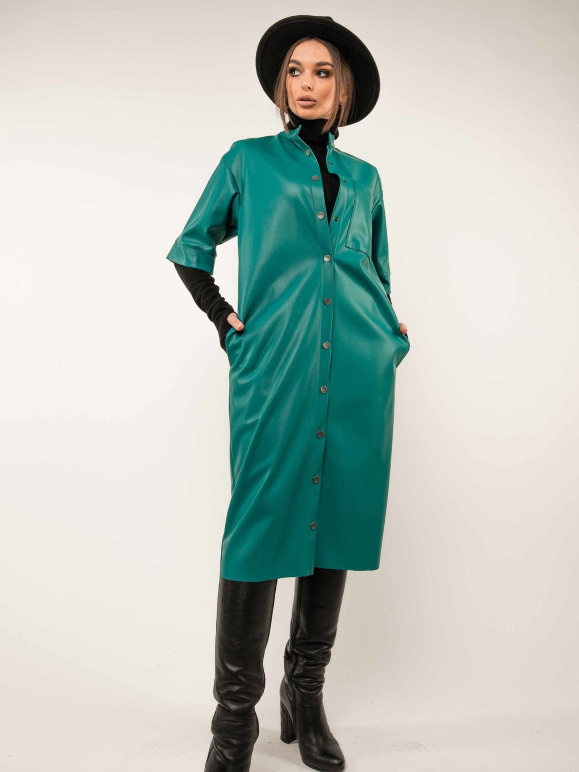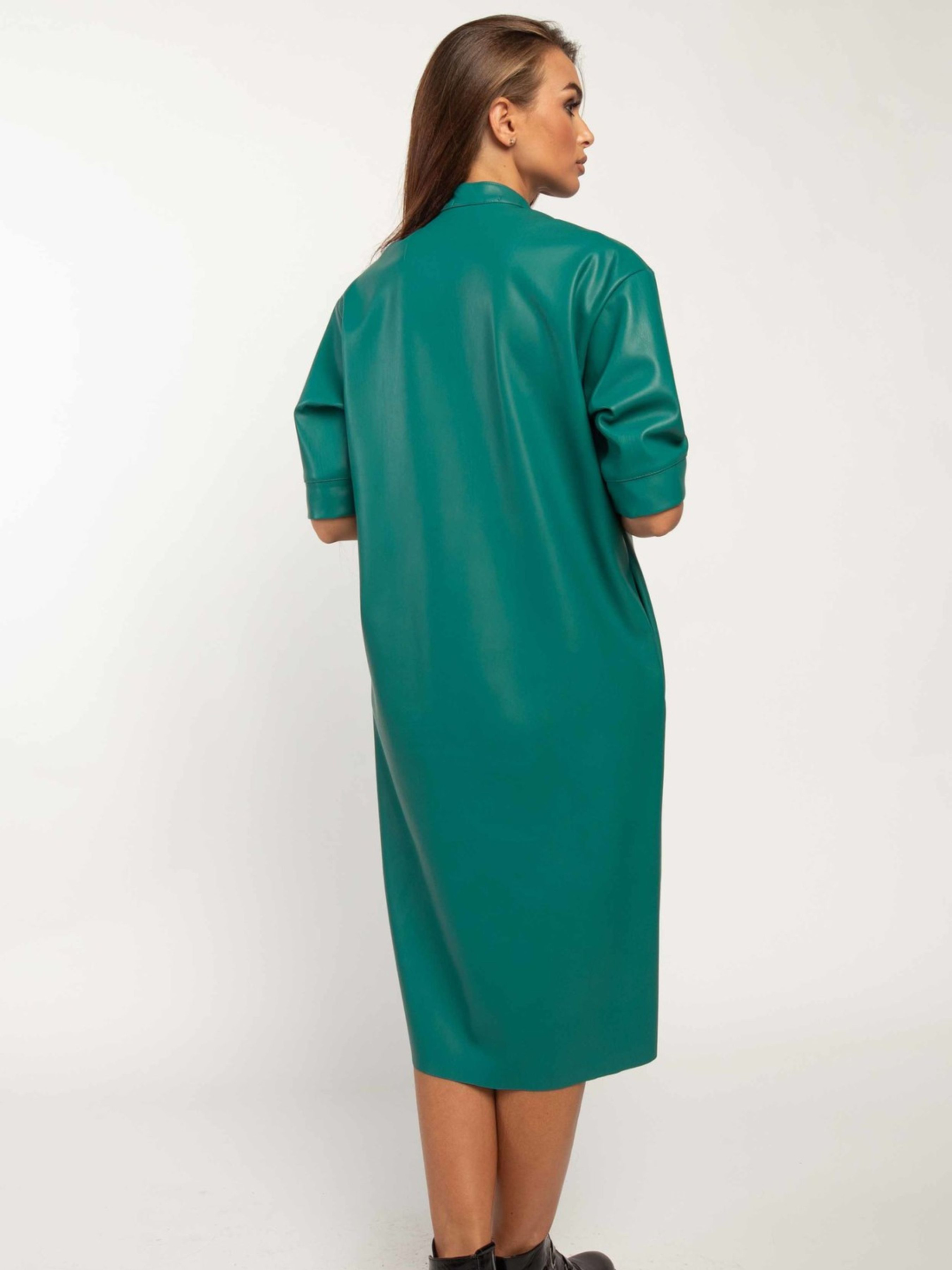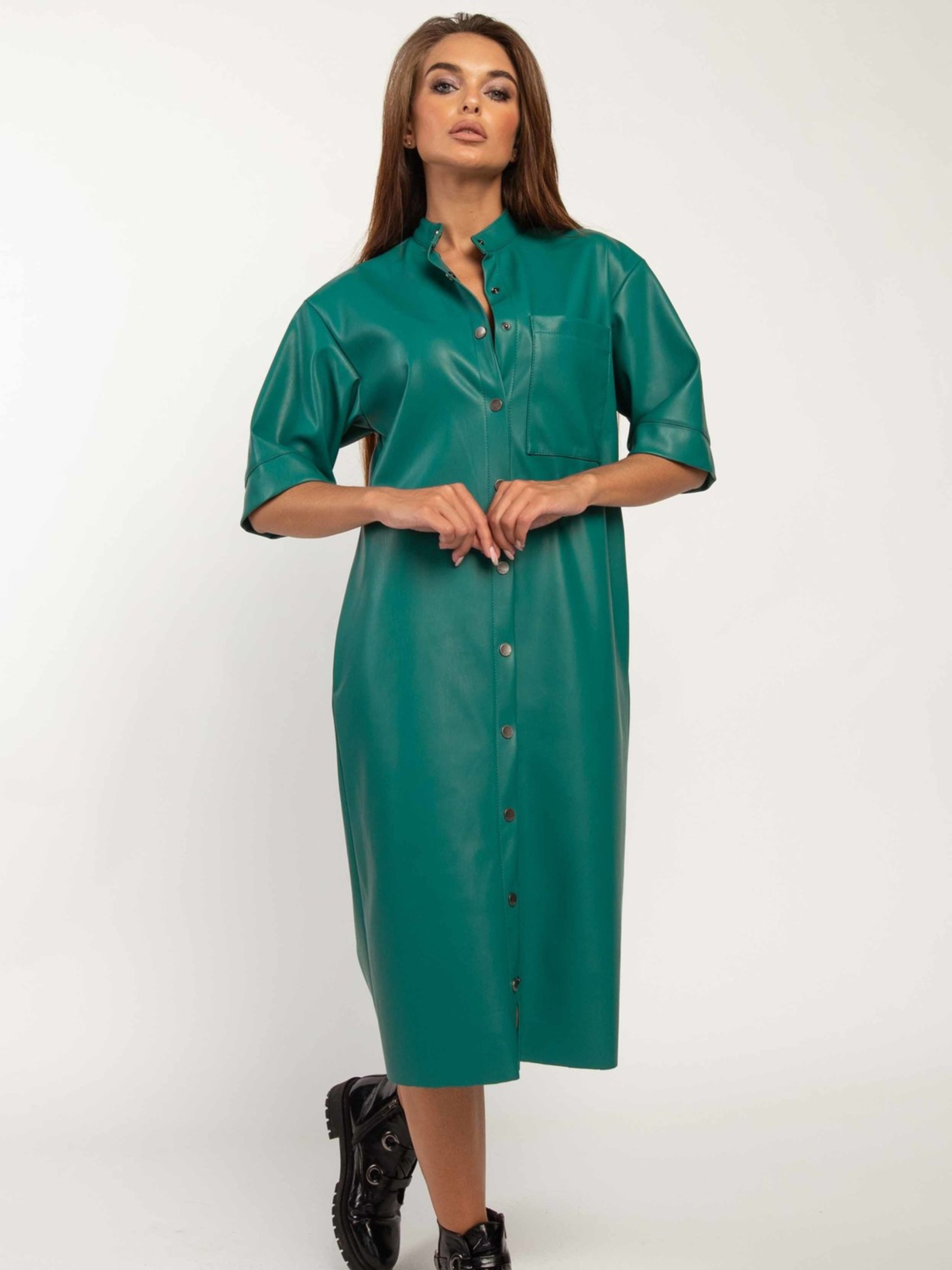 Супертрендова шкіряна сукня-тренч вільного силуету елегантної міді довжини стане яскравим та універсальним елементом вашого гардеробу. Функціональна центральна застібка на кнопки дозволяє легко регулювати ступінь відкритості. Спущена лінія плеча та короткий рукав з широкою манжетою створюють сучасний та розслаблений силует. Зліва на грудях розташована практична функціональна кишеня, а зручні кишені оброблені в бічних швах. Цю модель можна носити як самостійну стильну сукню, так і у вигляді ефектного кардигану, що додасть вашому образу завершеності. Комбінуючи її з теплим гольфом або футболкою, ви отримаєте безліч варіантів для різних ситуацій, підкреслюючи універсальність цієї трендової речі. Характеристики: Матеріал: Екошкіра Крій: Вільний силует, тренч Довжина: Міді Застібка: Функціональна центральна на кнопки Рукав: Короткий, спущене плече, широка манжета Кишені: Функціональна на грудях (зліва), у бічних швах Універсальність: Можна носити як сукню та як кардиган Комбінаторність: Чудово поєднується з гольфами та футболками Стиль: Супертрендовий, повсякденний, стильний, універсальний Зріст моделі: 164 см Розмір одягу на моделі: 42