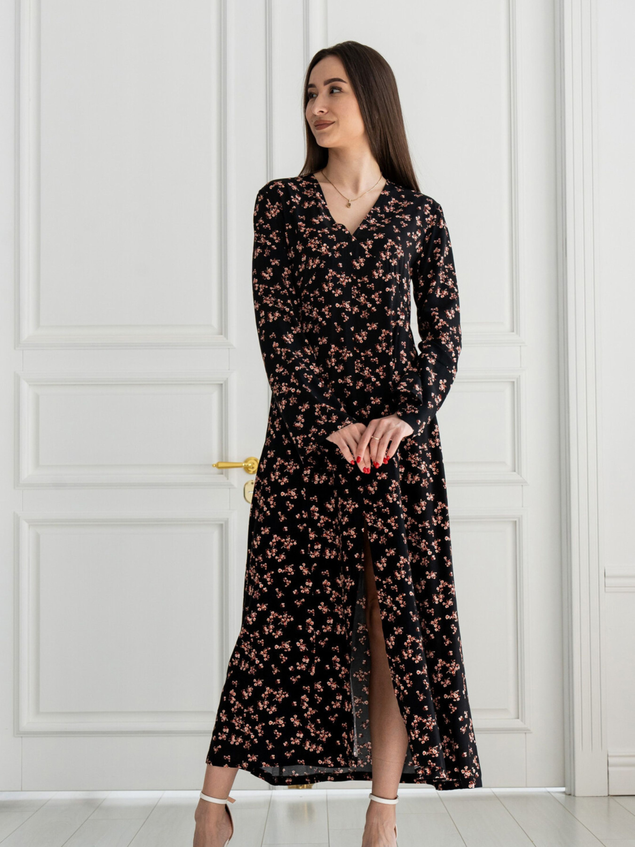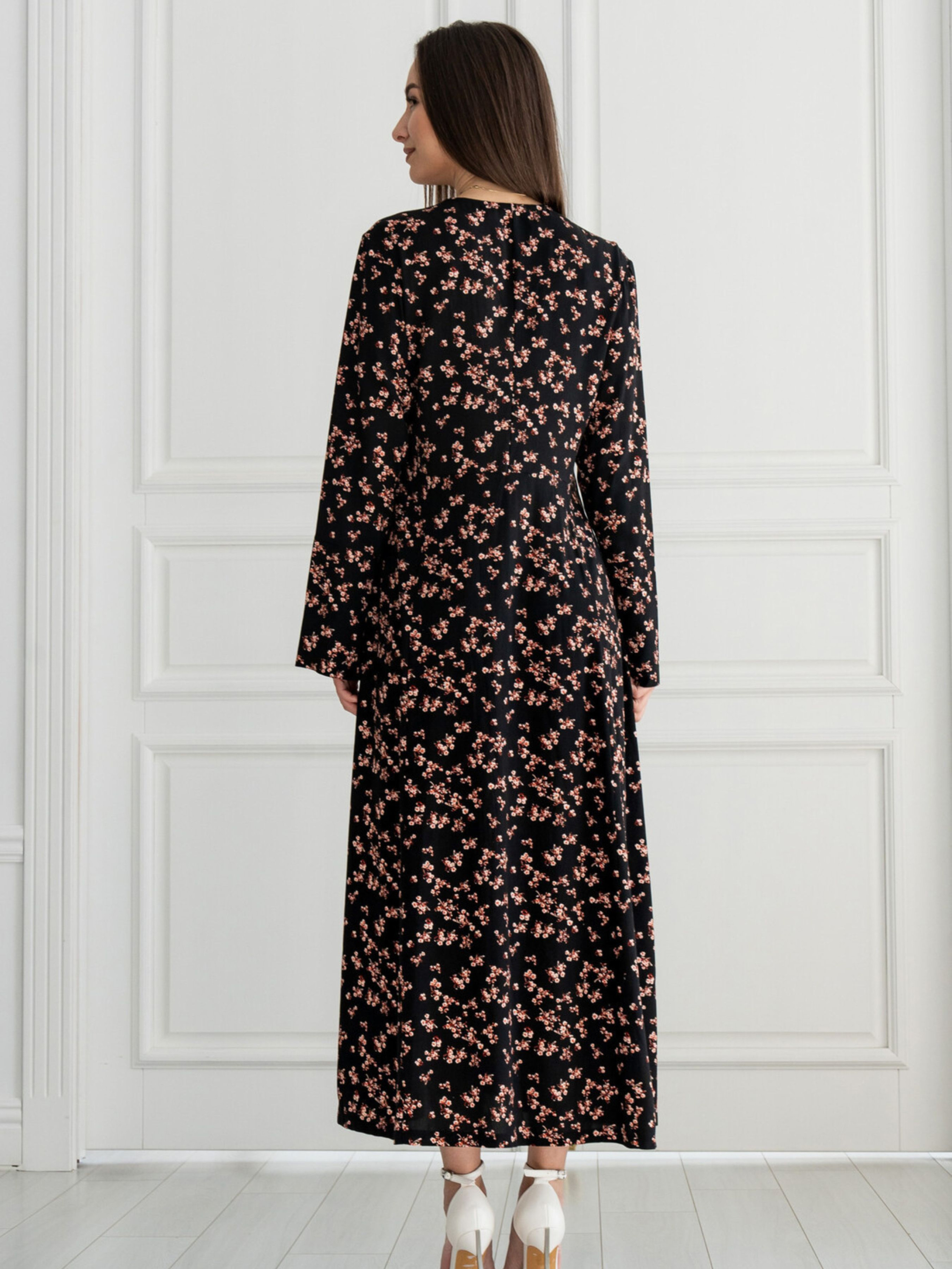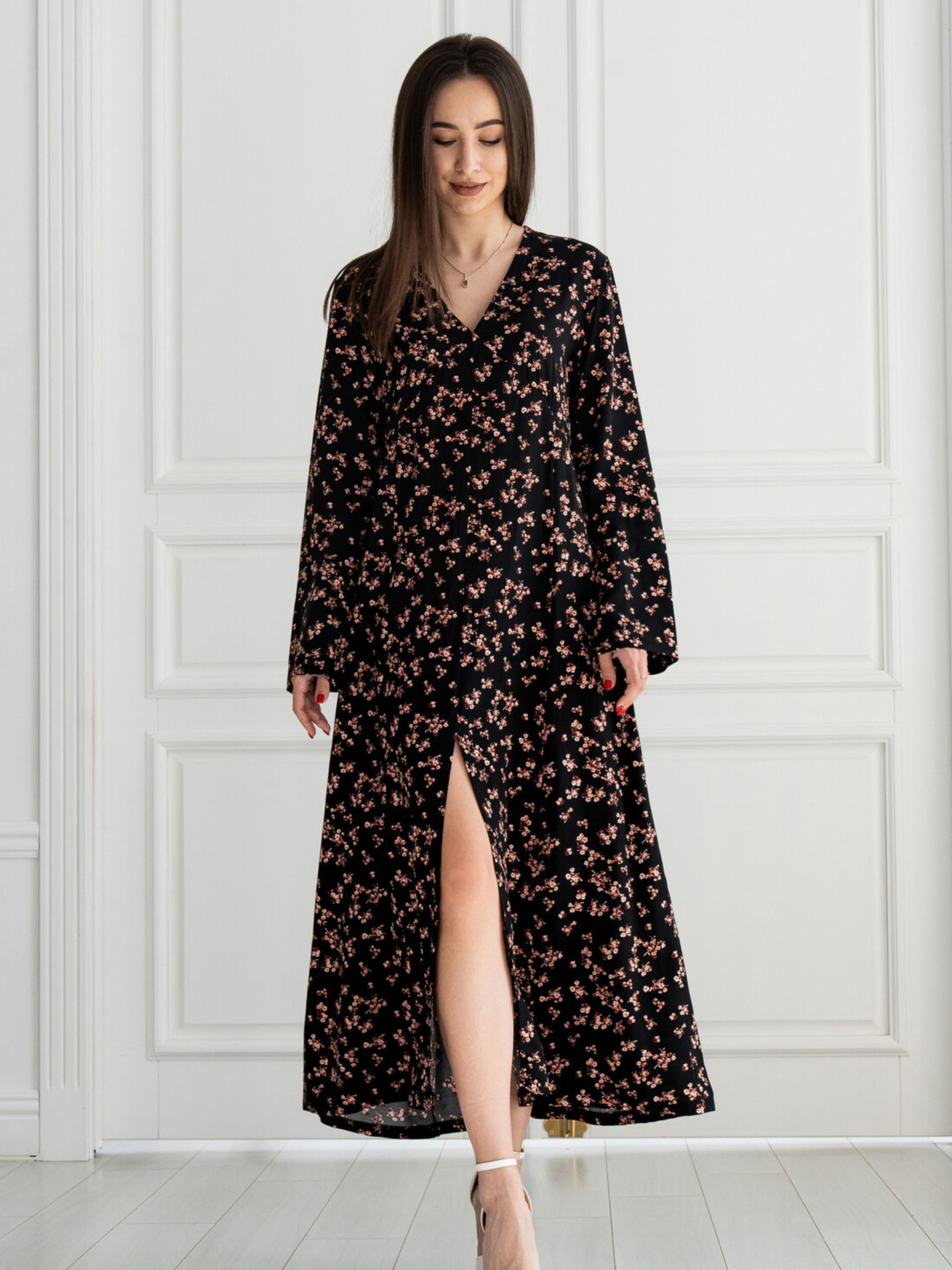 Виразно стильна та надзвичайно комфортна сукня А-силуету елегантної максі довжини стане чудовим вибором для створення жіночних образів. Її широка спідниця гармонійно поєднується з розкльошеною манжетою на вільному рукаві. Поглиблена V-подібна горловина доповнена напівкруглими відрізними деталями, що підкреслюють витонченість. По переду сукні проходить середній шов, який завершується невеликим розрізом. Зверніть увагу, що пояс до комплекту не входить, що дає вам можливість додати свій улюблений аксесуар. Залежно від кольору, сукня виготовлена з різних натуральних та приємних до тіла матеріалів: Однотонні кольори: Штапель (100% бавовна) - легка та дихаюча тканина. Принти (сірий, чорний): Штапель (100% віскоза) - м'яка, струмлива тканина з гарними драпірувальними властивостями. Обидва матеріали ідеально підходять для теплої погоди, забезпечуючи комфорт протягом усього дня. Характеристики (залежно від кольору): Матеріал сукні (однотонні): Штапель (100% бавовна) Матеріал сукні (сірий принт, чорний принт): Штапель (100% віскоза) Крій: А-силует, максі довжина Горловина: Поглиблена V-подібна з напівкруглими відрізними деталями Рукав: Вільний, з розкльошеною манжетою Деталі: Середній шов по переду з розрізом Пояс: Не входить до комплекту Стиль: Стильний, жіночний, комфортний, повсякденний Властивості: Легка, дихаюча тканина (бавовна) / м'яка, струмлива тканина (віскоза) Сезон: Літо, тепла весна/осінь