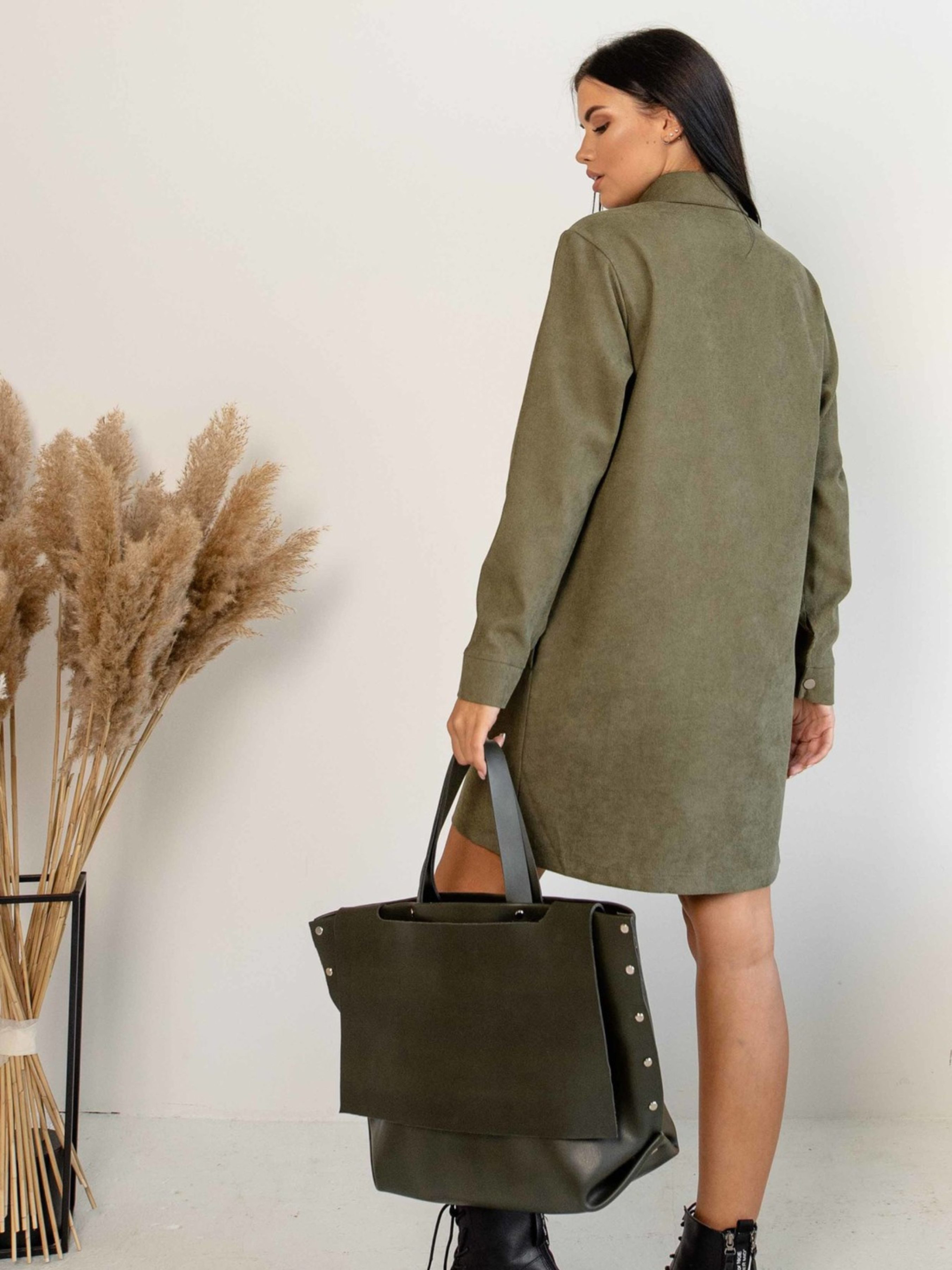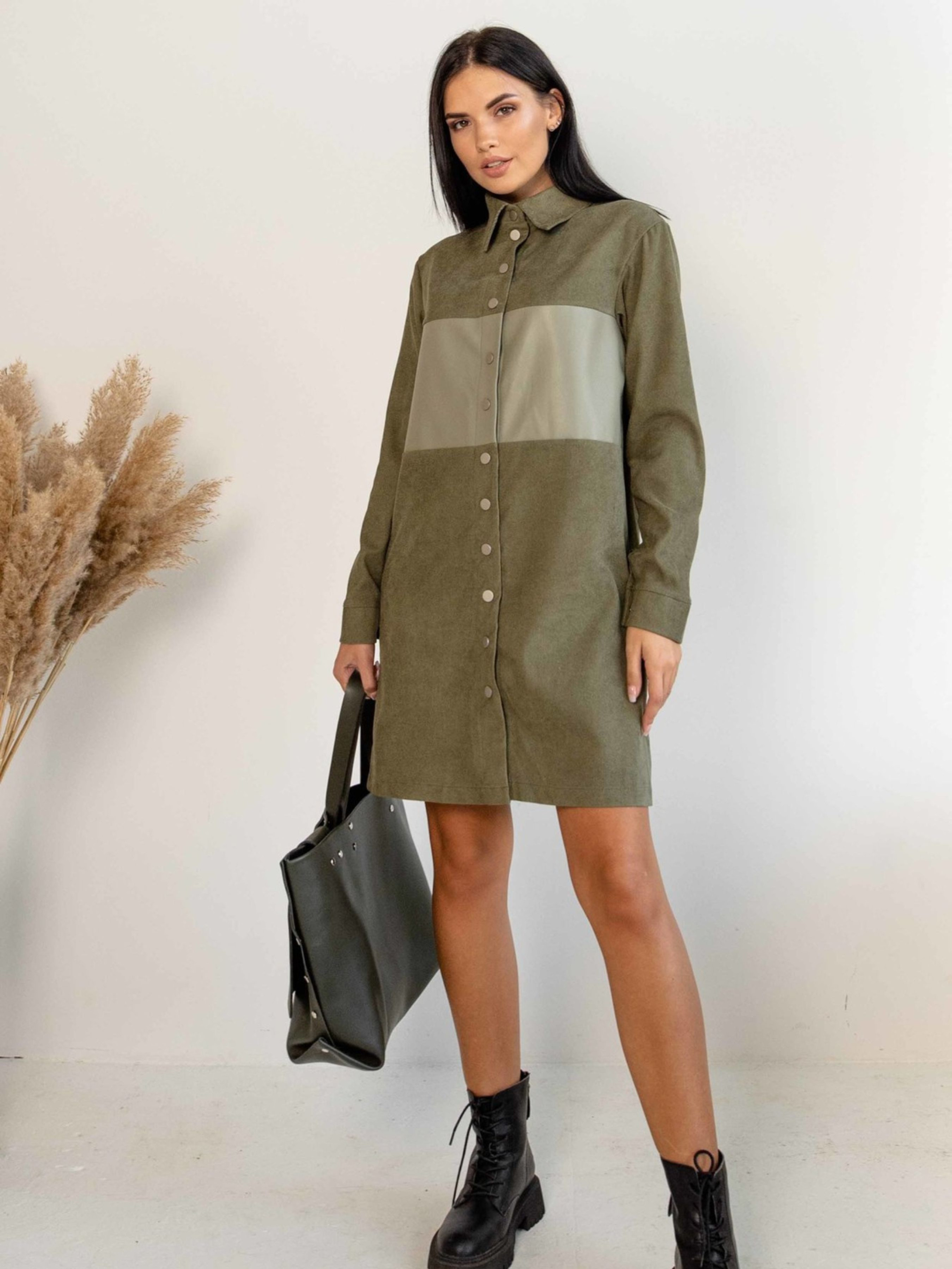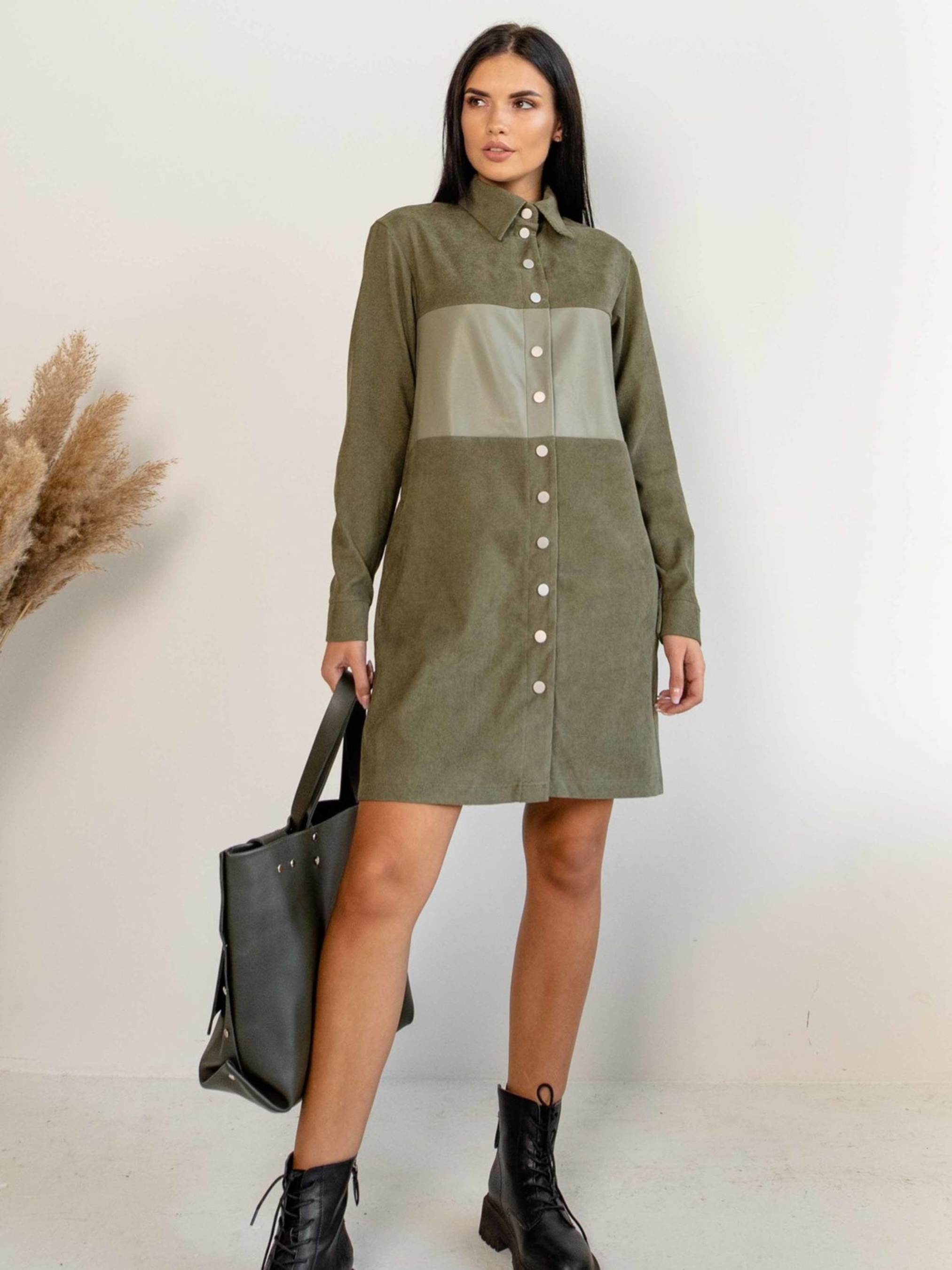 Повсякденна сукня-сорочка вільного силуету міні-довжини стане стильним та універсальним елементом вашого гардеробу. Функціональна центральна застібка на кнопки дозволяє легко регулювати образ. Горловина оформлена акуратним відкладним коміром-стійкою. Особливої самобутності сукні надає декоративна вставка з екошкіри на рівні грудей. Лінія плеча злегка спущена, а манжети рукавів застібаються на зручну кнопку. Практичні кишені розташовані в бічних швах. Ця сукня чудово підійде як для створення невимушеного офісного образу, так і для неформальних зустрічей. Основний матеріал – м'який вельвет, що забезпечує комфорт, а вставка з екошкіри додає образу сучасності та текстури. Характеристики: Основний матеріал: Вельвет (56% поліестер, 34% віскоза, 10% бавовна) Оздоблювальна тканина: Екошкіра на замшевій основі (100% PU, основа 100% віскоза) - декоративна вставка на грудях Крій: Вільний силует, міні-довжина, сорочка Застібка: Функціональна центральна на кнопки Горловина: Відкладний комір-стійка Рукав: Довгий, злегка спущена лінія плеча, манжета на кнопці Кишені: У бічних швах Стиль: Повсякденний, офісний (casual), неформальний, стильний Властивості: Комфортна тканина (вельвет), стильна деталь (екошкіра), універсальна