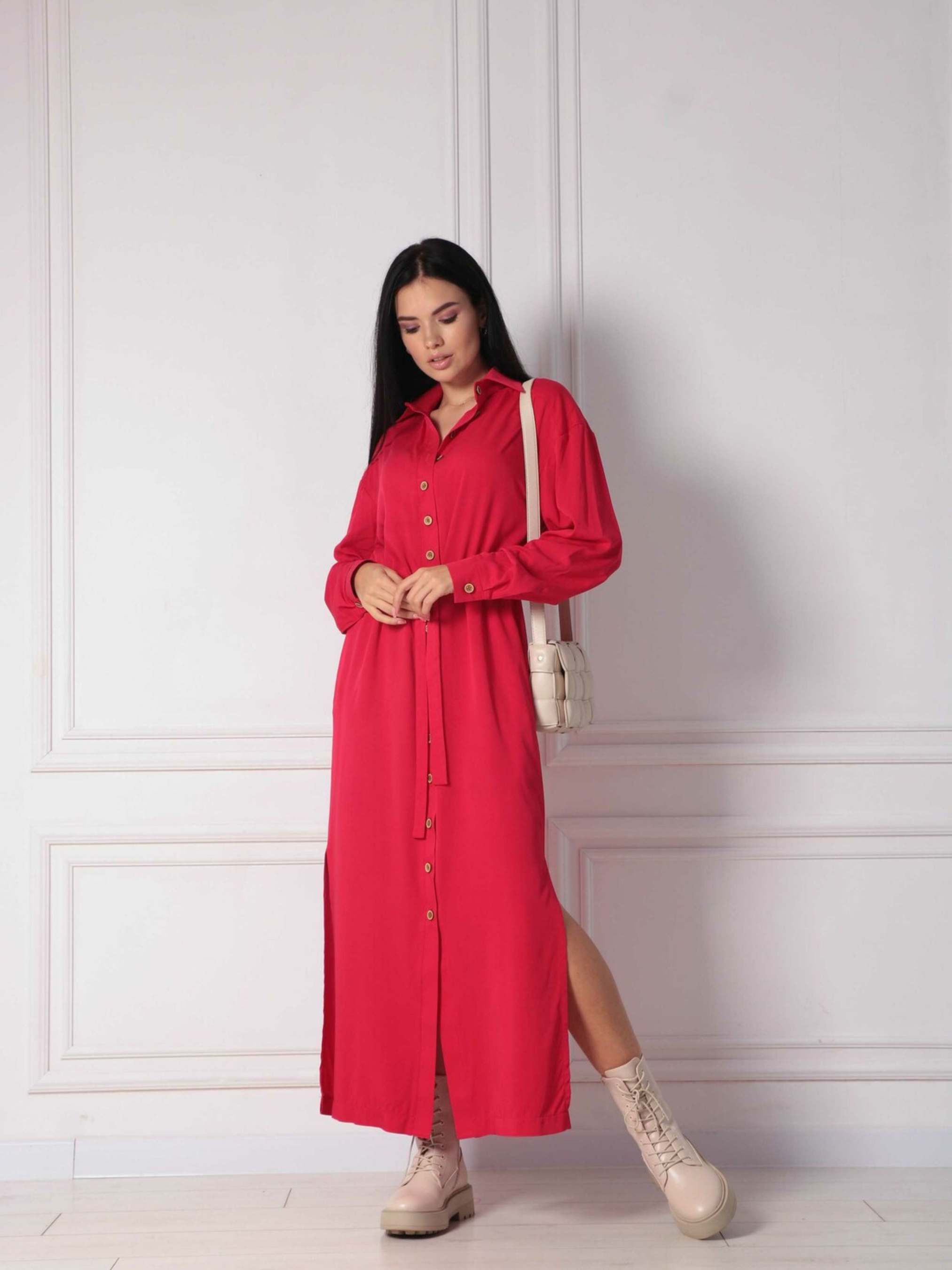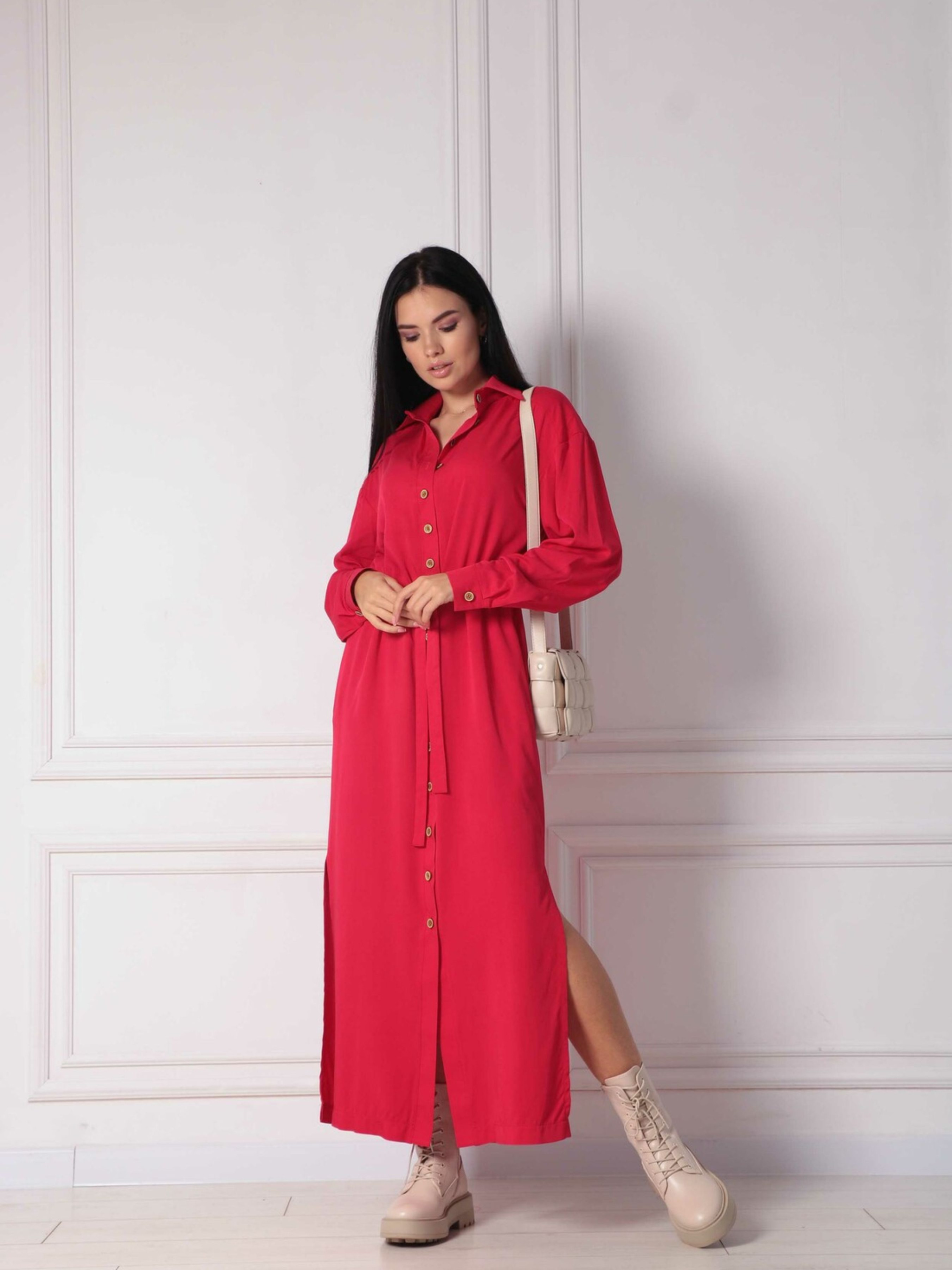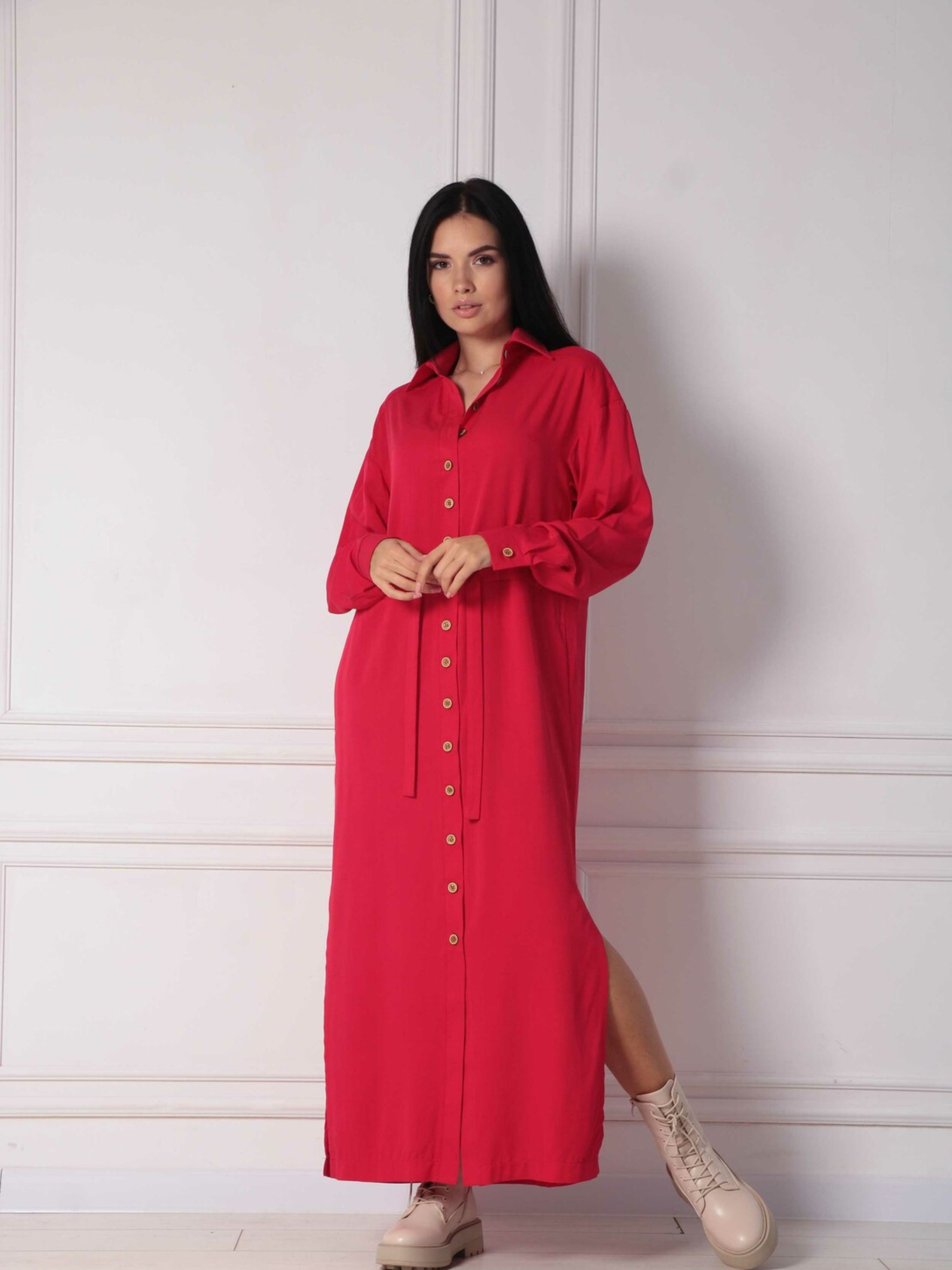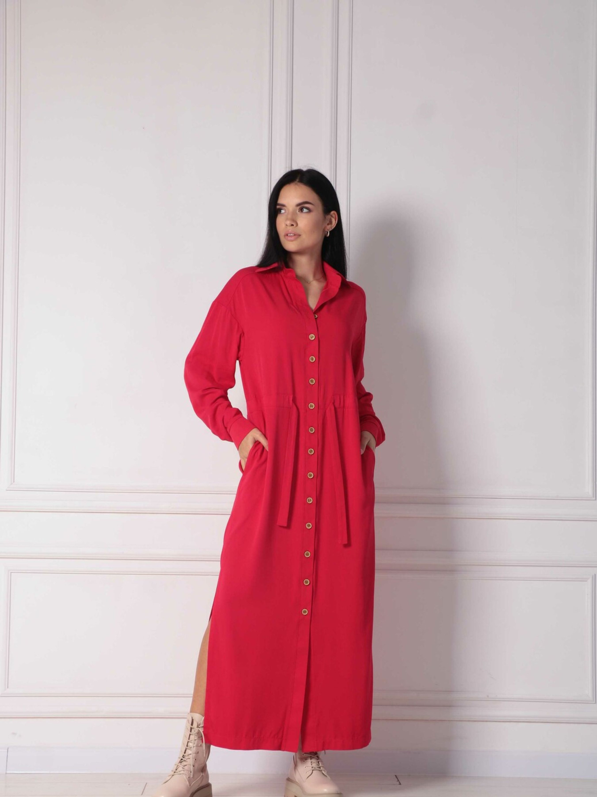 Ніжна повсякденна сукня-сорочка вільного прямого крою елегантної міді довжини стане універсальним та улюбленим елементом вашого гардеробу, що пасуватиме для будь-якої події. Класичний відкладний комір додає образу стриманості. По всій довжині переду розташована функціональна застібка на ґудзики, а зручні кишені в бічних швах роблять сукню практичною. Розрізи по низу до рівня колін забезпечують свободу рухів. Особливістю моделі є оригінальна широка куліска по лінії талії, в яку протягнутий пояс, що дозволяє підкреслити фігуру. Виготовлена з м'якого та приємного до тіла штапелю зі 100% бавовни, ця сукня подарує вам відчуття легкості та комфорту протягом усього дня. Її ніжний дизайн та зручний крій роблять її ідеальною для створення різноманітних повсякденних образів. Характеристики: Матеріал: Штапель (100% бавовна) Стиль: Повсякденний, ніжний, зручний Крій: Прямий, вільний силует, сорочка Довжина: Міді Комір: Відкладний Застібка: Функціональна на ґудзики по всій довжині переду Кишені: У бічних швах Деталі: Розрізи по низу до рівня колін, широка куліска по талії з поясом Властивості: М'яка, приємна до тіла тканина, комфортний крій, універсальна