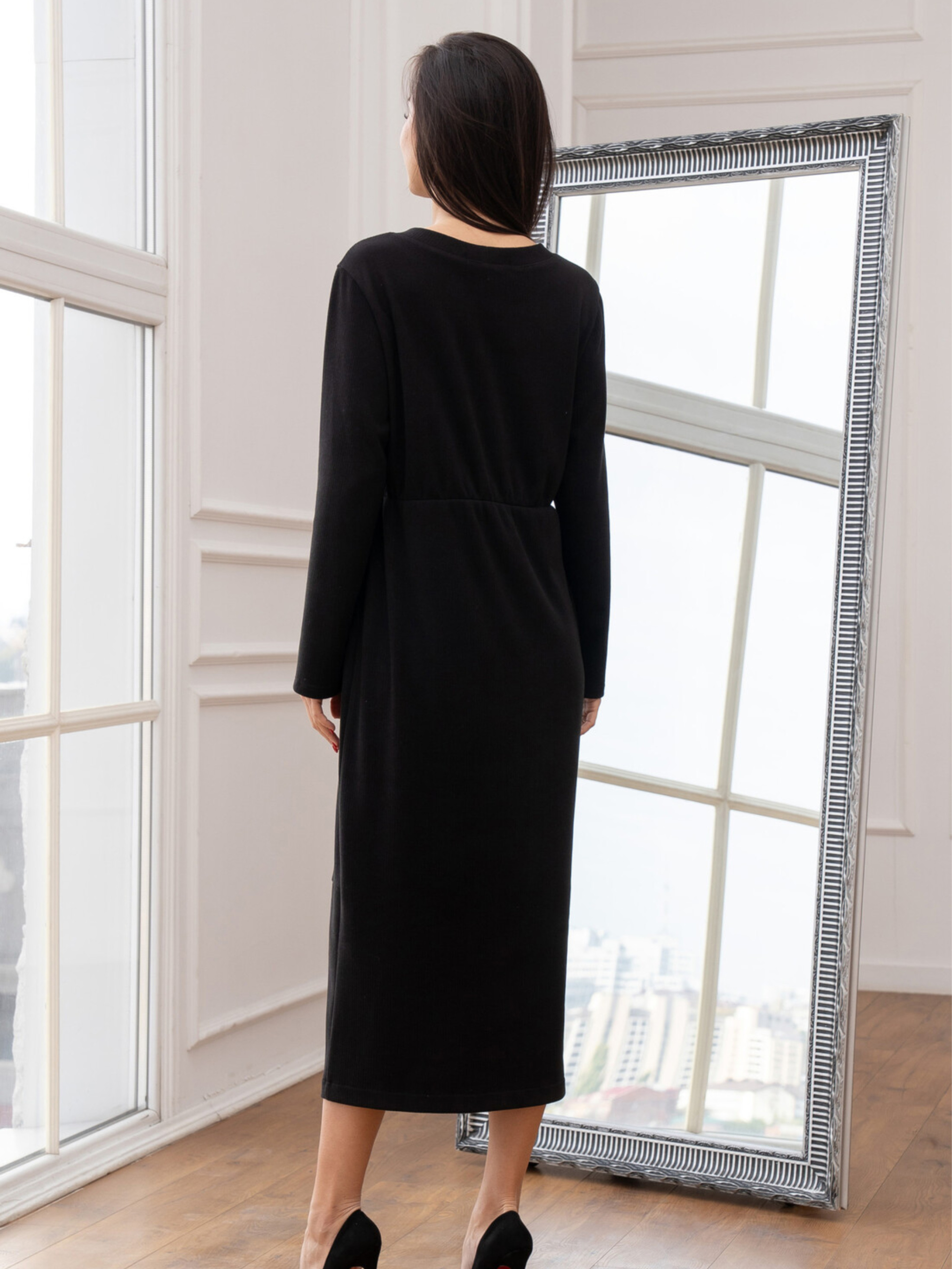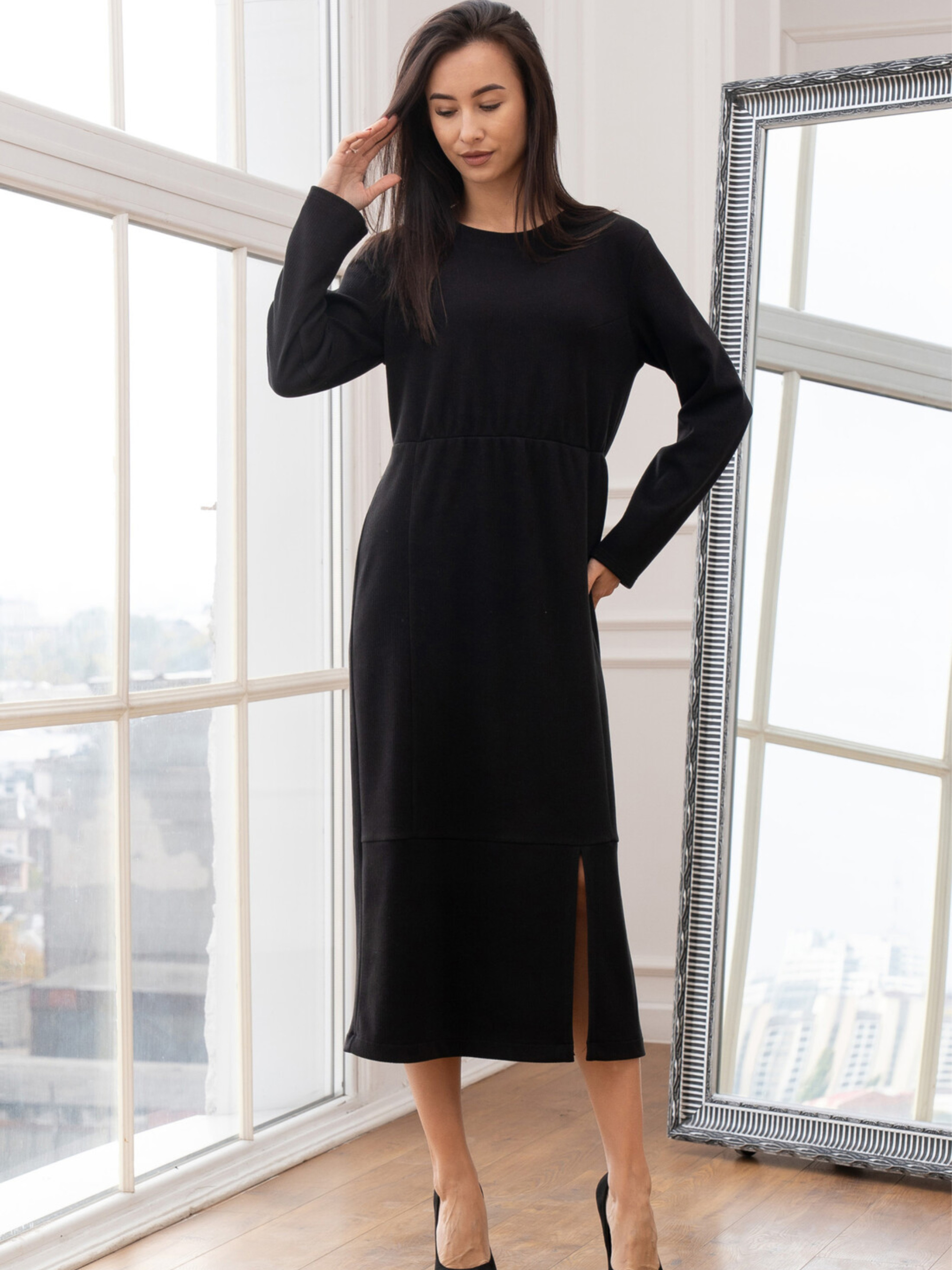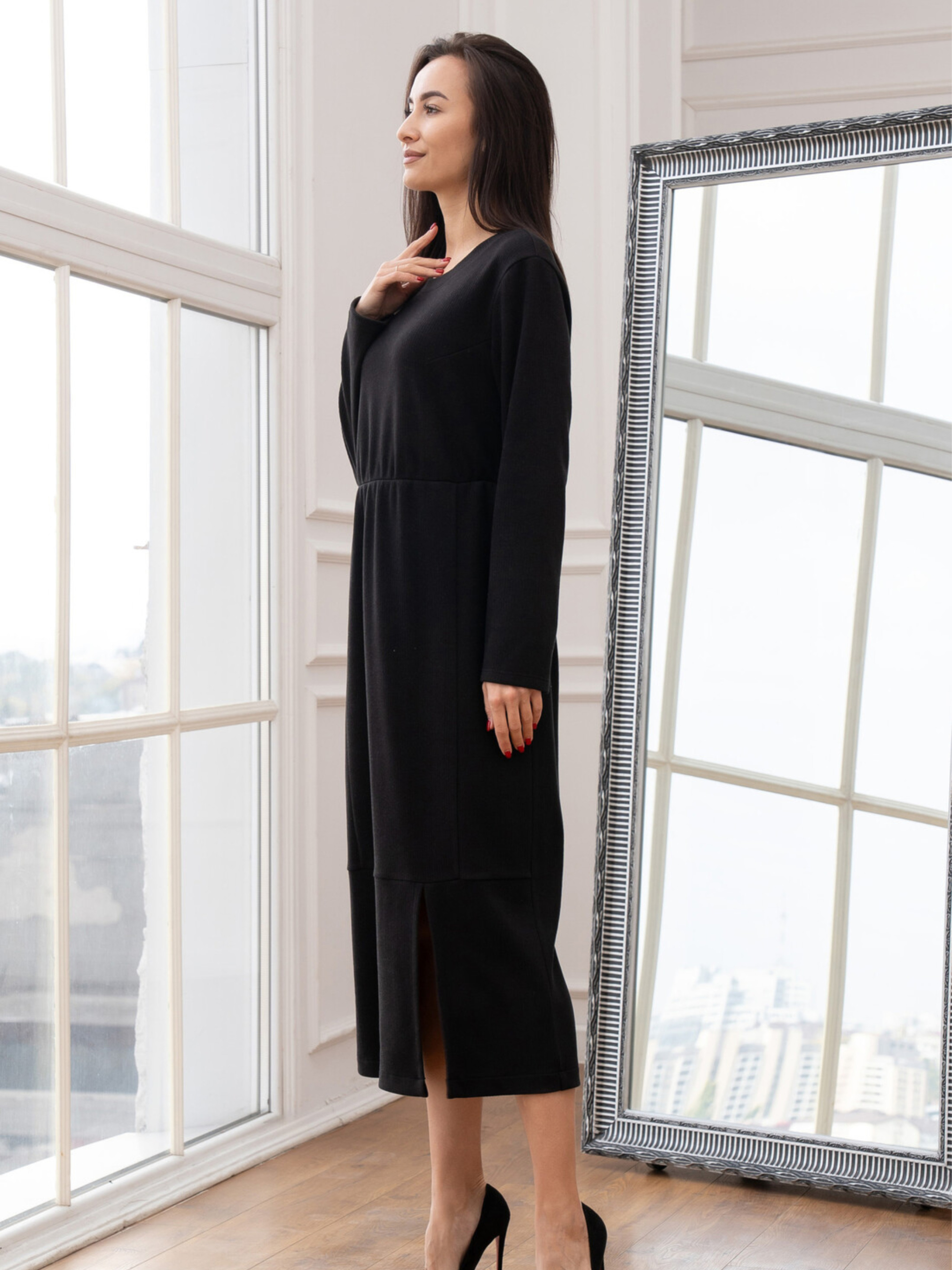 Стильна трикотажна сукня Улана з розрізом створена для жінок, які цінують комфорт і елегантність у щоденному одязі. М'який приємний до тіла трикотаж забезпечує свободу рухів, а продуманий крій підкреслює фігуру та робить образ жіночним у будь-якій ситуації. Характеристики: Модель: жіноча сукня Улана Силует: напівприталений Довжина: міді Рукав: довгий Матеріал: трикотаж в рубчик Склад: 56% поліестер, 34% віскоза, 10% бавовна Особливості: відрізна талія, м’яка резинка, вертикальні рельєфи, боковий розріз Догляд: Прати при температурі 30°C Не використовувати відбілювачі Сушити у вертикальному положенні Праску використовувати на середньому режимі Не викручувати Як носити: Для casual-луку поєднуйте з кросівками, сліпонами або грубими черевиками. Для елегантного образу — з човниками, високими чоботами або акуратними черевиками. Додайте жакет, пальто чи коротку шкіряну куртку — і отримаєте стильний комплект на кожен день. Сукня виготовлена з трикотажу в рубчик, що відрізняється еластичністю, легкістю та гарною посадкою по фігурі. Напівприталений силует гармонійно окреслює лінії тіла, а відрізна талія зі злегка зібраною резинкою додає моделі акцентованого, пропорційного вигляду. Довгий рукав робить сукню універсальною для прохолодної пори року. Вертикальні рельєфи візуально витягують силует, додають стрункості та витонченості. Розріз у лівому боковому шві забезпечує зручність під час ходьби та додає образу легкої жіночності. Це ідеальний варіант як для повсякденних образів, так і для стильних вечірніх виходів — залежить лише від аксесуарів та взуття, з якими ви її поєднаєте.