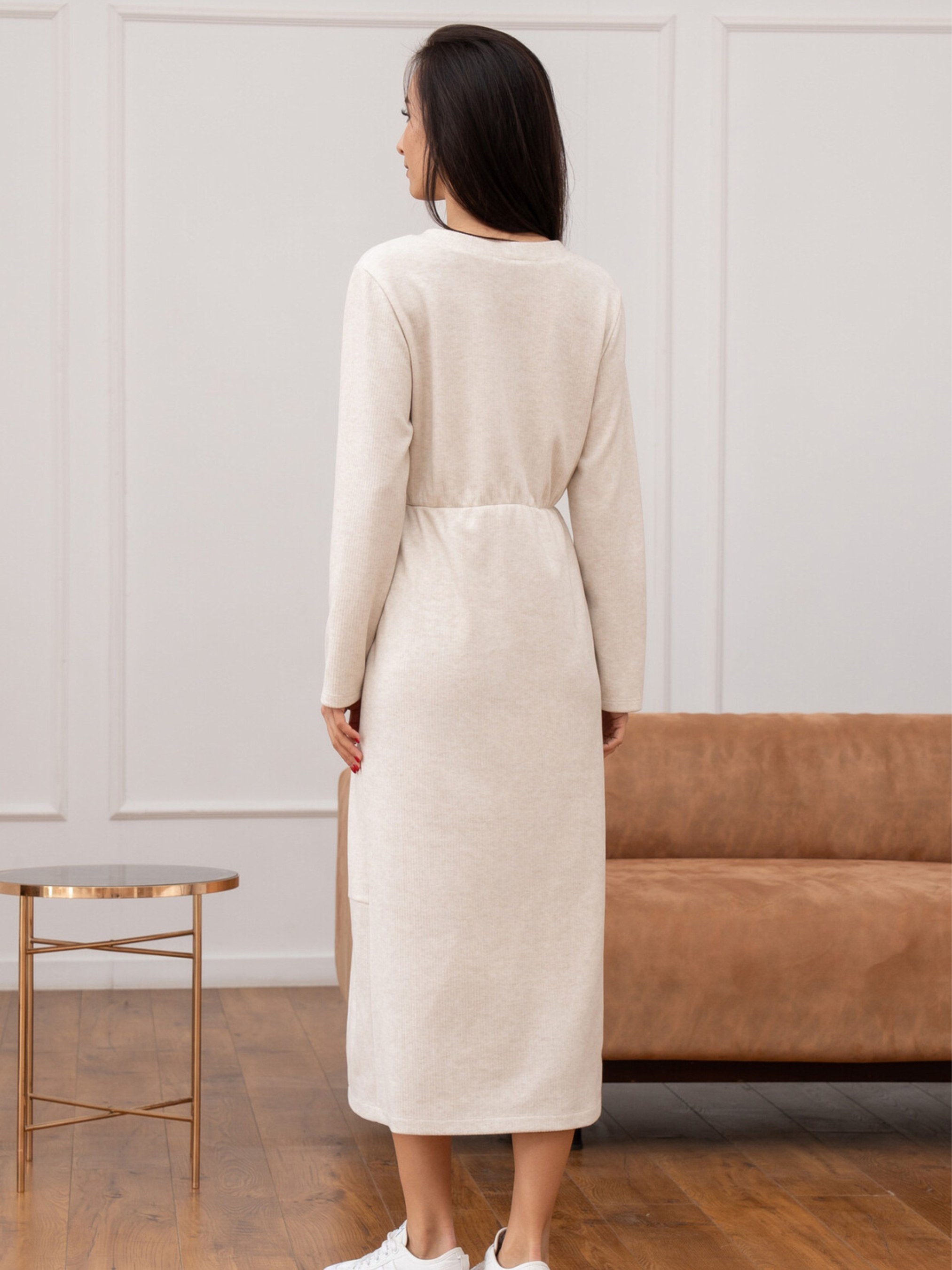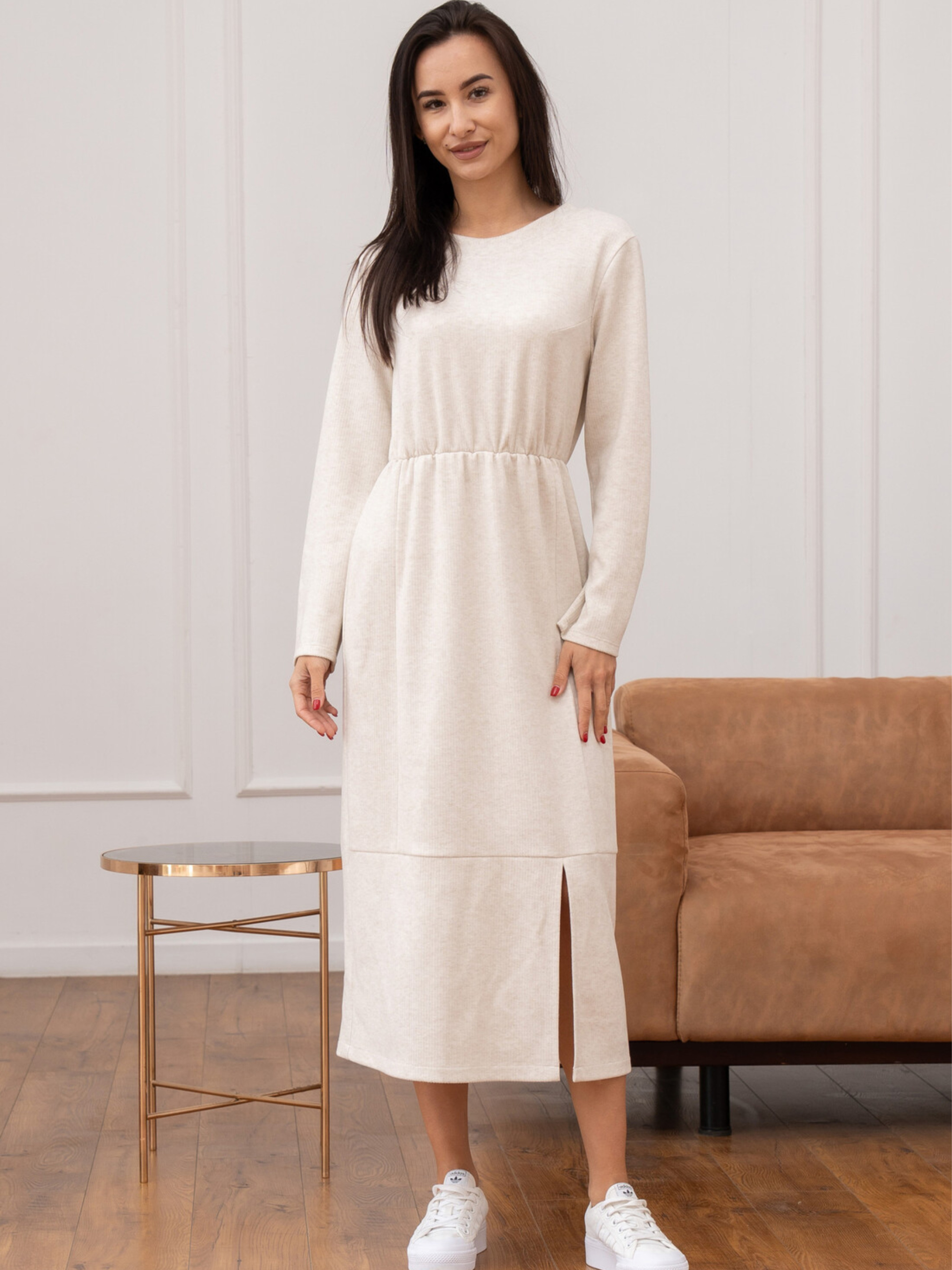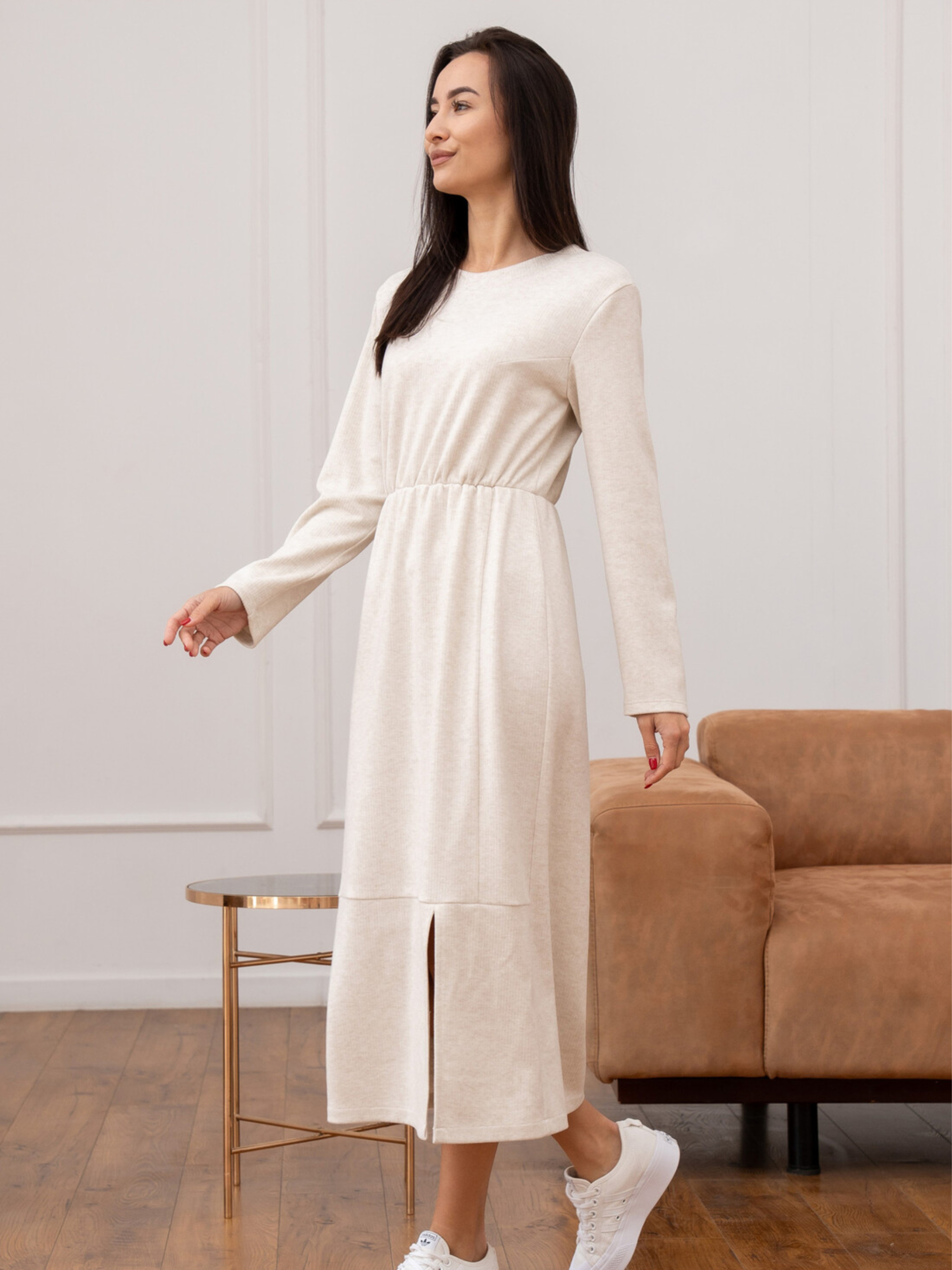Стильна трикотажна сукня Улана з розрізом створена для жінок, які цінують комфорт і елегантність у щоденному одязі. М'який приємний до тіла трикотаж забезпечує свободу рухів, а продуманий крій підкреслює фігуру та робить образ жіночним у будь-якій ситуації. Характеристики: Модель: жіноча сукня Улана Силует: напівприталений Довжина: міді Рукав: довгий Матеріал: трикотаж в рубчик Склад: 56% поліестер, 34% віскоза, 10% бавовна Особливості: відрізна талія, м’яка резинка, вертикальні рельєфи, боковий розріз Догляд: Прати при температурі 30°C Не використовувати відбілювачі Сушити у вертикальному положенні Праску використовувати на середньому режимі Не викручувати Як носити: Для casual-луку поєднуйте з кросівками, сліпонами або грубими черевиками. Для елегантного образу — з човниками, високими чоботами або акуратними черевиками. Додайте жакет, пальто чи коротку шкіряну куртку — і отримаєте стильний комплект на кожен день. Сукня виготовлена з трикотажу в рубчик, що відрізняється еластичністю, легкістю та гарною посадкою по фігурі. Напівприталений силует гармонійно окреслює лінії тіла, а відрізна талія зі злегка зібраною резинкою додає моделі акцентованого, пропорційного вигляду. Довгий рукав робить сукню універсальною для прохолодної пори року. Вертикальні рельєфи візуально витягують силует, додають стрункості та витонченості. Розріз у лівому боковому шві забезпечує зручність під час ходьби та додає образу легкої жіночності. Це ідеальний варіант як для повсякденних образів, так і для стильних вечірніх виходів — залежить лише від аксесуарів та взуття, з якими ви її поєднаєте.