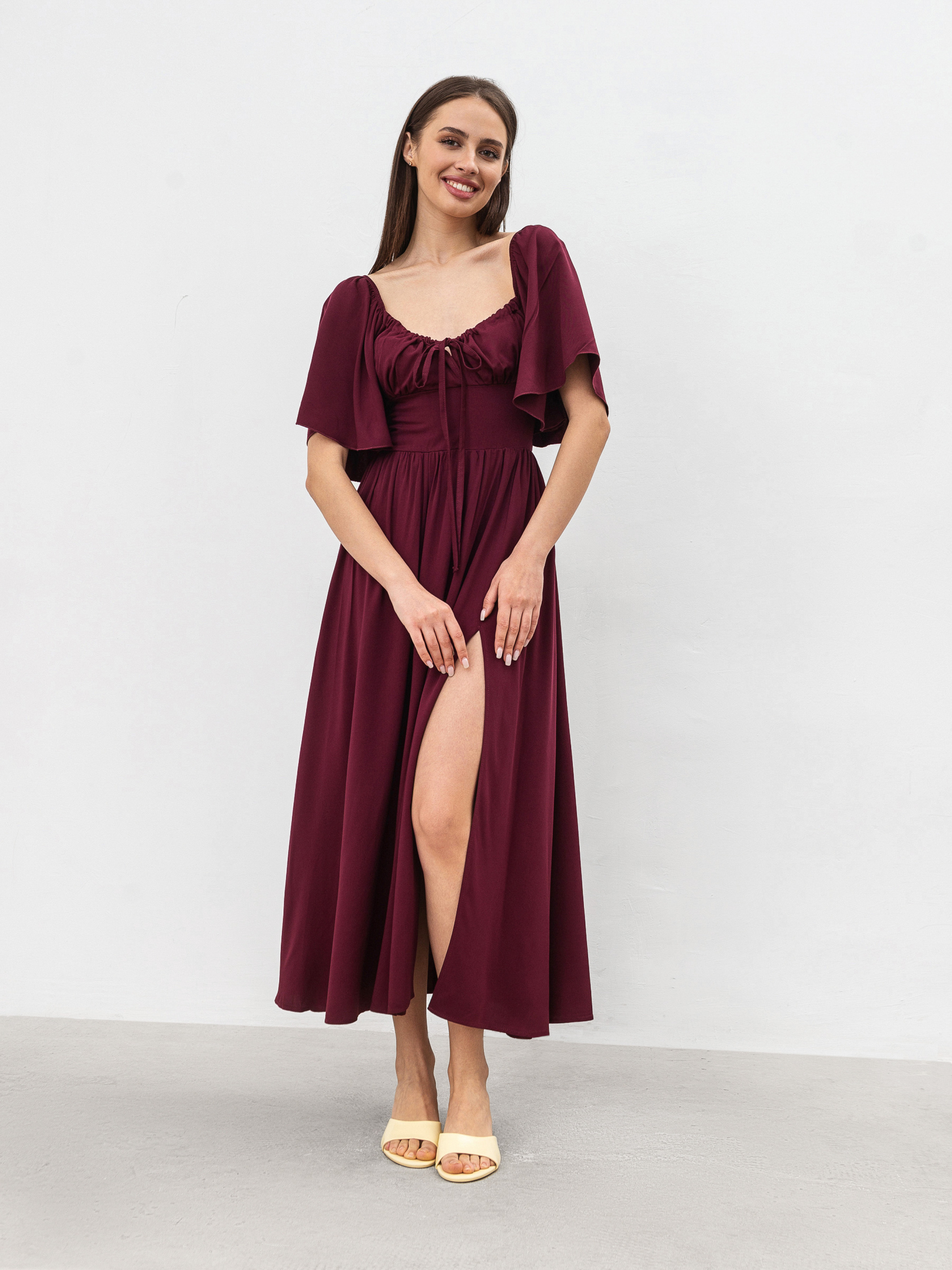 Платье Аврора - легкая и элегантная модель миди-длины, сочетающая комфорт и утонченность. Благодаря мягкому силуэту оно красиво садится по фигуре, создавая романтичный образ. Лиф со сборками дополнен завязками, позволяющими регулировать посадку, а спинка с эластичной вставкой обеспечивает удобство. Разрез на юбке добавляет легкости движениям, а нежные рукава-колокольчики на резинке создают воздушный эффект. Платье изготовлено из натурального штапеля, что дарит приятные тактильные ощущения и идеально подходит для теплого времени года. ХС-С Длина по спине: 120 см Длина рукава: 30 см Полуобхват груди: 31 см Полуобхват бедер: 60 см Плечи: 30 см Полуобхват талии: 29 см С-М Длина по спине: 121 см. Длина рукава: 31 см Полуобхват груди: 32 см Полуобхват бедер: 63 см Плечи: 31 см Полуобхват талии: 31 см М-Л Длина по спине: 121 см. Длина рукава: 31 см Полуобхват груди: 33 см Полуобхват бедер: 64 см Плечи: 33 см Полуобхват талии: 32 см Л-ХЛ Длина по спине: 122 см. Длина рукава: 32 см Полуобхват груди: 34 см Полуобхват бедер: 67 см Плечи: 34 см Полуобхват талии: 33 см