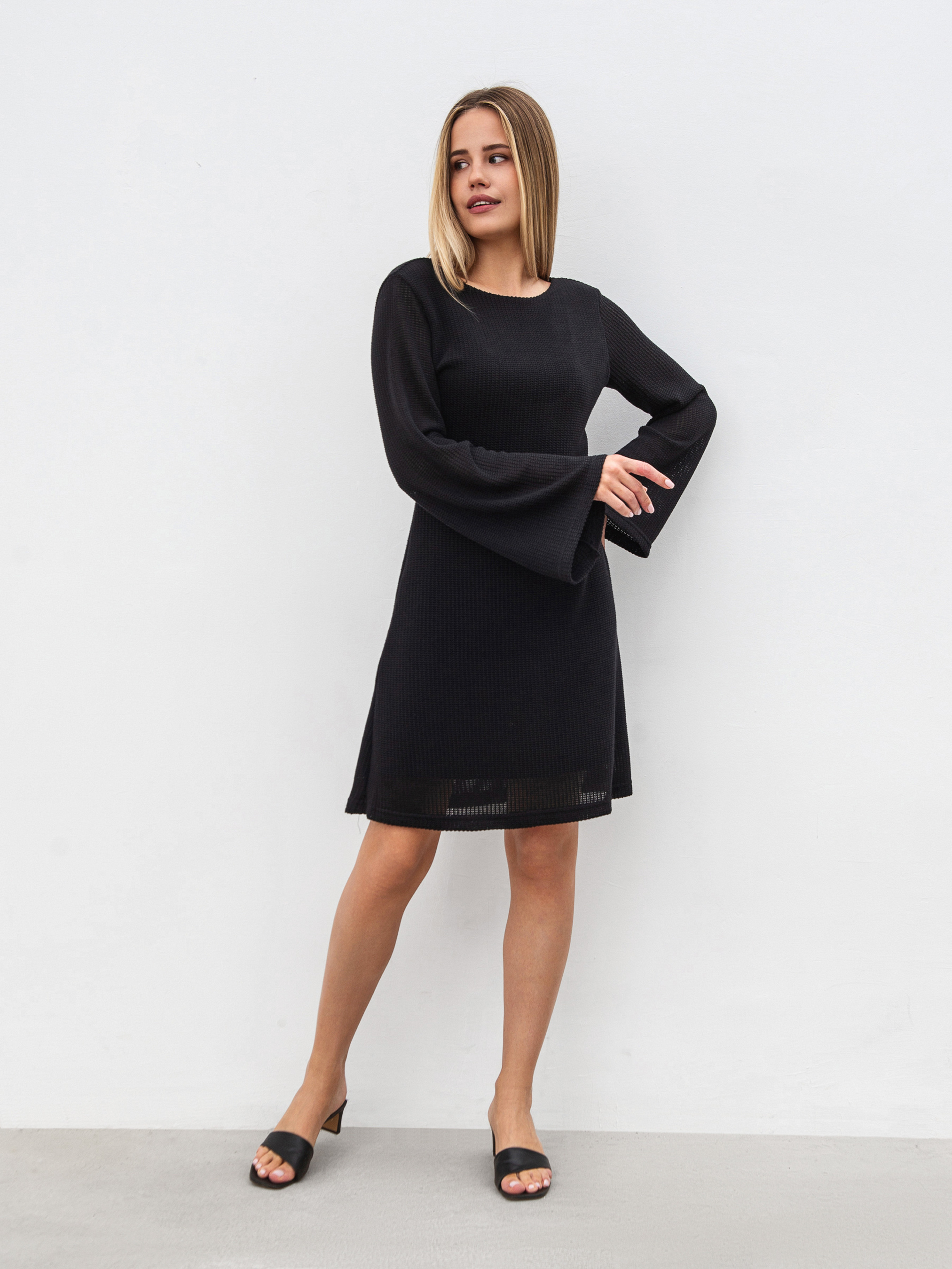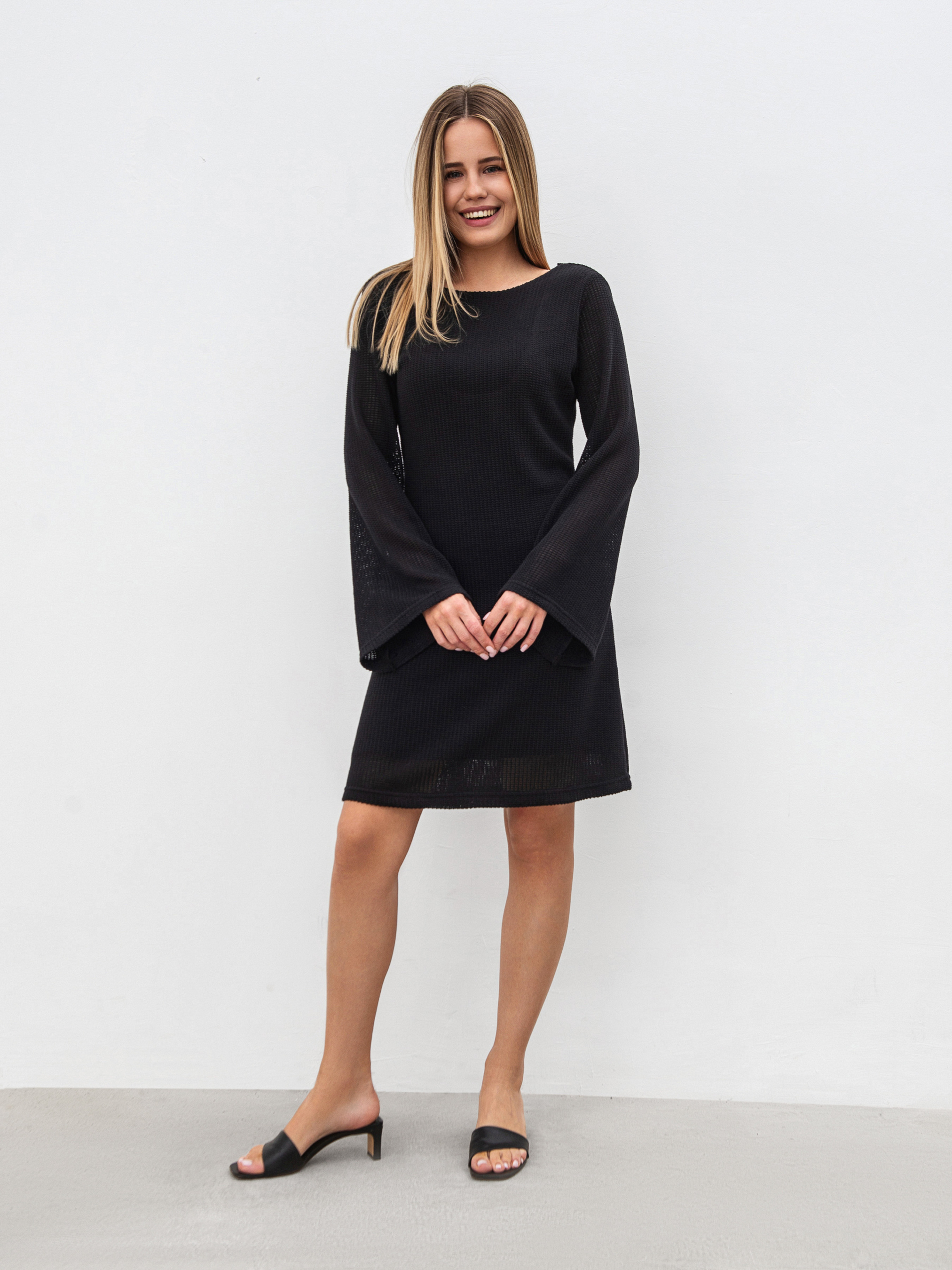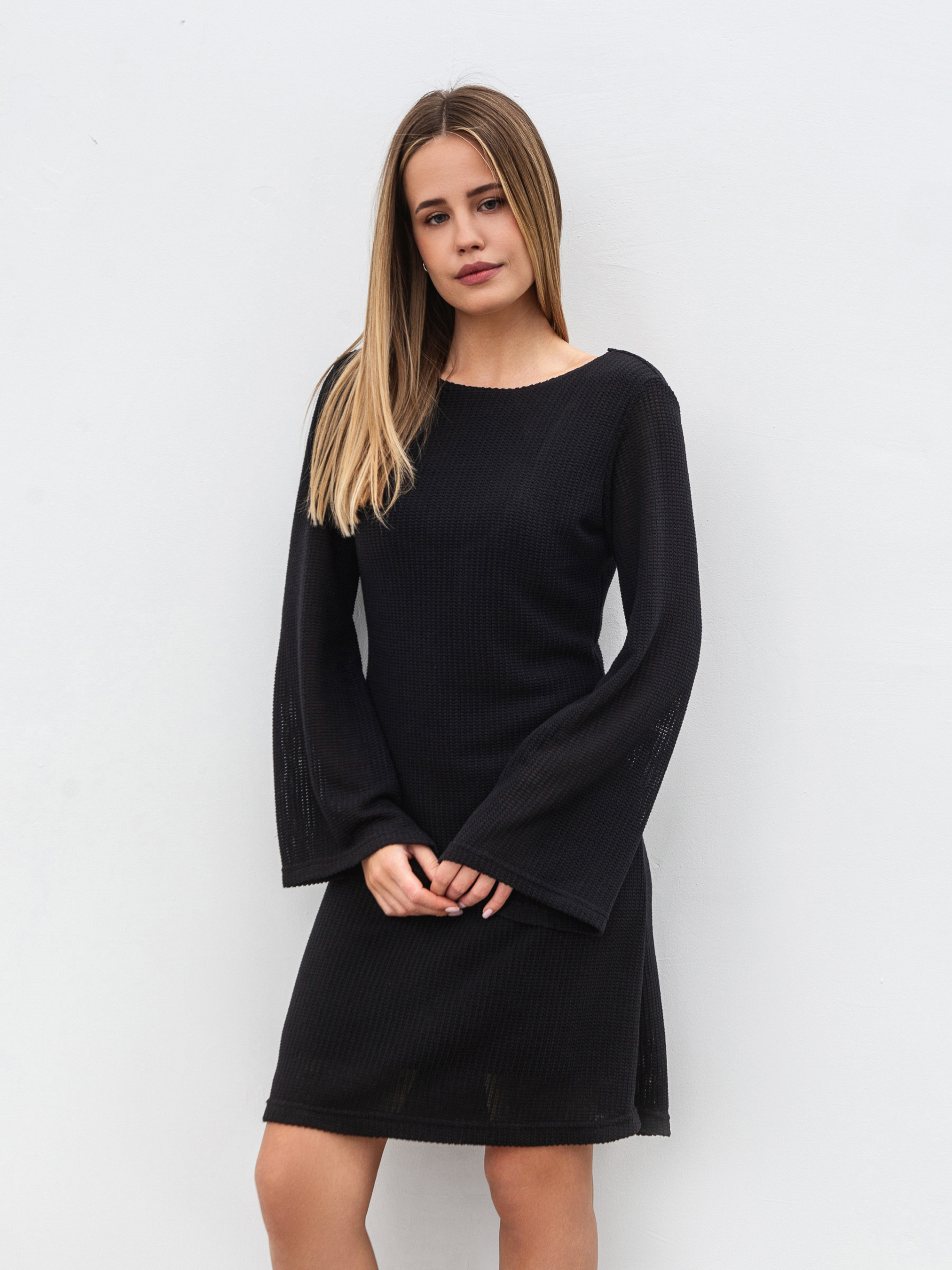 Платье со свободными рукавами длины мини. Приятный мягкий материал - полупрозрачная вязка с дополнительной пришитой трикотажной подкладкой. На спинке есть углубленный вырез. Платье свободно сидит на теле и комфортно ощущается на коже. Основная ткань состоит из 60% вискозы и 40% хлопка. Летний вариант на каждый день. Дополнять луки с этим платьем можно различными украшениями, обувью. Стилизовать можно с рубашками, пиджаками и тому подобное. ХС-С Длина по спине: 80 см Длина рукава: 60 см Полуобхват груди: 41 см Полуобхват бедер: 44 см Плечи: 36 см Полуобхват талии: 35 см С-М Длина по спине: 82 см Длина рукава: 61 см Полуобхват груди: 44 см Полуобхват бедер: 45 см Плечи: 37 см Полуобхват талии: 37 см М-Л Длина по спине: 87 см Длина рукава: 62 см Полуобхват груди: 45 см Полуобхват бедер: 47 см Плечи: 38 см Полуобхват талии: 42 см